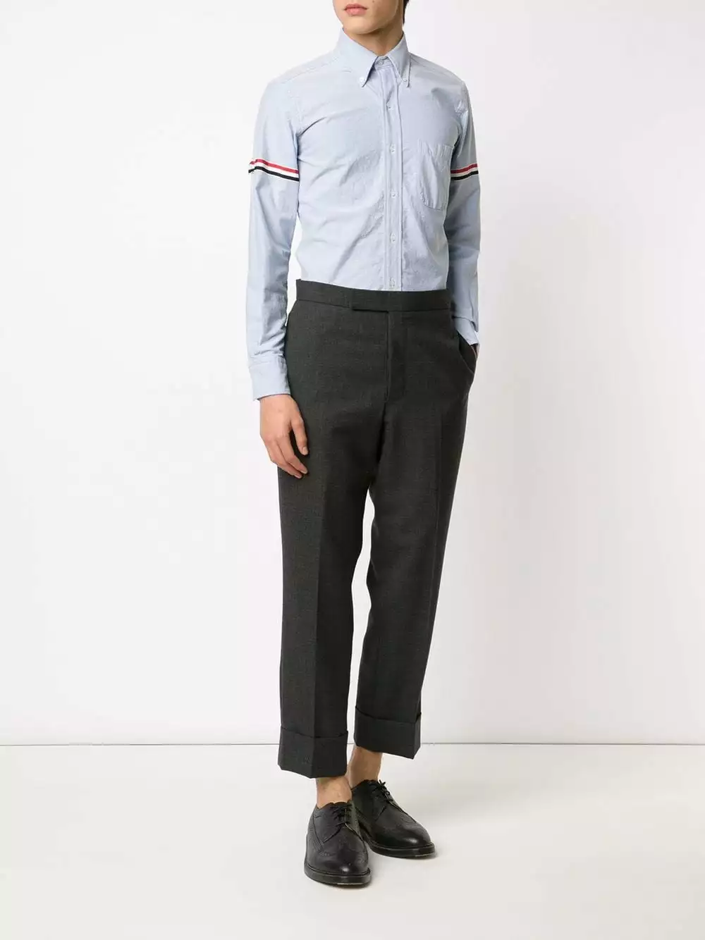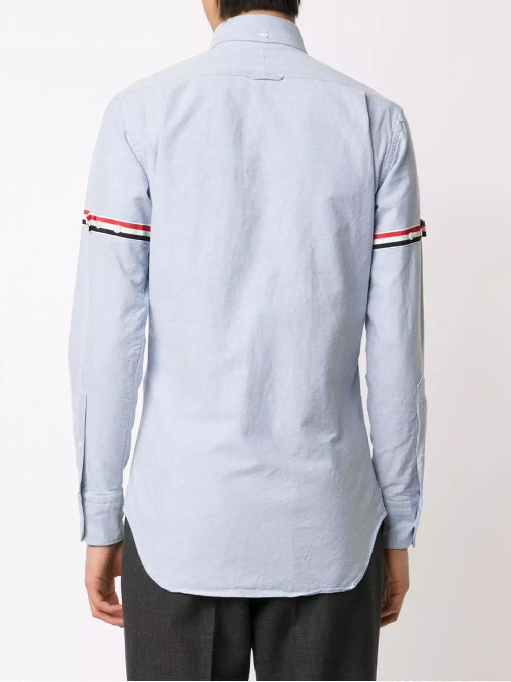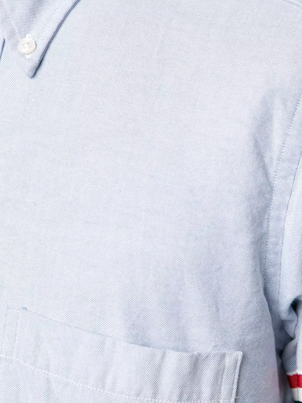 Light blue cotton Grosgrain Armband Oxford Shirt from Thom Browne featuring a button down collar, long sleeves, a front button fastening and button cuffs.