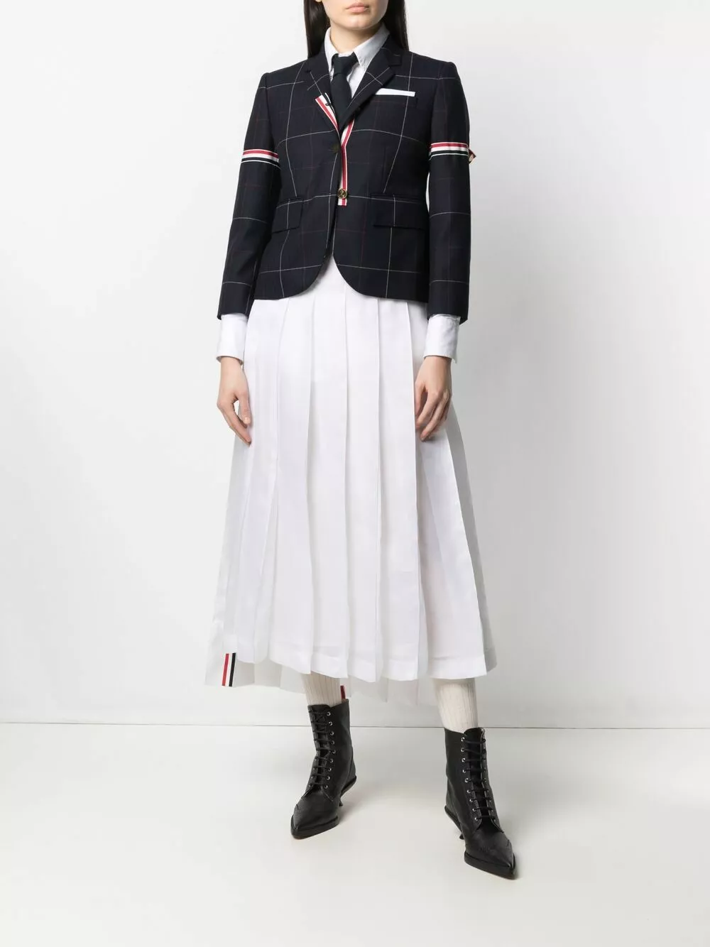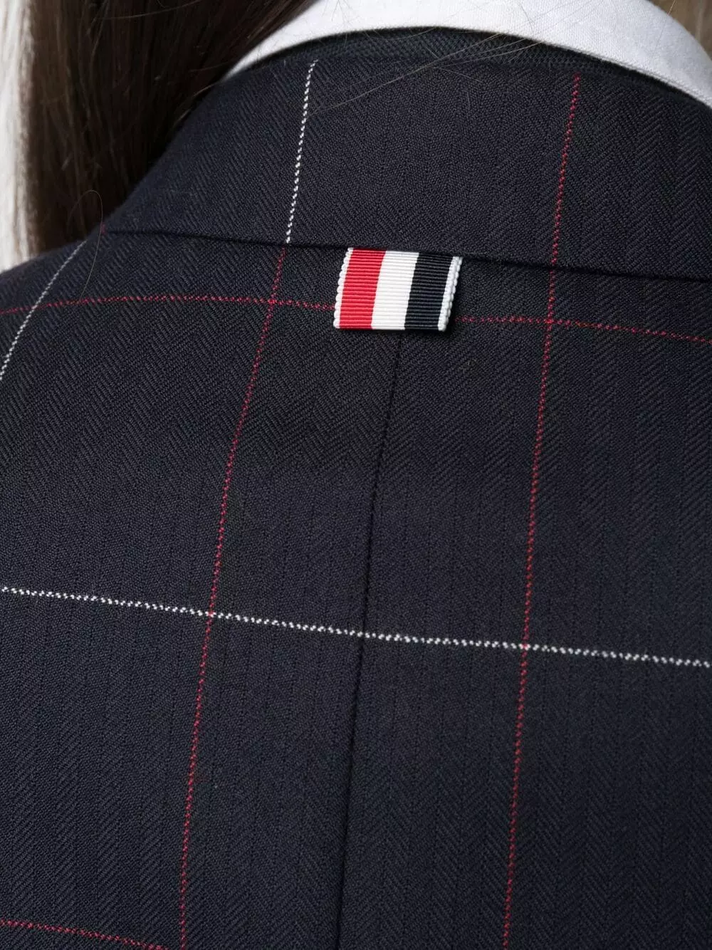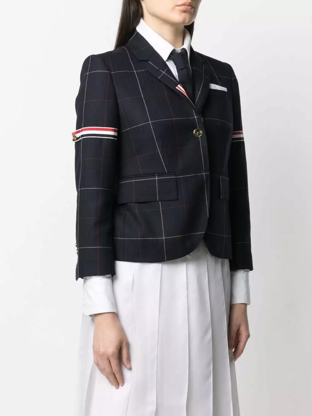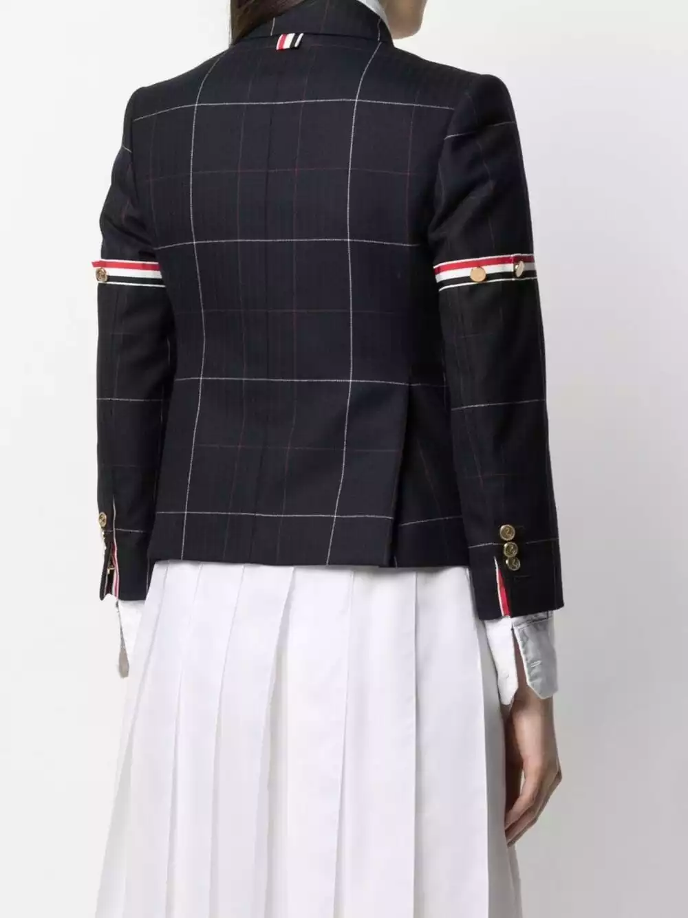 Thinking about tailoring your wardrobe in a different direction? How about trying out some American preppy charm with Thom Browne’s grosgrain armbands blazer jacket. Punctuated with gold-tone buttons and a check pattern, this suits you very well.