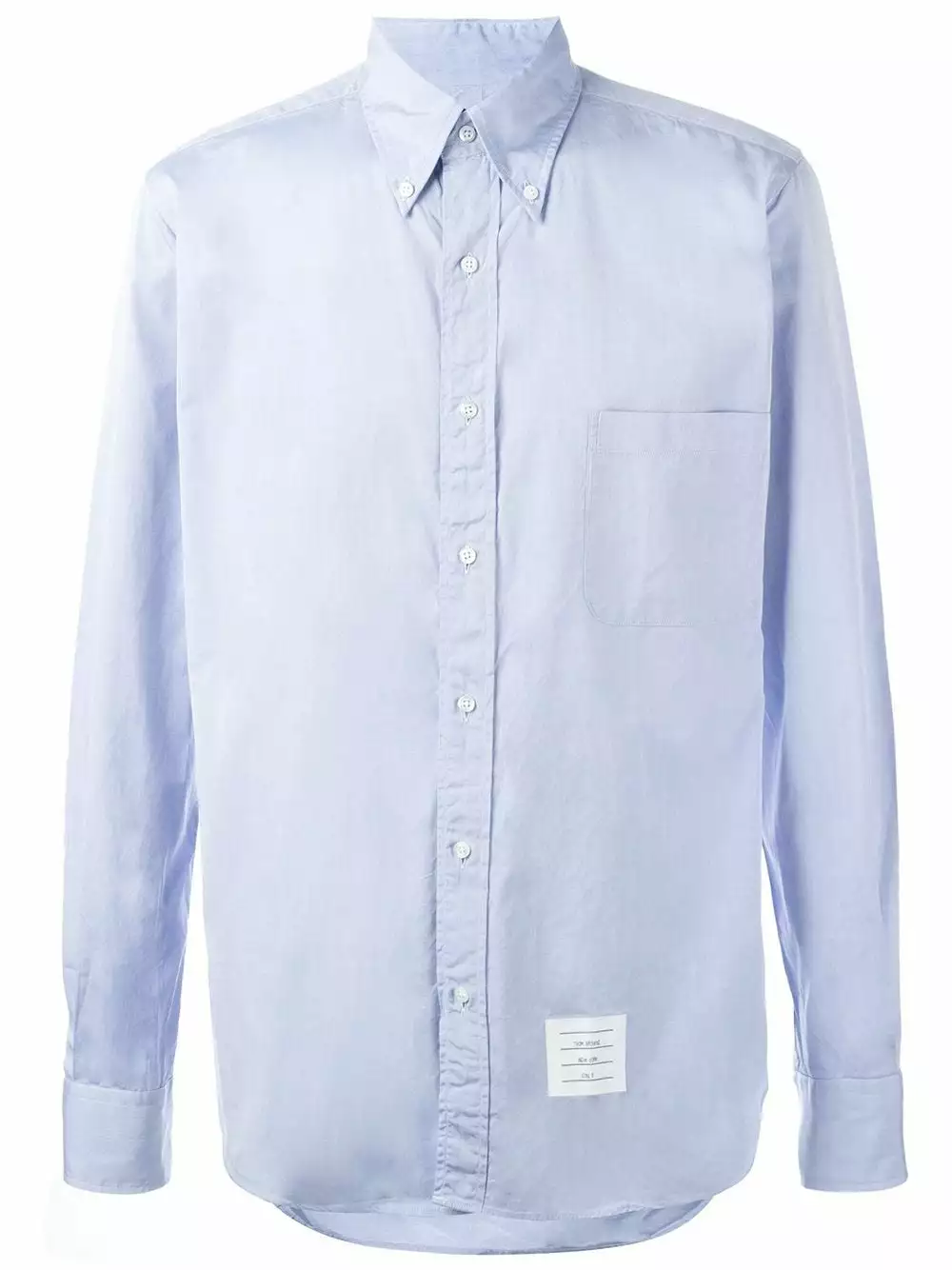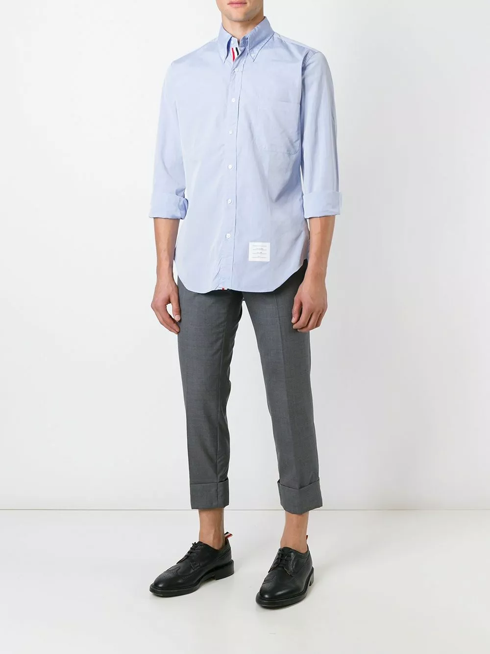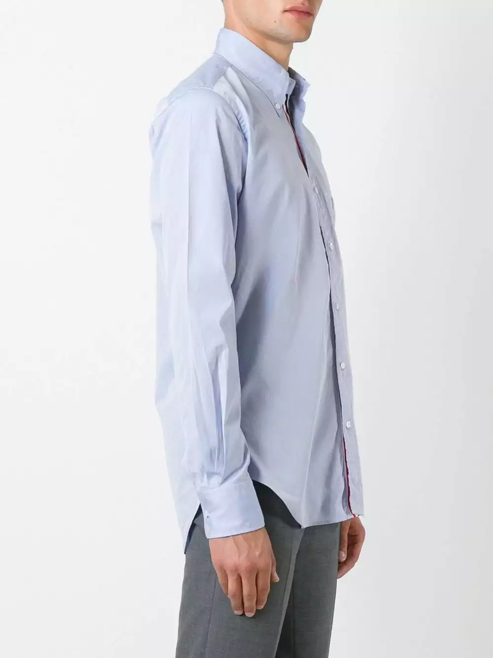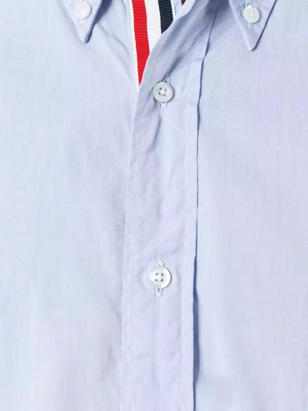 Light blue cotton grosgrain placket shirt from Thom Browne featuring a button down collar, a front button fastening, a chest pocket, long sleeves, button cuffs, a front logo plaque, a slim fit, a curved hemline and a signature tri-colour striped grosgrain trim.