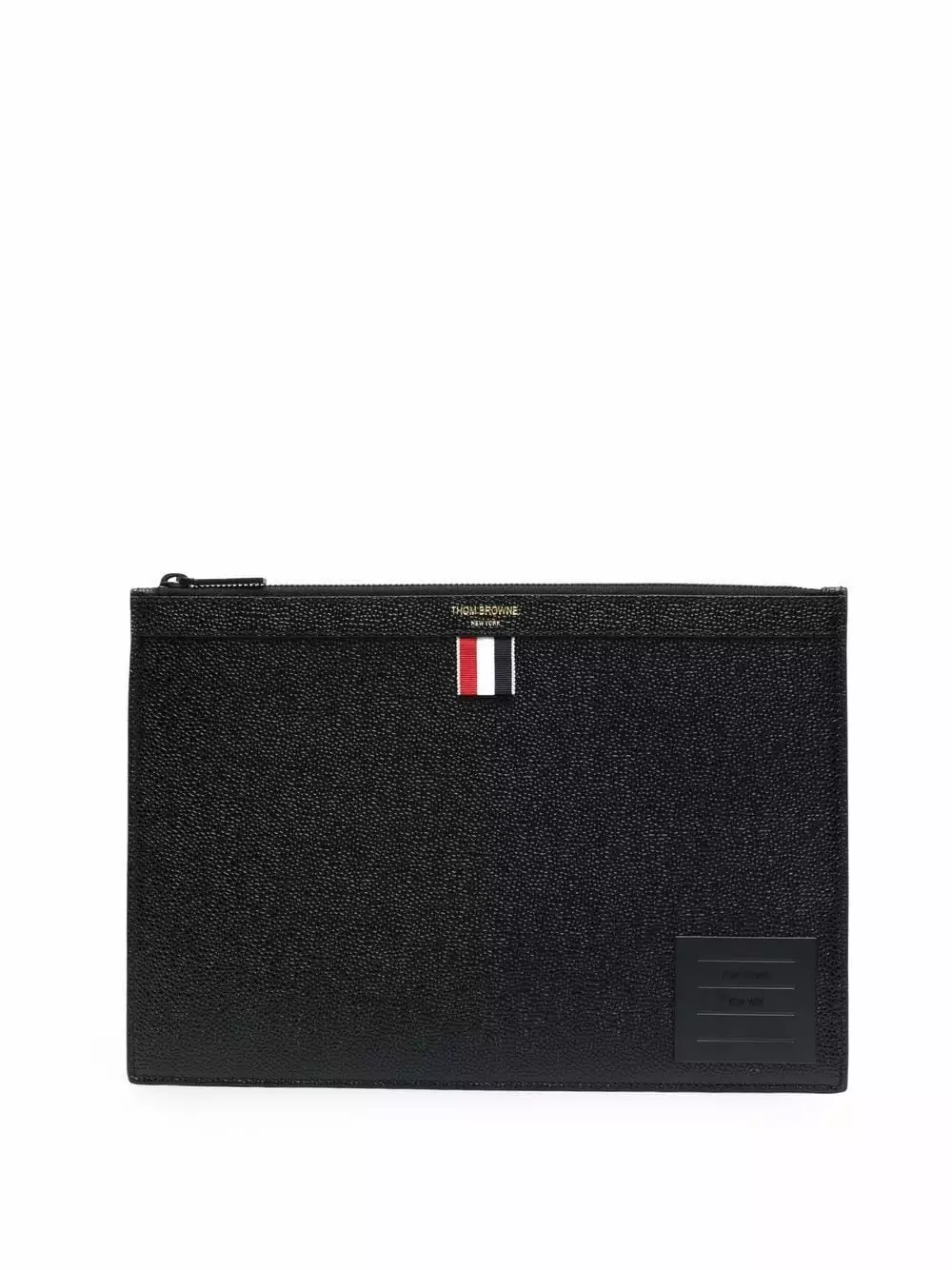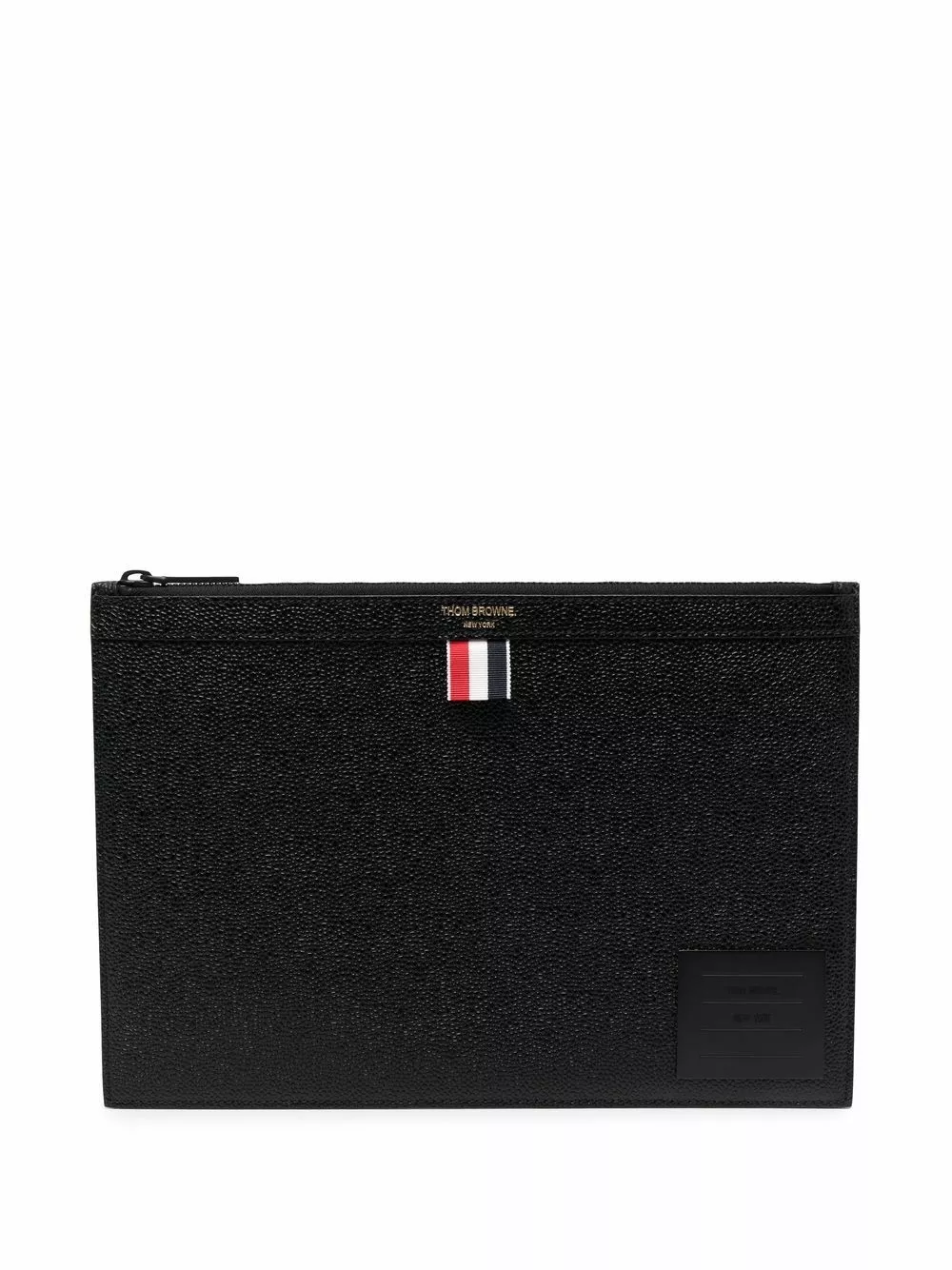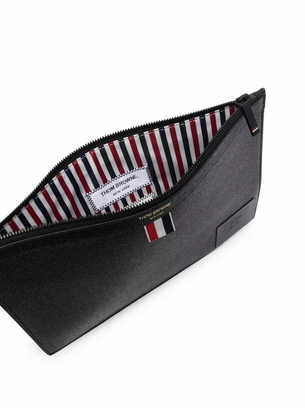 Crafted from grainy leather as a testament to Thom Browne’s expert craftsmanship, this clutch bag is adorned with the iconic grosgrain loop tab and its interior is covered with the unmistakable RWB-stripe.