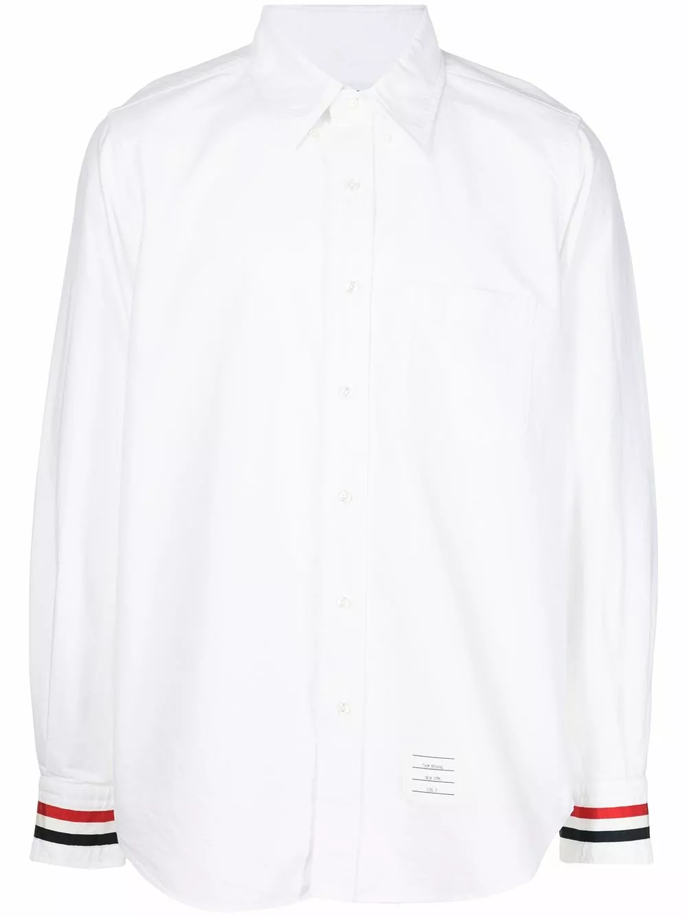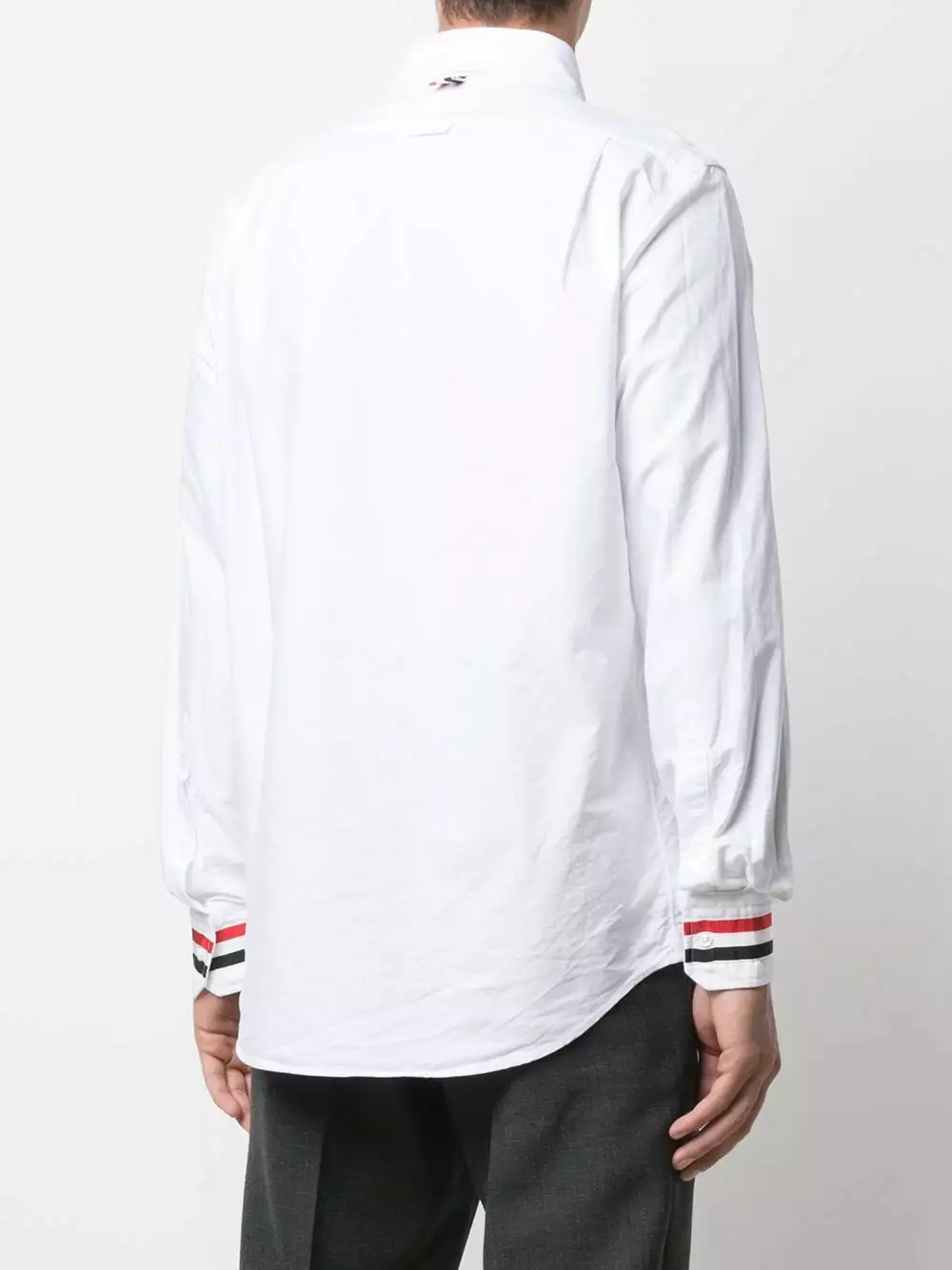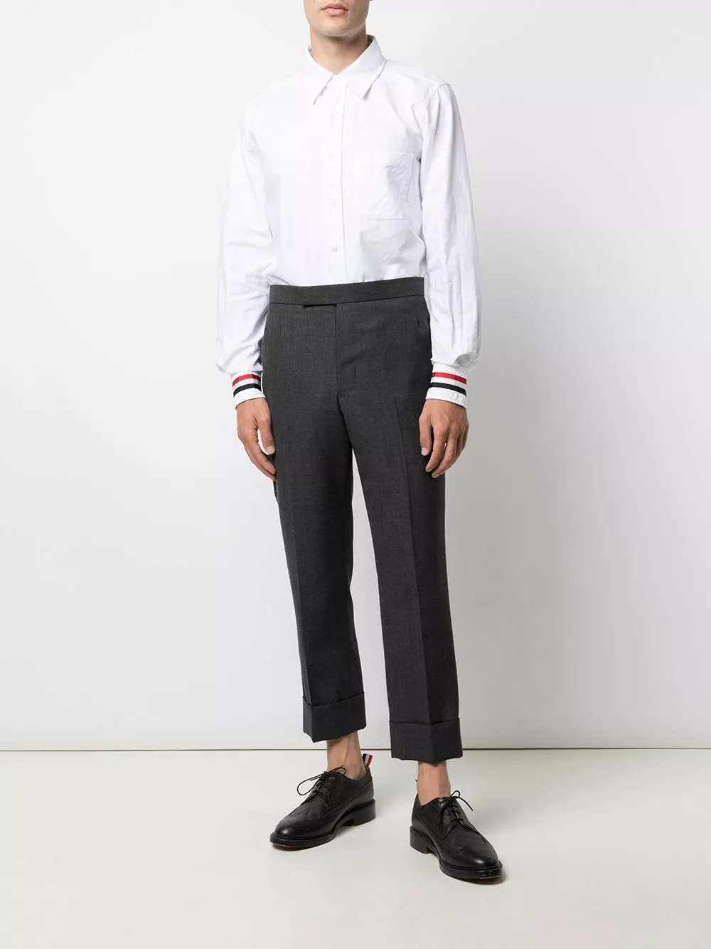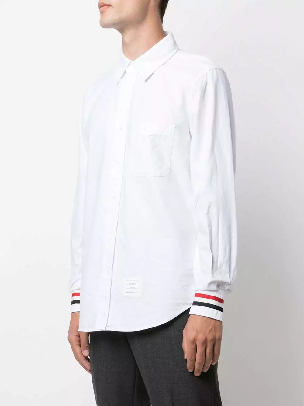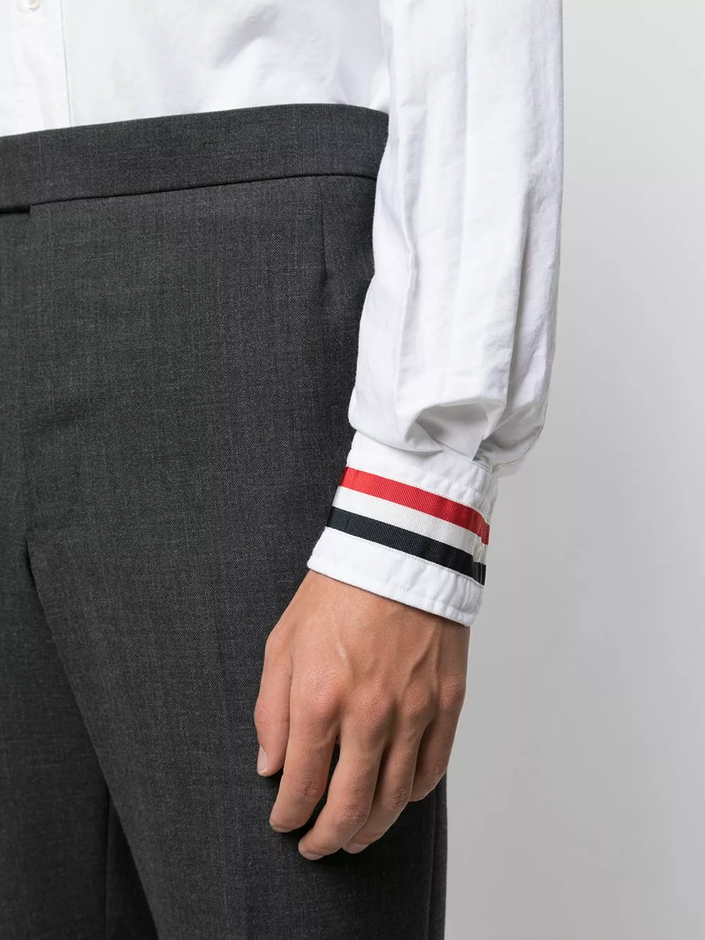 Featuring Thom Browne’s signature detailing of the RWB stripe at the cuffs of this shirt, it creates an instantly recognisable design. Such elements as these create a balance between technical tailoring and design flair which fulfill the brand’s aim of creating ‘a new expression of the suit’.