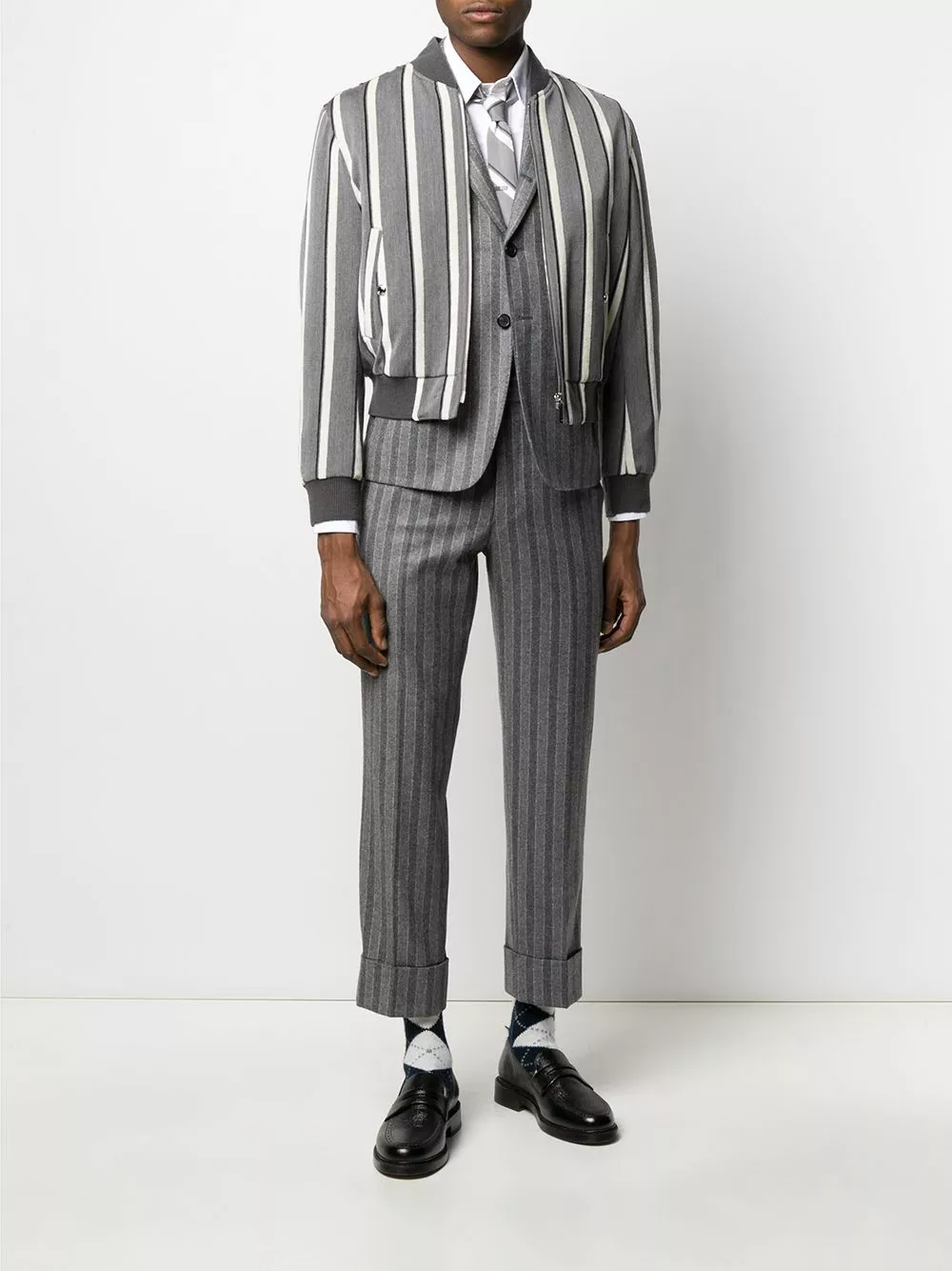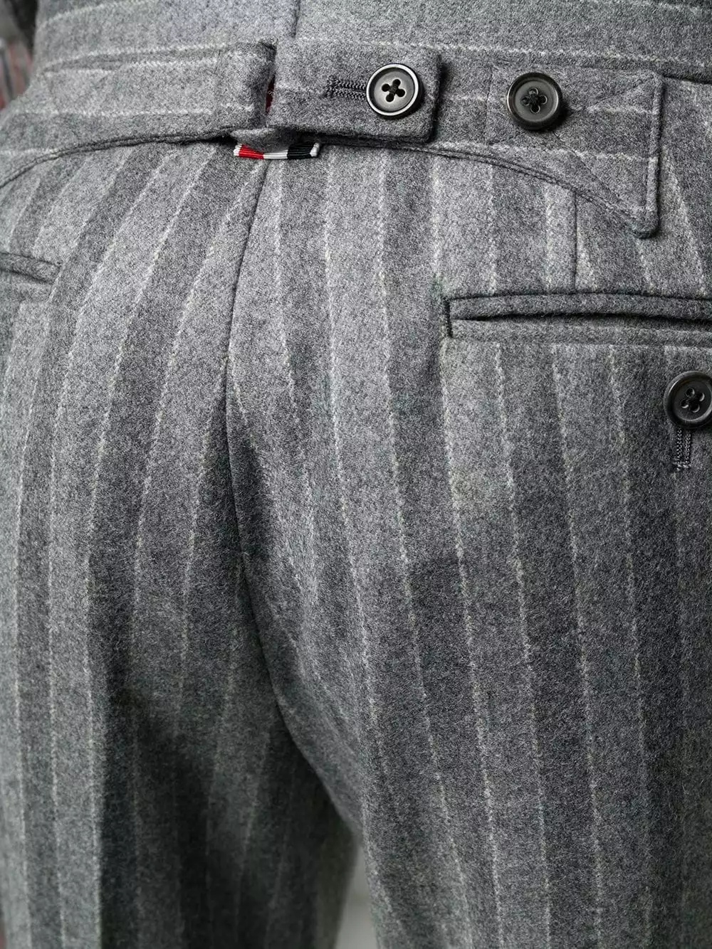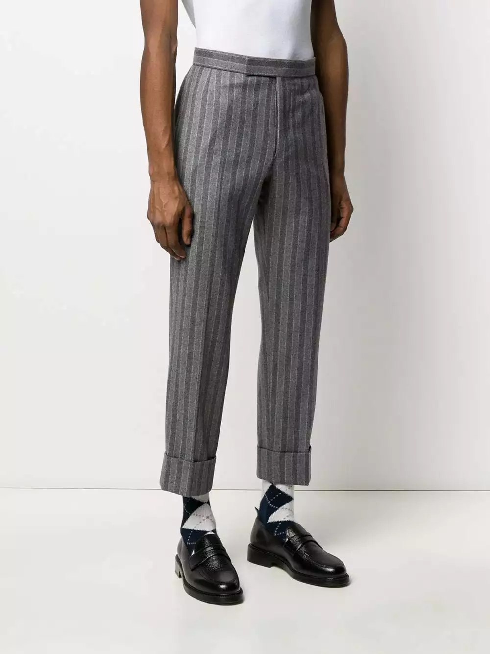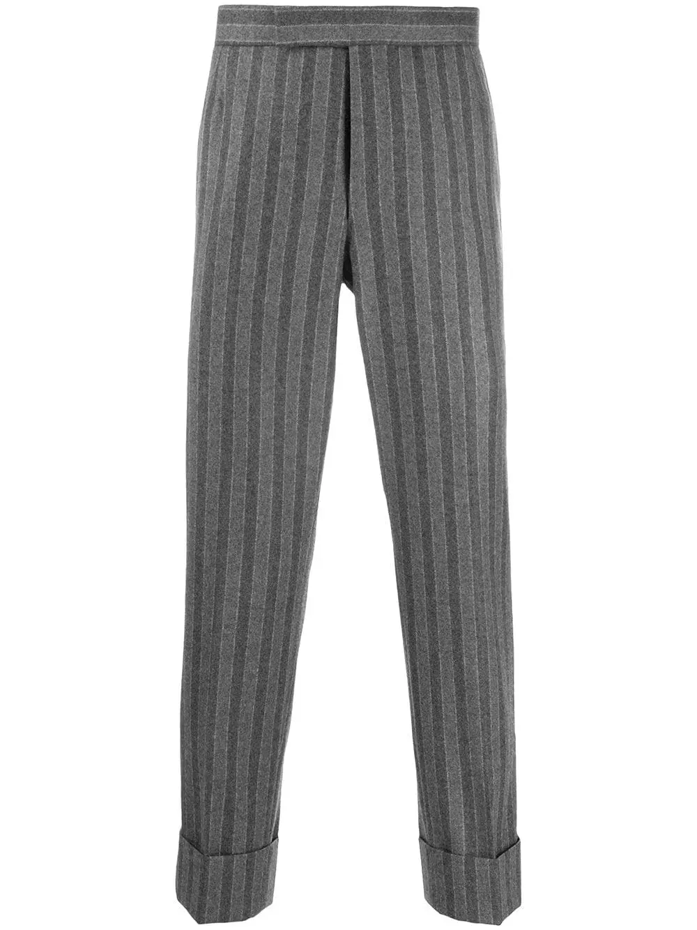Thom Browne invites us to believe the stripe hype with these chalk-stripe cropped trousers. Made from wool flannel, these straight-legged pair have been designed with turn-up hems and a buttoned strap to the back. There’s smart, there’s casual, and then there’s Thom Browne.
