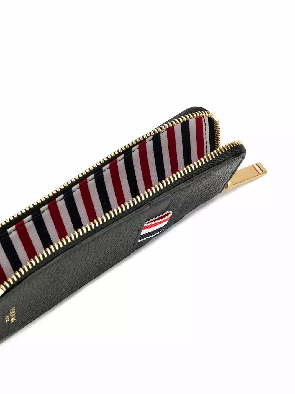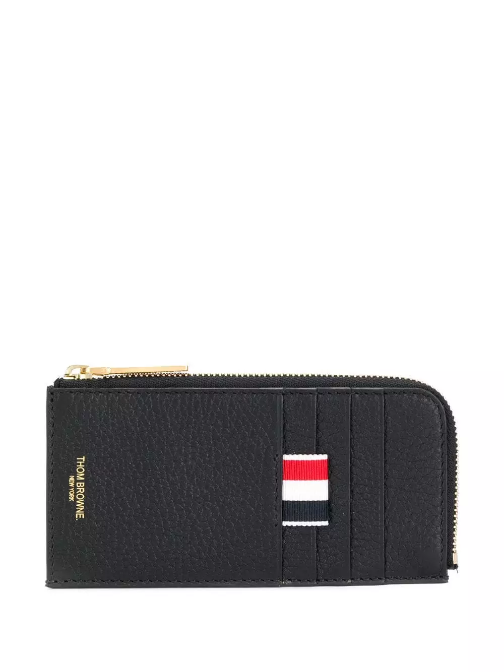 Carry your cards in style. This pebbled Thom Browne wallet will make your day every time you pull it out of your bag. With its signature tab and soft pebbled leather how could it not? Featuring gold-tone hardware, a pebbled leather texture, a front embossed logo stamp, a zip fastening, multiple card slots and a signature grosgrain loop tab. This item comes from our partner boutiques in a variety of countries and cannot be shipped outside its region (either EU, US, UAE or Japan). Please check the country of origin in the Shipping & Free Returns tab or your Shopping Bag to make sure it can be delivered to your location.