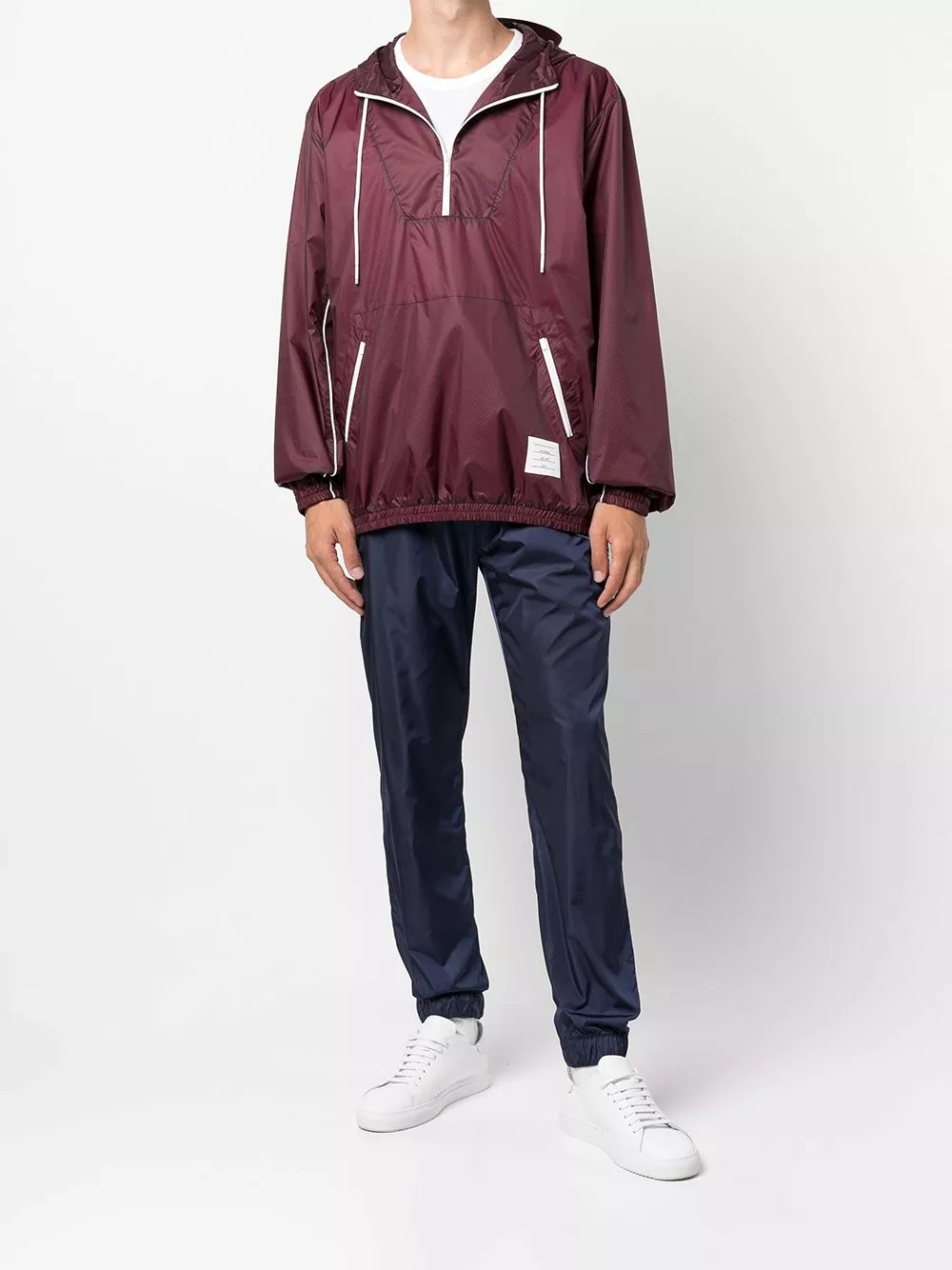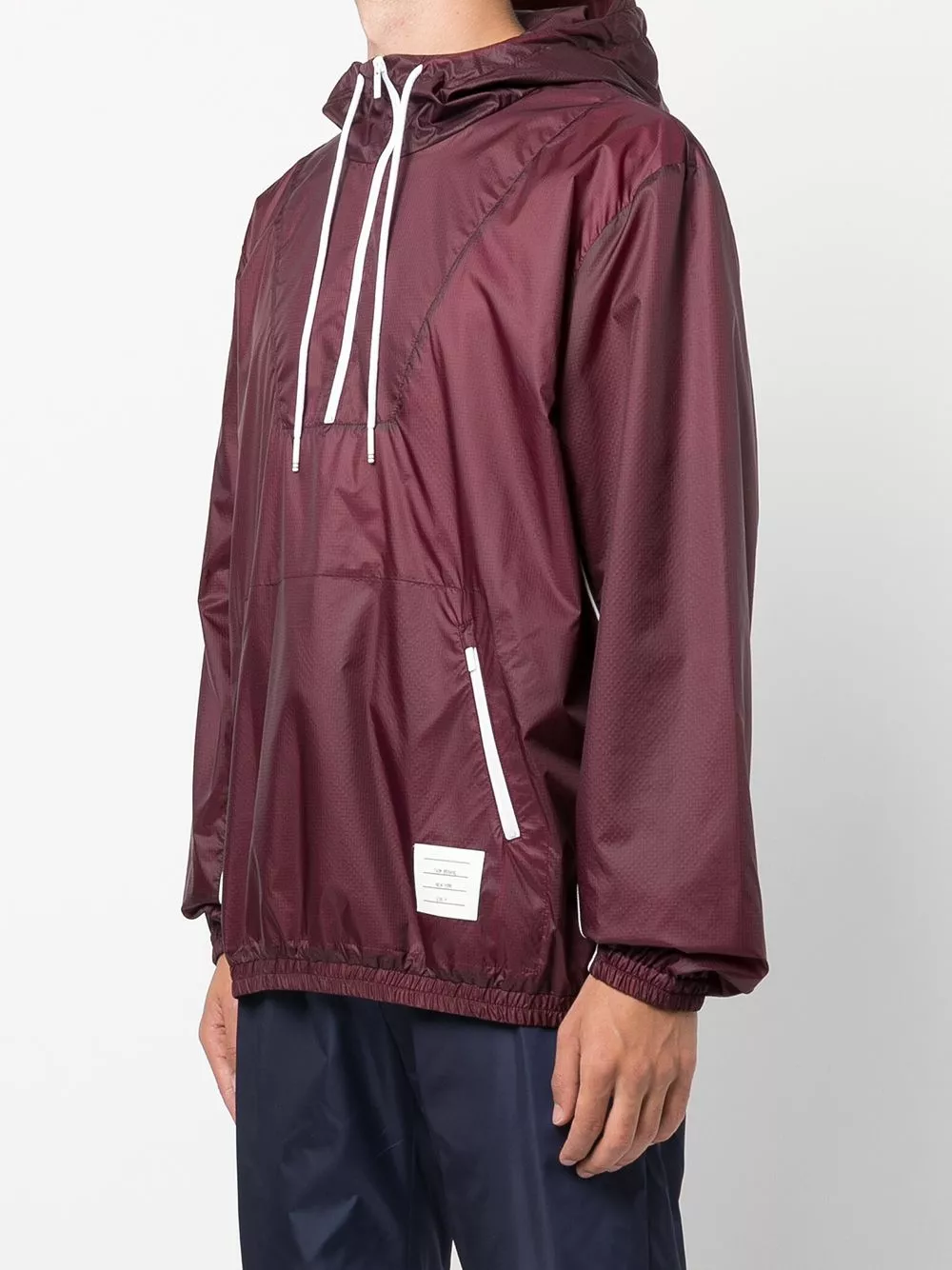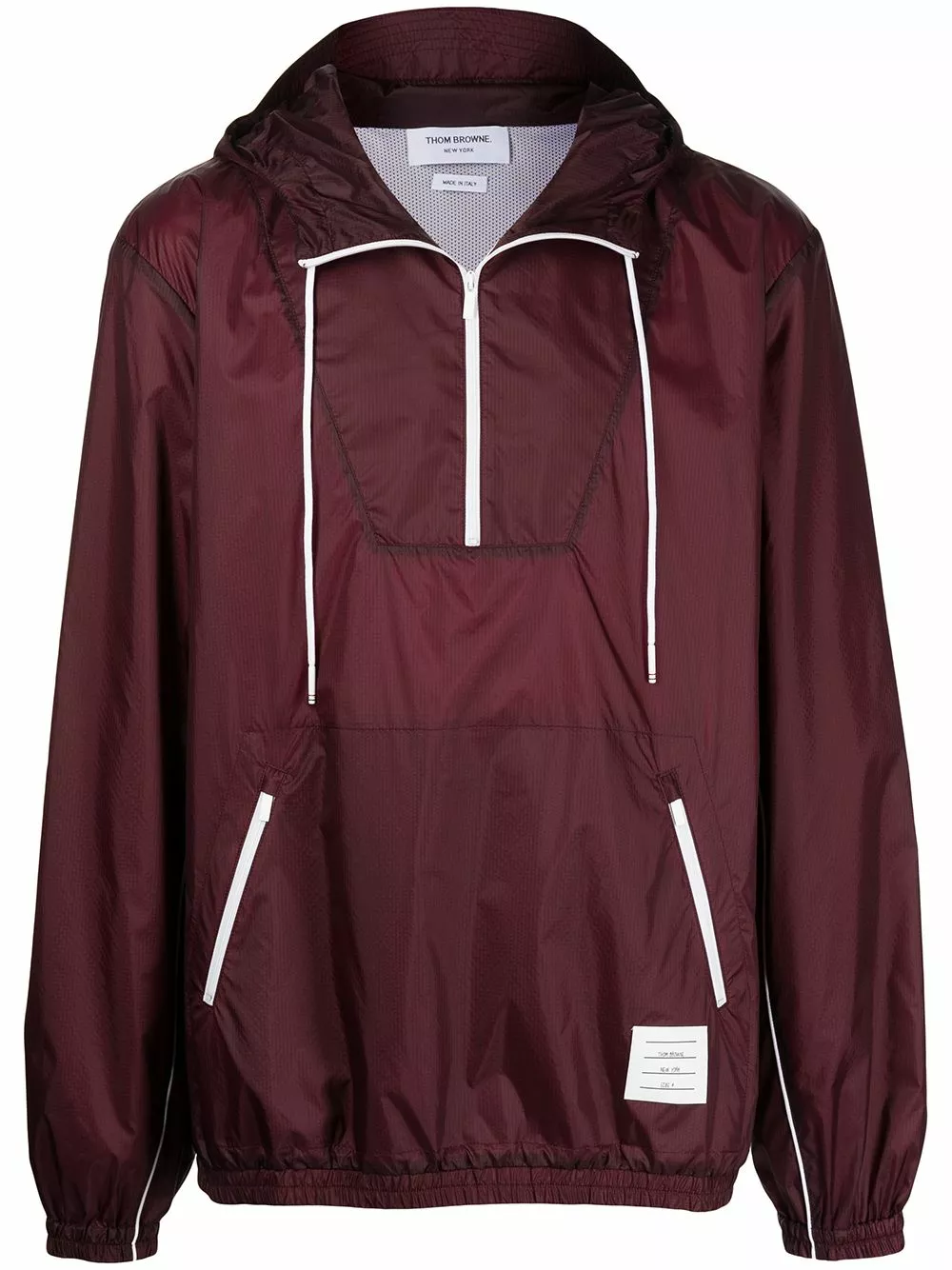 Designed with a detachable hood and a half front zip fastening, this piece from Thom Browne is a true hybrid of style and practicality. In a dark red hue, it features a signature logo patch to the front for a recognisable look.
