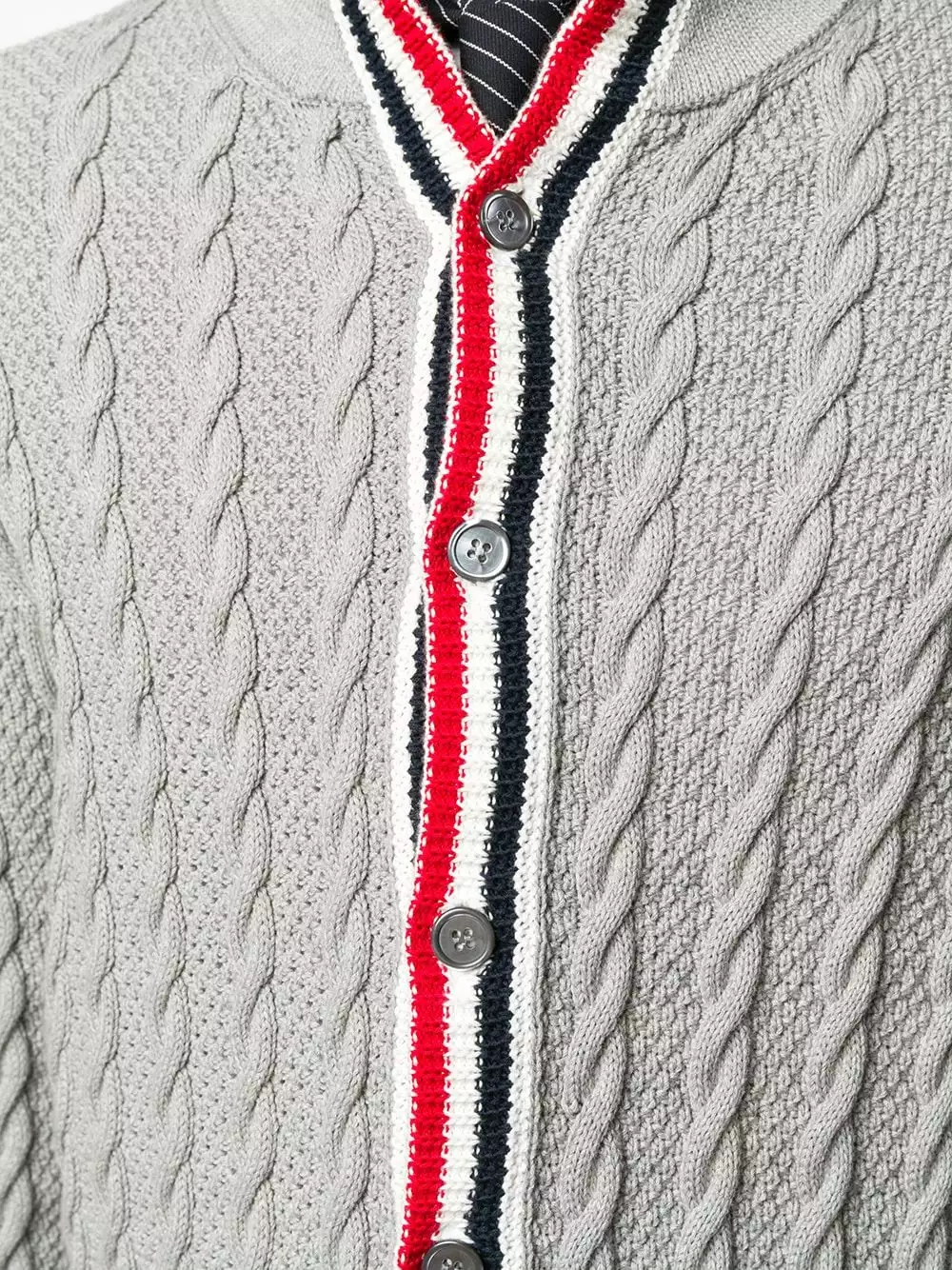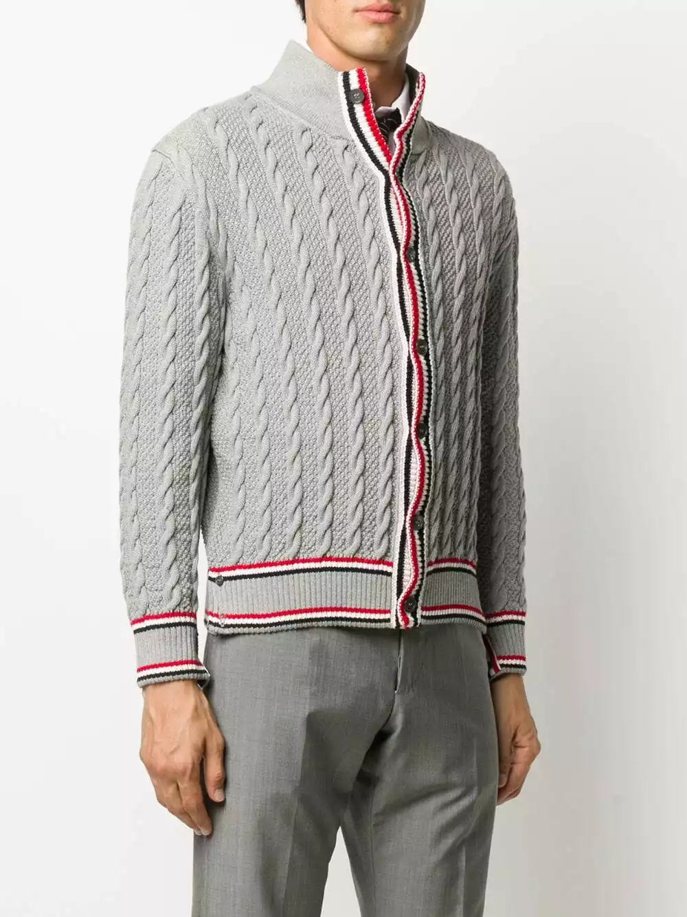 Keep calm in cable knit. Quintessentially cooler days call for this grey Thom Browne cardigan. You’re pushing all the right buttons.