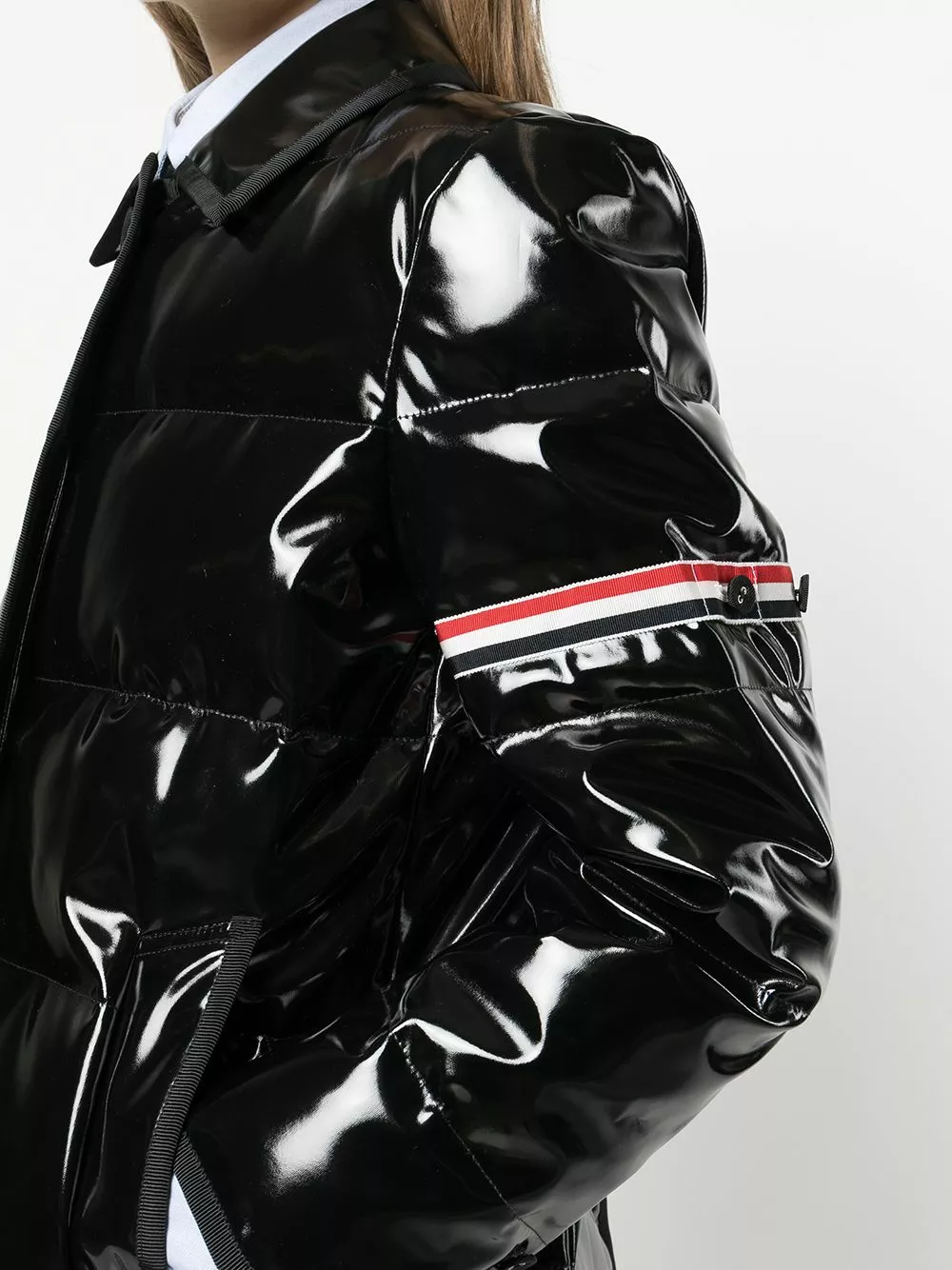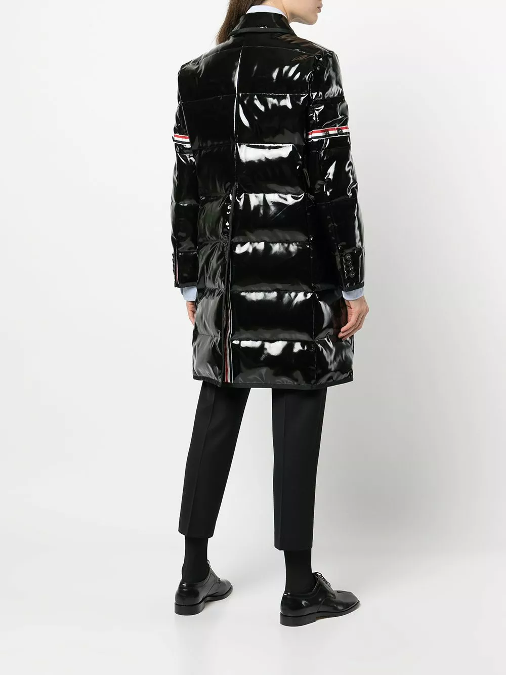 A high-shine finish creates a contemporary look for this Thom Browne coat. This is further enhanced by the piece’s signature RWB-stripe detailing.