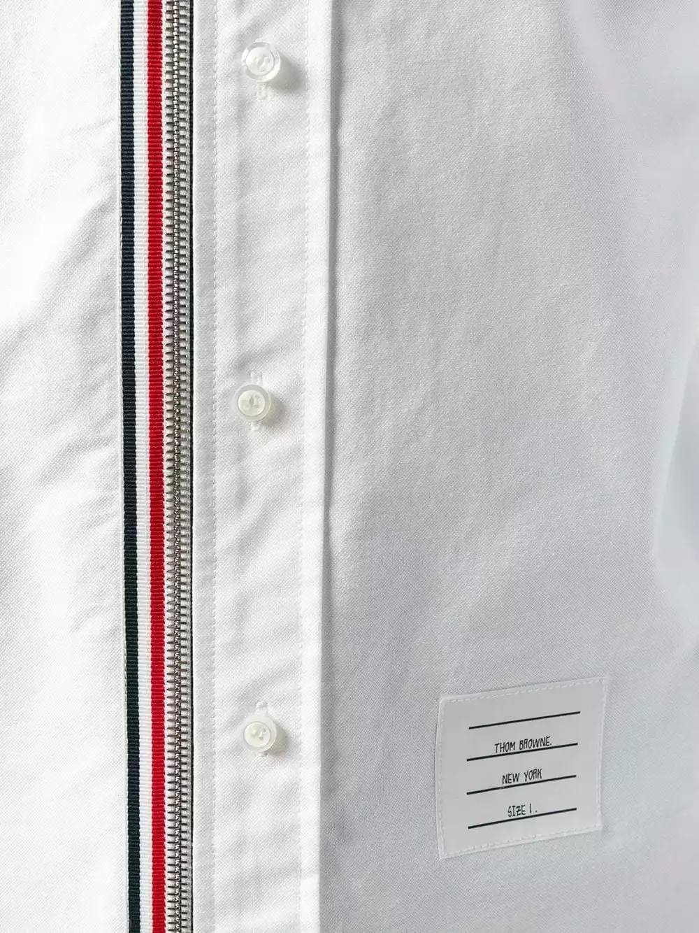 So you suddenly need to go to the office and your outfit is not prepared for it. No big deal. Luckily for you, Thom Browne has created this white zip-Front oxford shirt. You just need to put it on, close it, and BAM… you’re ready to go. Featuring a straight fit, a front button fastening, a side zip detail, a signature tri-colour striped trim, a drawstring hood, long sleeves, button cuffs, a curved hem and a front logo patch.