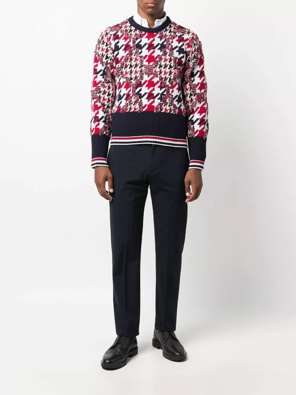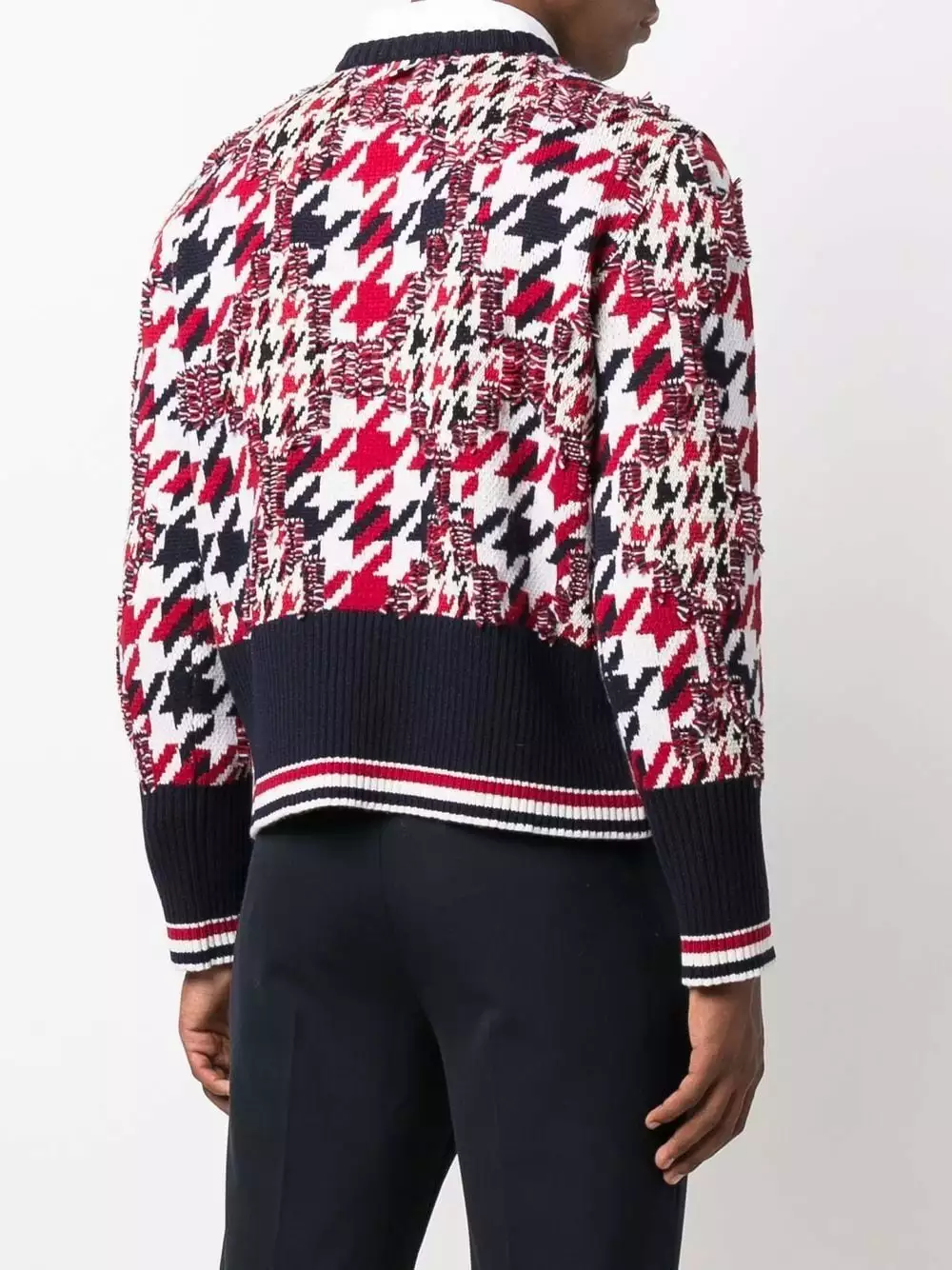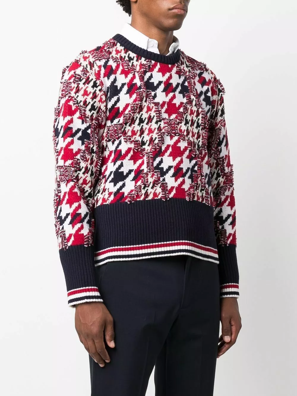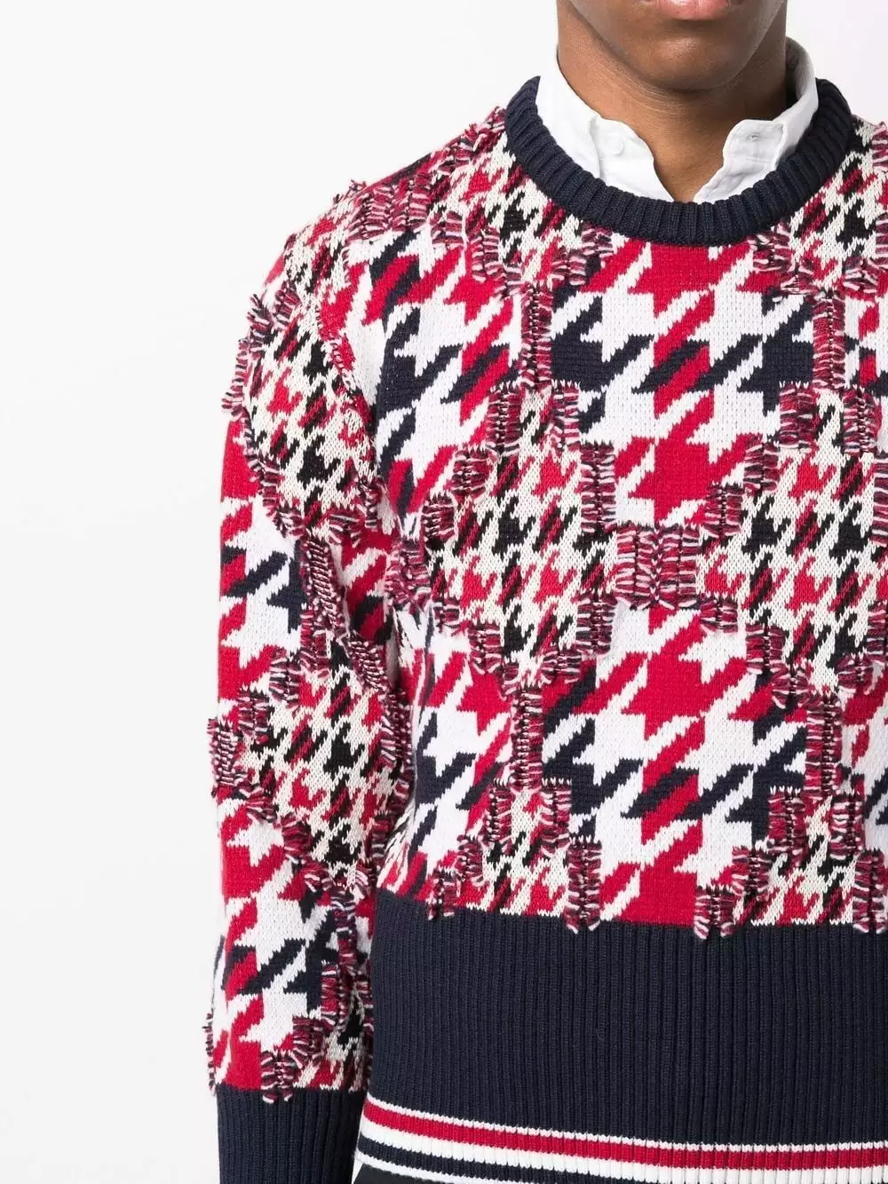 Staying true to its signature house codes, Thom Browne presents this crew-neck jumper. Spun from a blend of wool and cotton, this piece showcases a frayed houndstooth pattern in the same colourway as the label’s signature RWB stripe – red, white and blue.