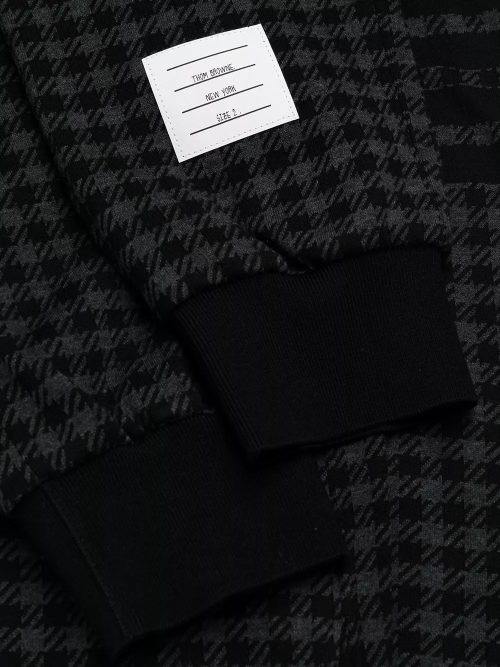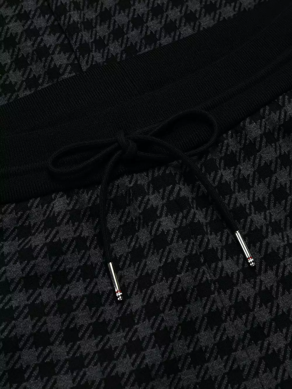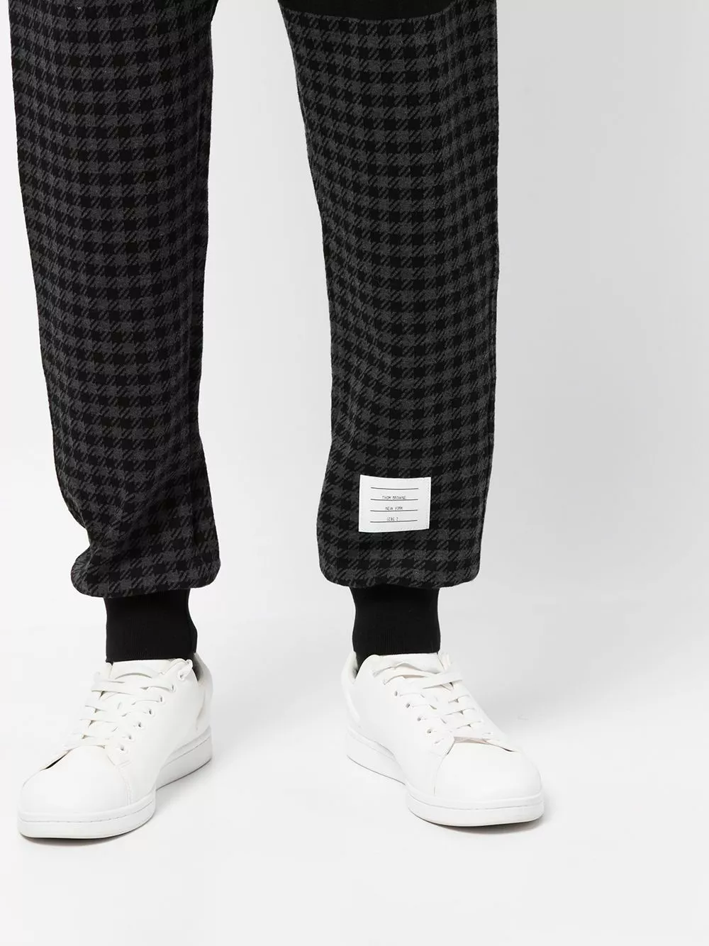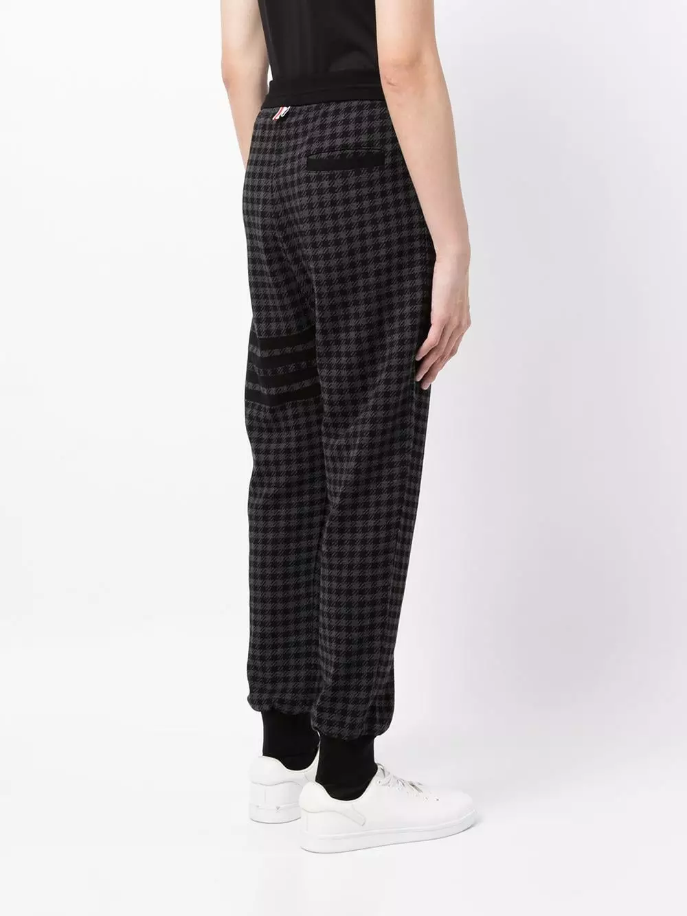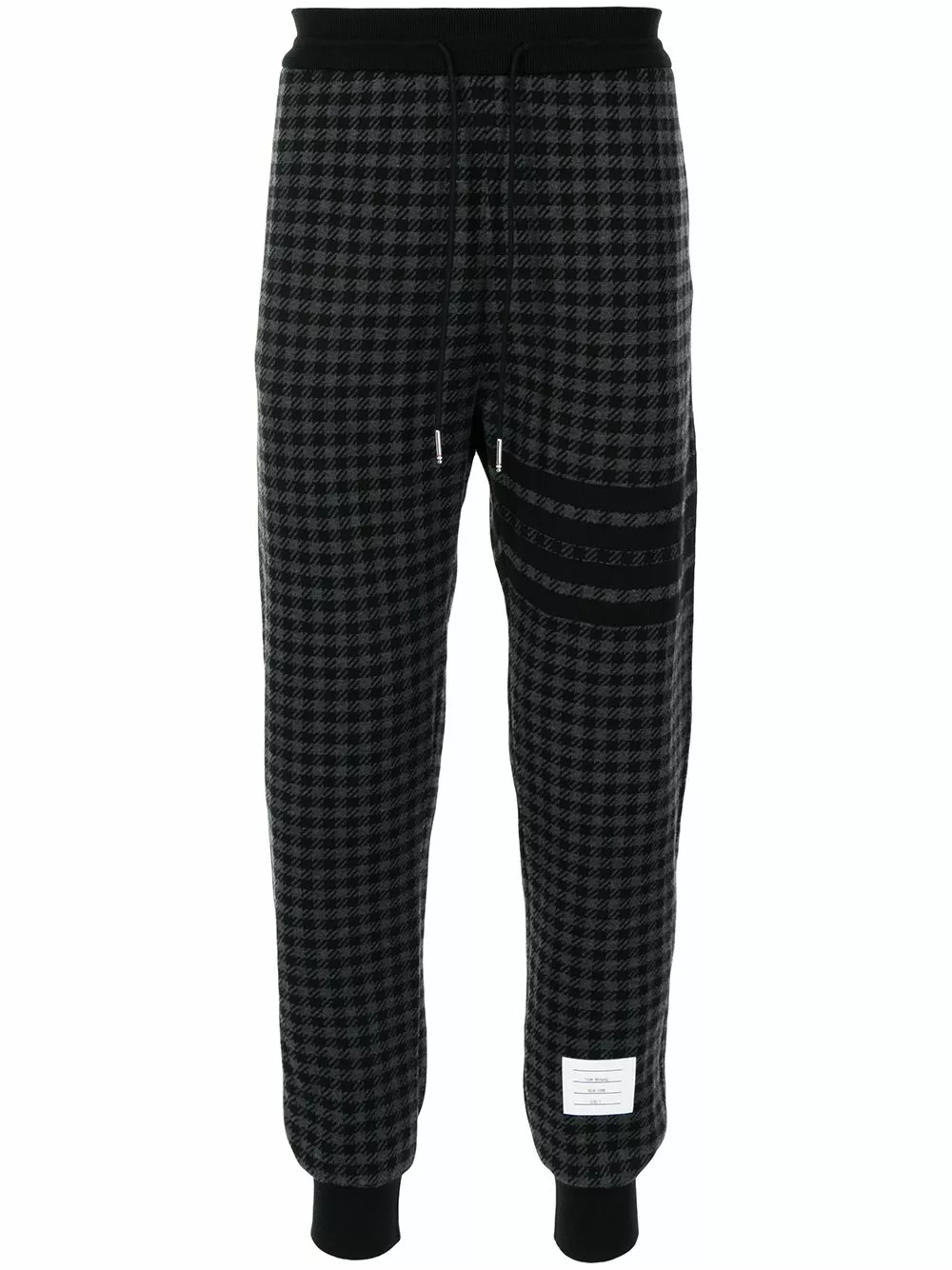 The 4-Bar stripe, name tag and grosgrain loop tab have become synonyms for Thom Browne. Presented in a black and grey hue, these drawstring track pants are detailed with all signatures.