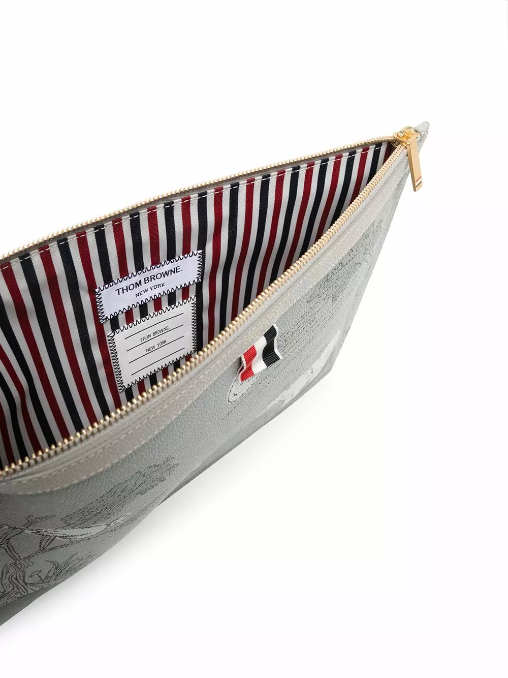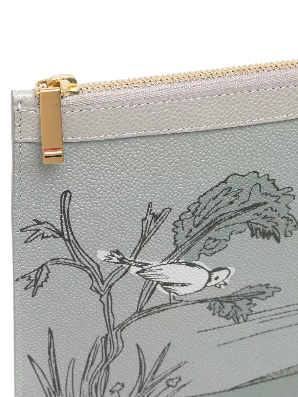 With a lasting tradition of bags with animal motifs, Thom Browne takes inspiration from wildlife to create this clutch. Crafted from calf leather in a grey hue, this clutch bag features a top zip fastening and spacious interior elevated by an illustration print on the outside.Â