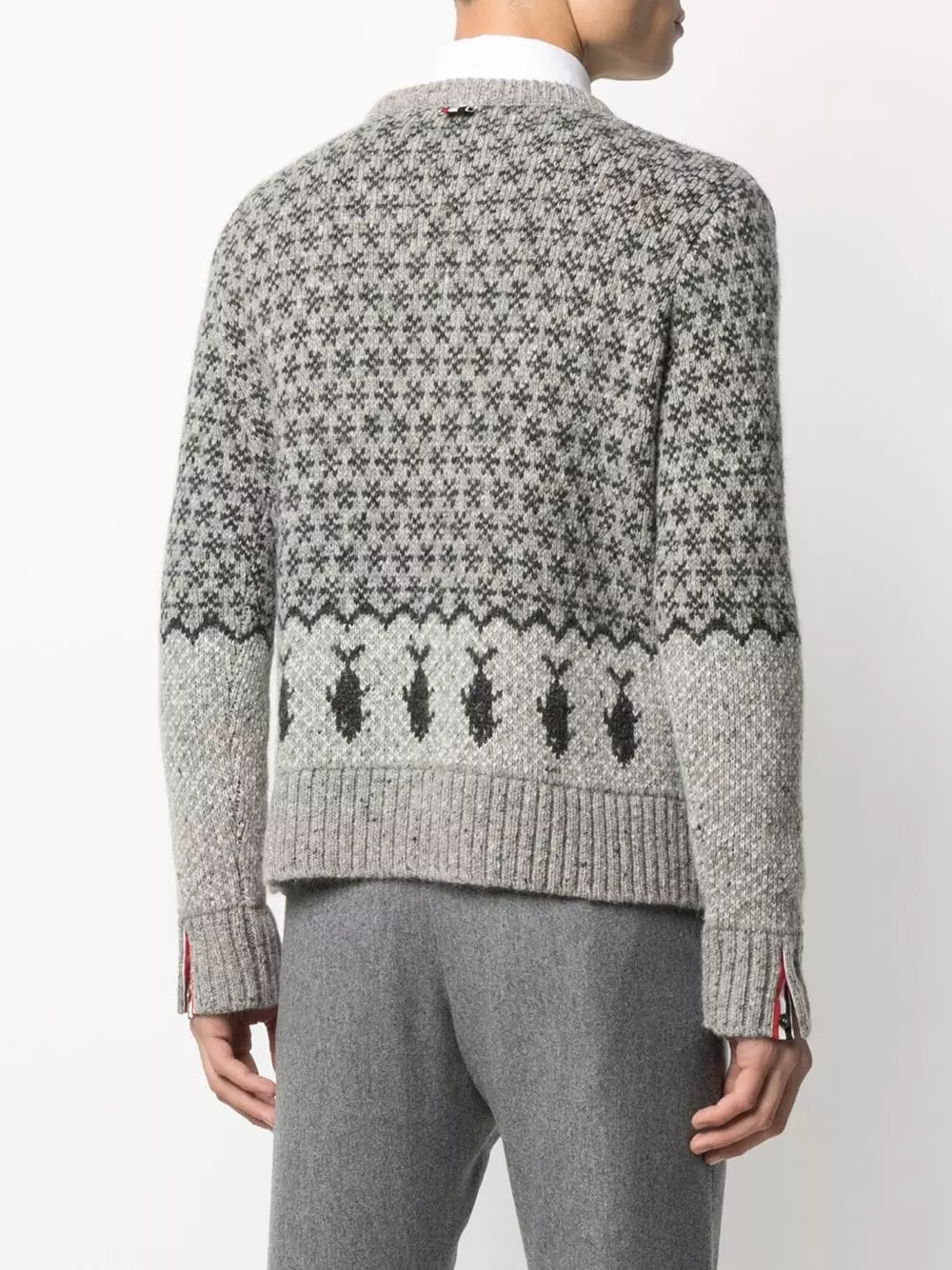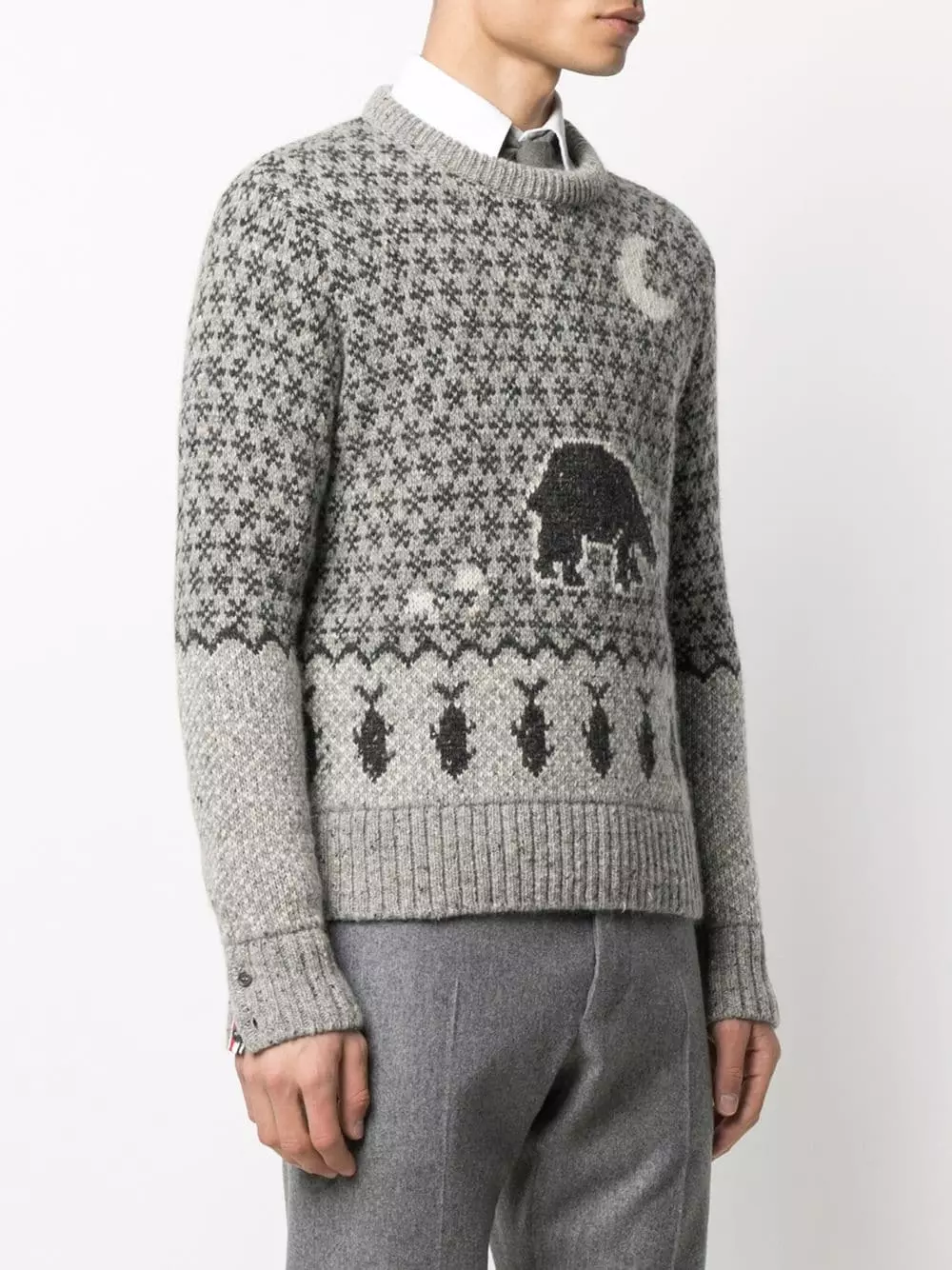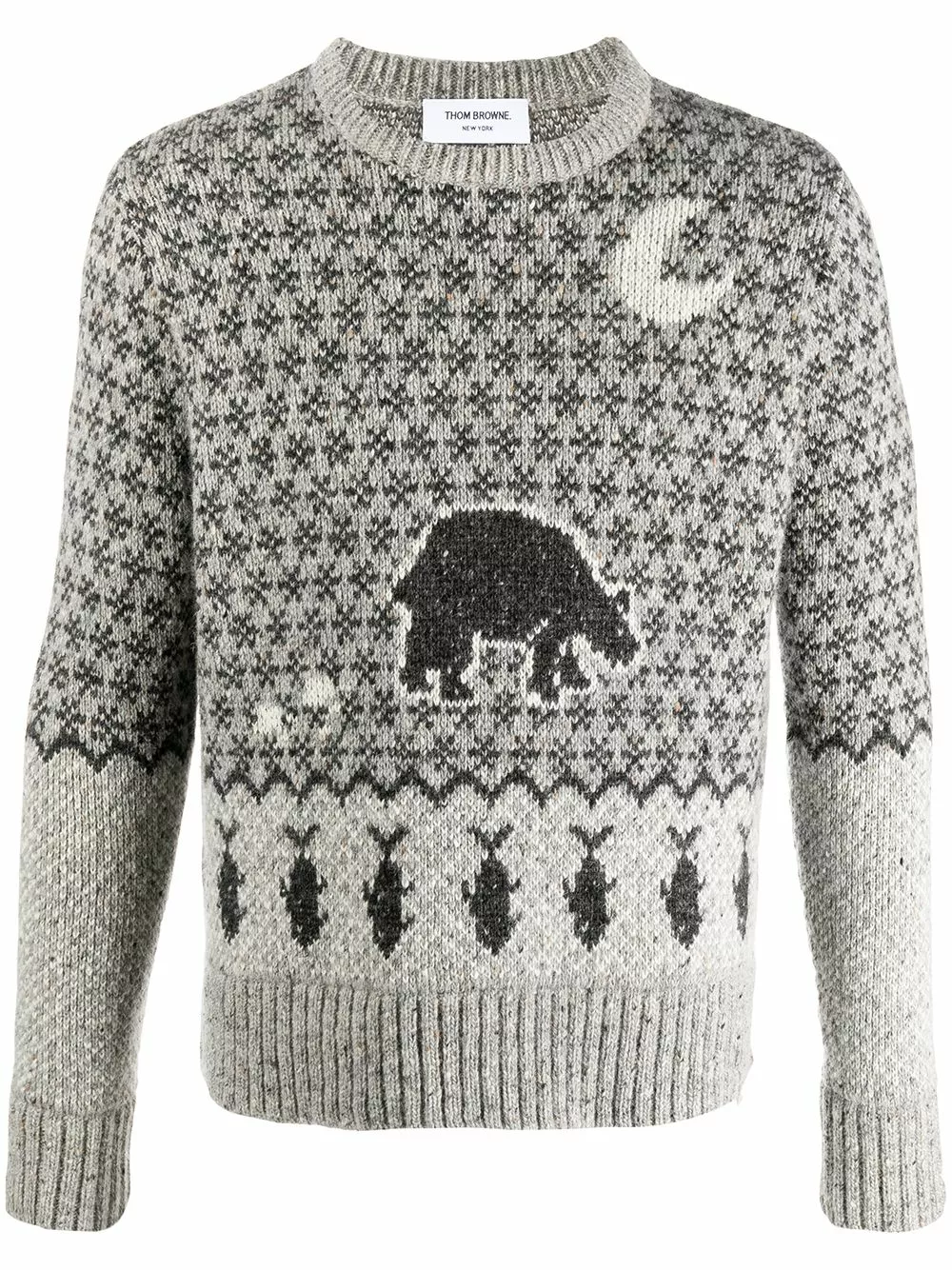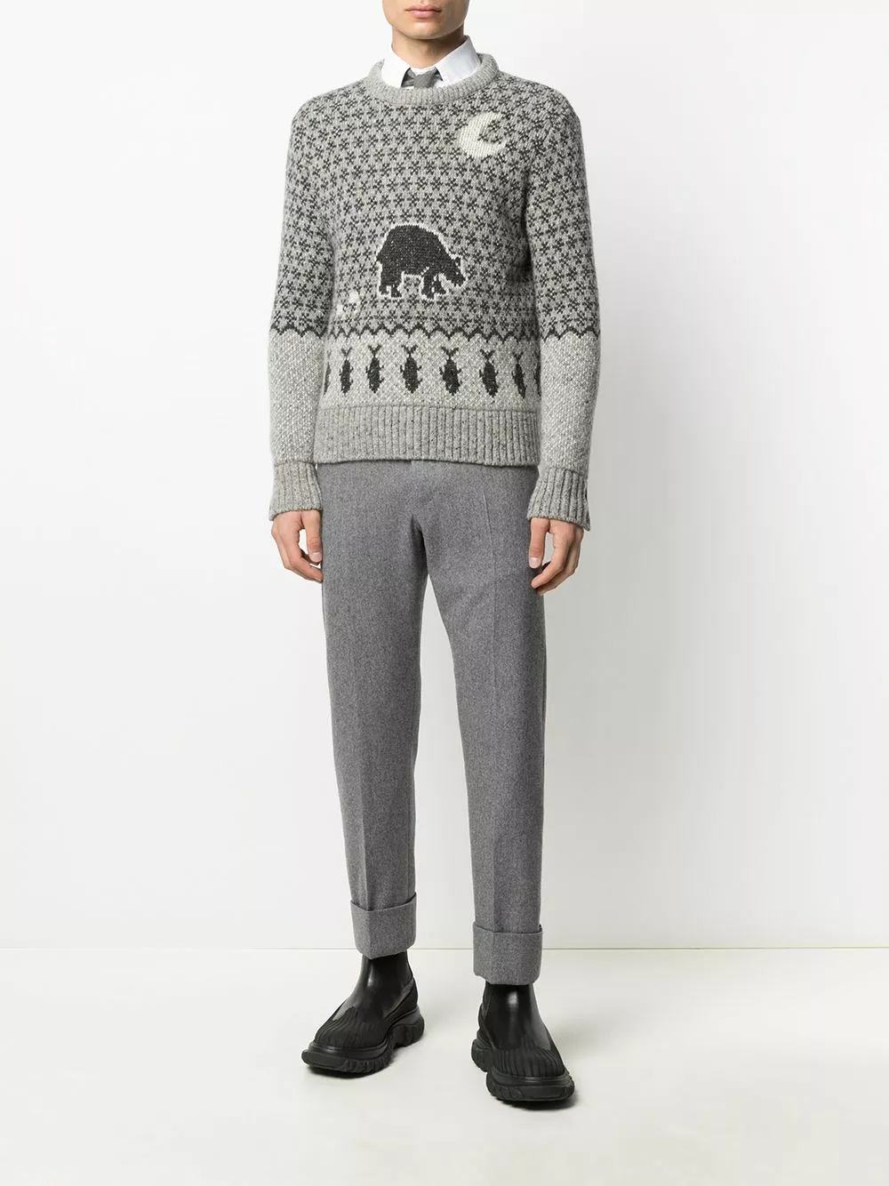Ready to wrap up? Then let us introduce you to this jumper from Thom Browne; in a medium grey hue and an intarsia knit design, this piece is sure to keep you layered up and looking good throughout the weather event that is everyday life. What’s ‘knit’ to love?