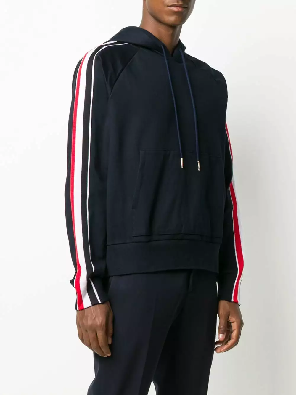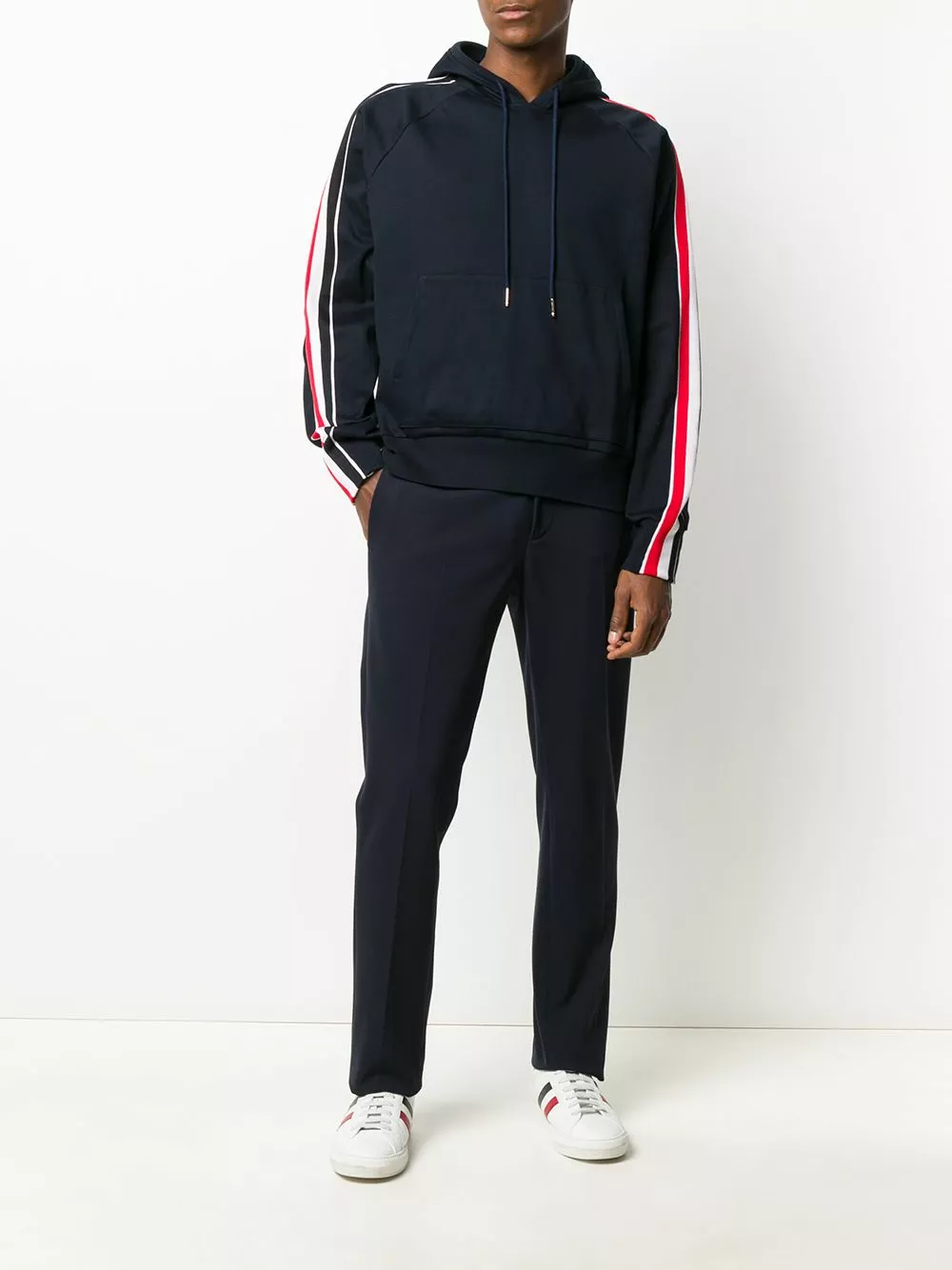 Thom Browne’s newest edit captures the immaculate craftsmanship and minimalist designs that have come to define the American label, as seen with this navy blue cotton interlock RWB stripe hoodie featuring a hood with drawstring tie fastenings, long length raglan sleeves with a stripe detail to the side and a kangaroo pocket.