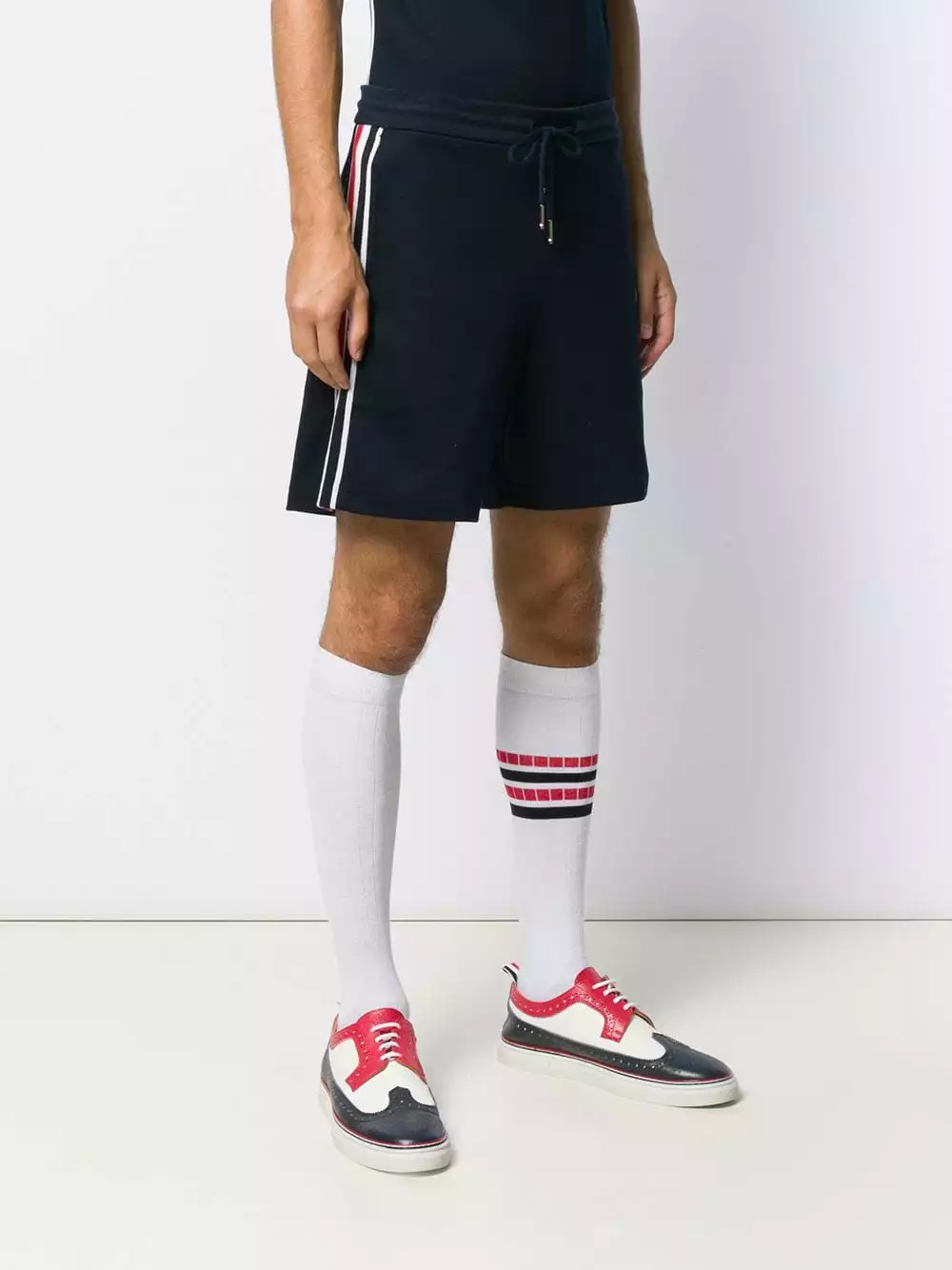 Launched in 2003, Thom Browne is internationally celebrated for its clean-cut silhouettes and couture-like sensibilities, as seen in these navy blue cotton interlock RWB stripe shorts. Featuring an elasticated drawstring waist, a contrasting tape at the side and a contrasting grosgrain tab at the rear.