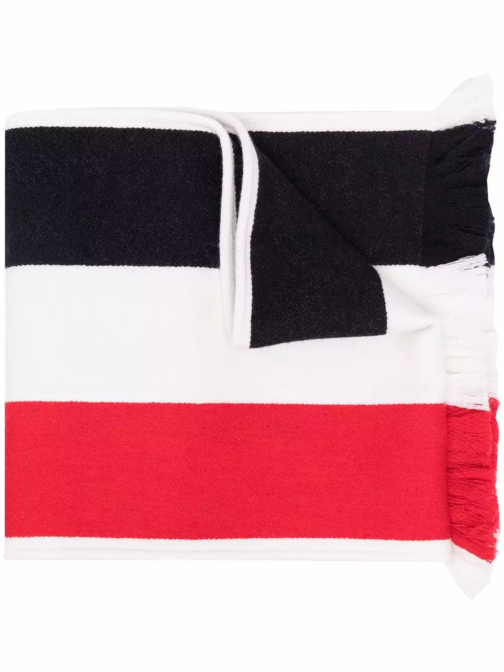 Cold days ahead? Master chilly mornings in style with this jacquard large stripe fringe scarf from Thom Browne. Winter blues are a thing of the past.