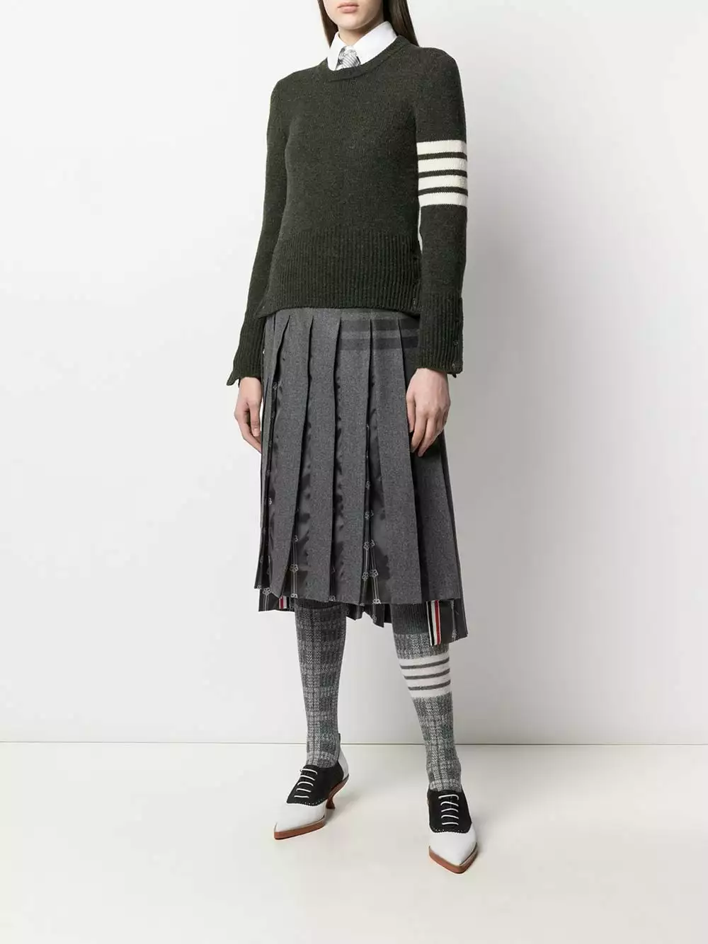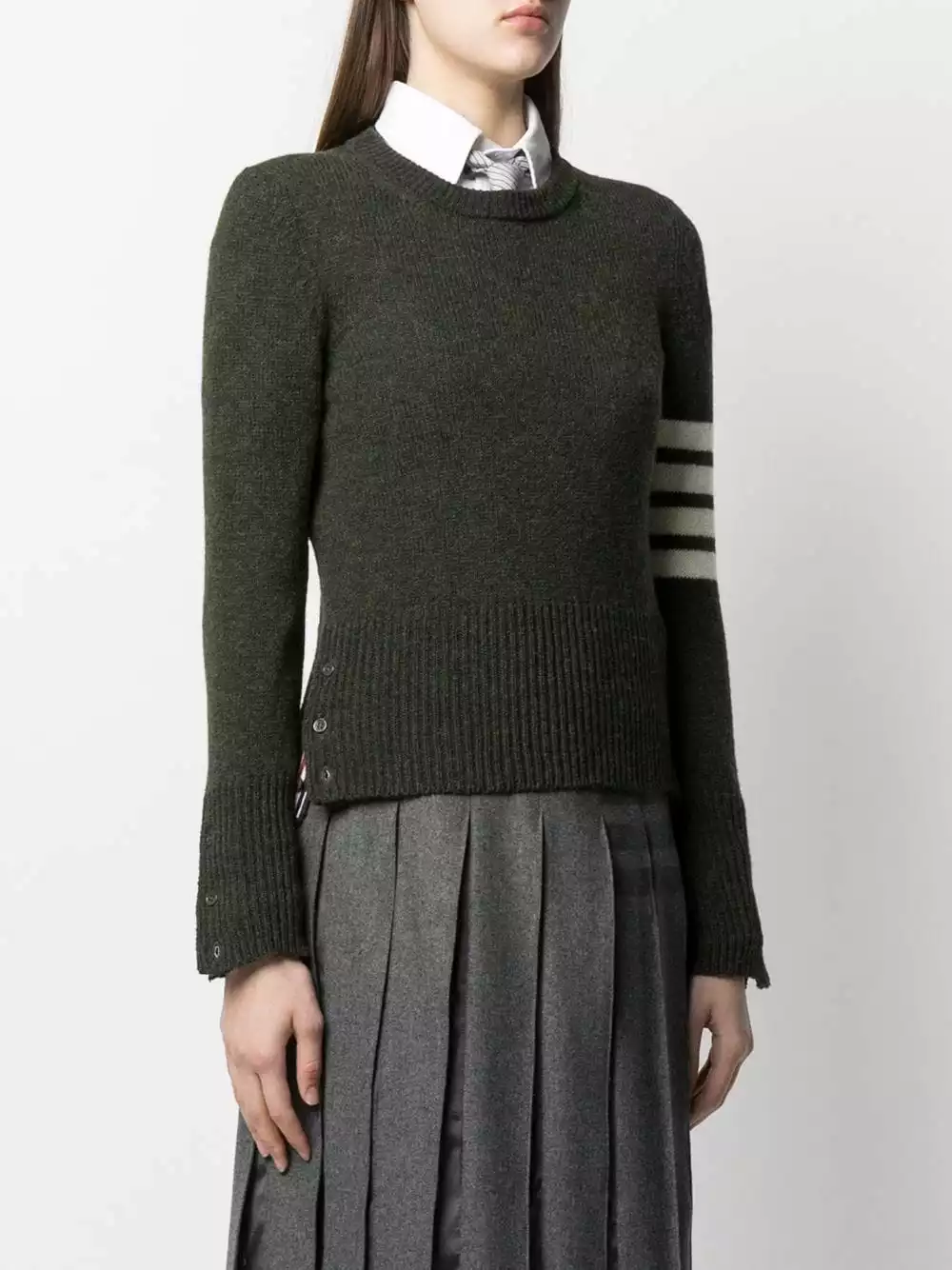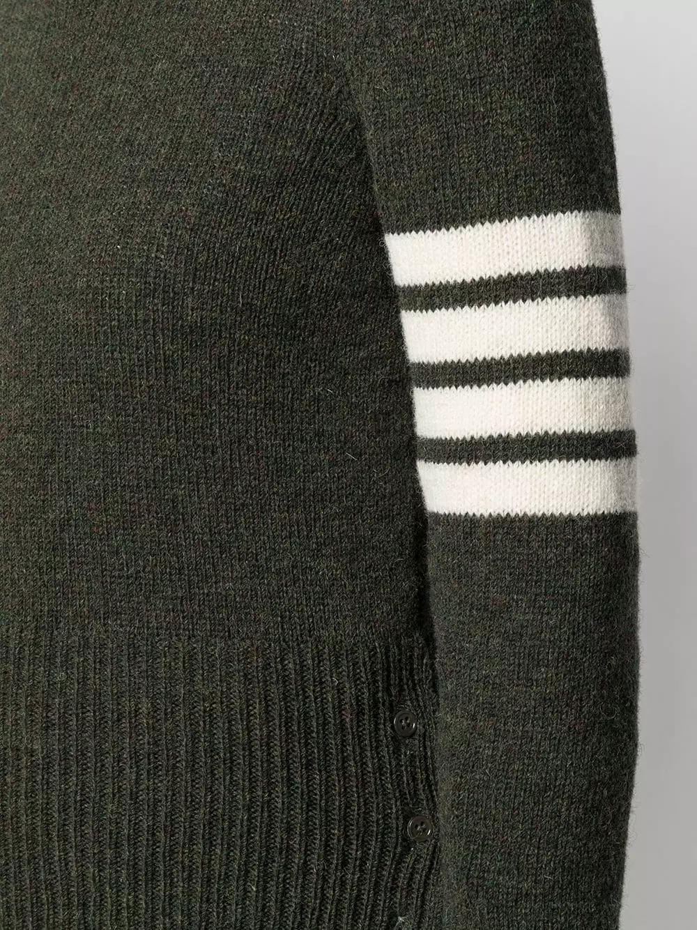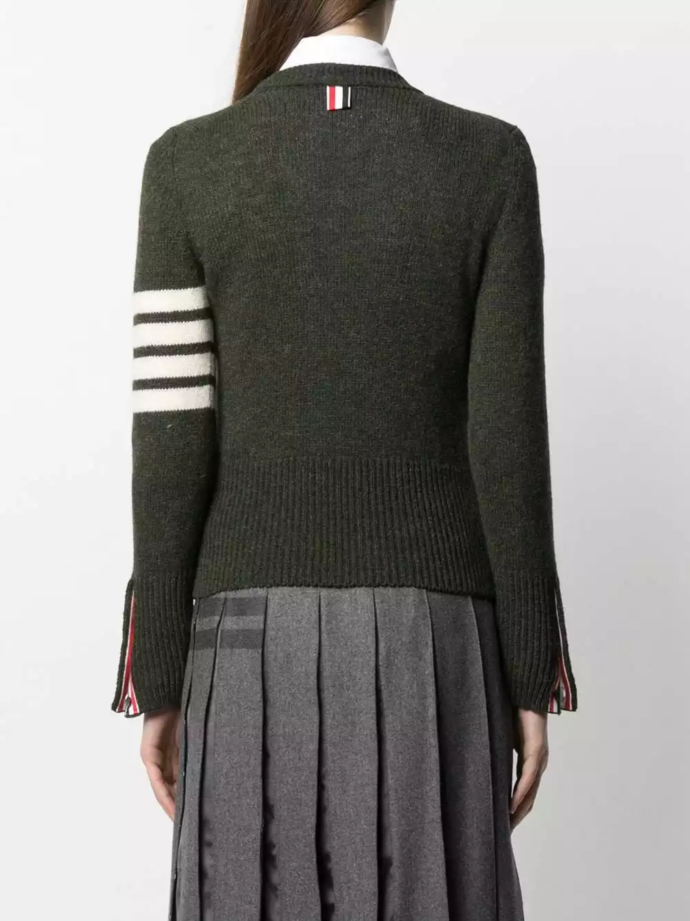 Are you a fan of Thom Browne’s classics? Then this dark green signature 4-Bar stripe jumper is one to add to the collection. Fabricated from Shetland wool, it’s beautifully soft too!