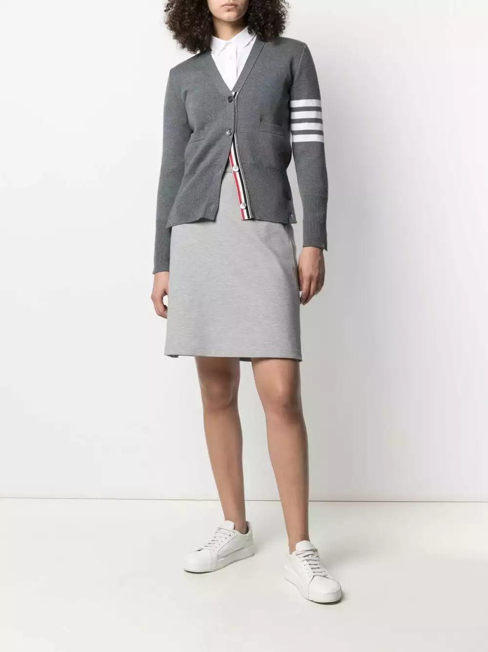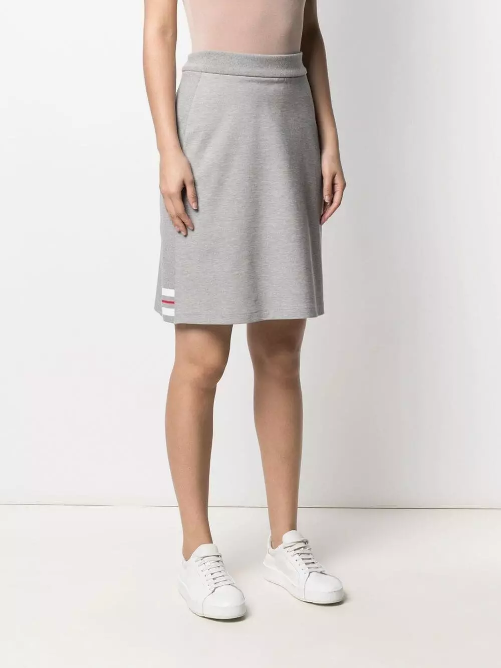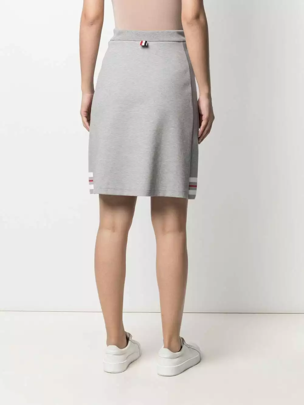 A true wardrobe staple. Tailored and sophisticated, this knee-length skirt from Thom Browne is crafted from a soft grey cotton blend, and features the signature side stripe and RWB detailing along the hem and waist. Soon to be a firm favourite.