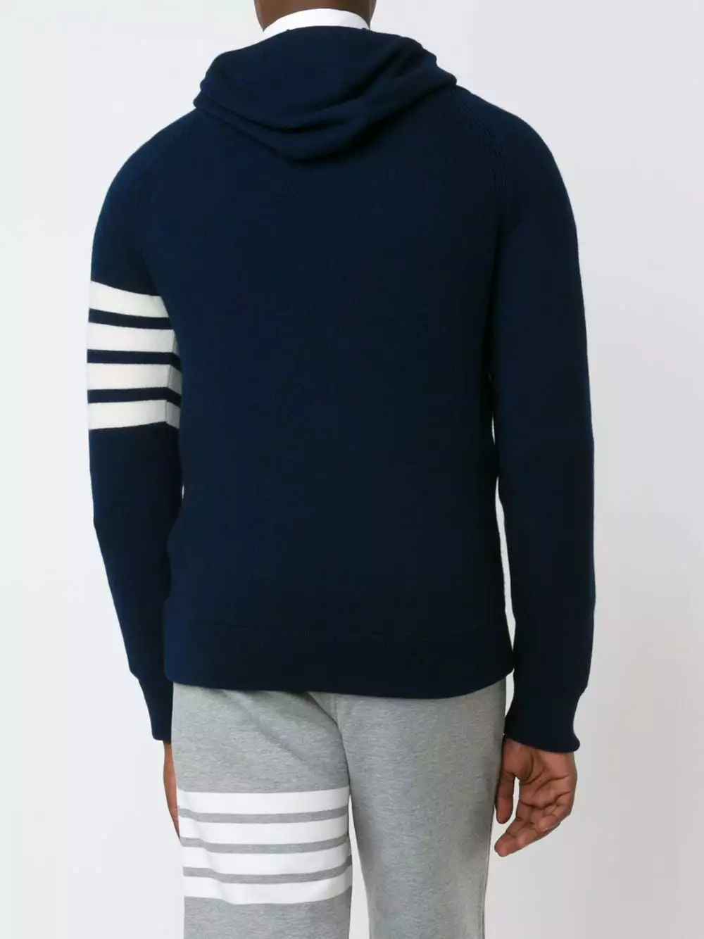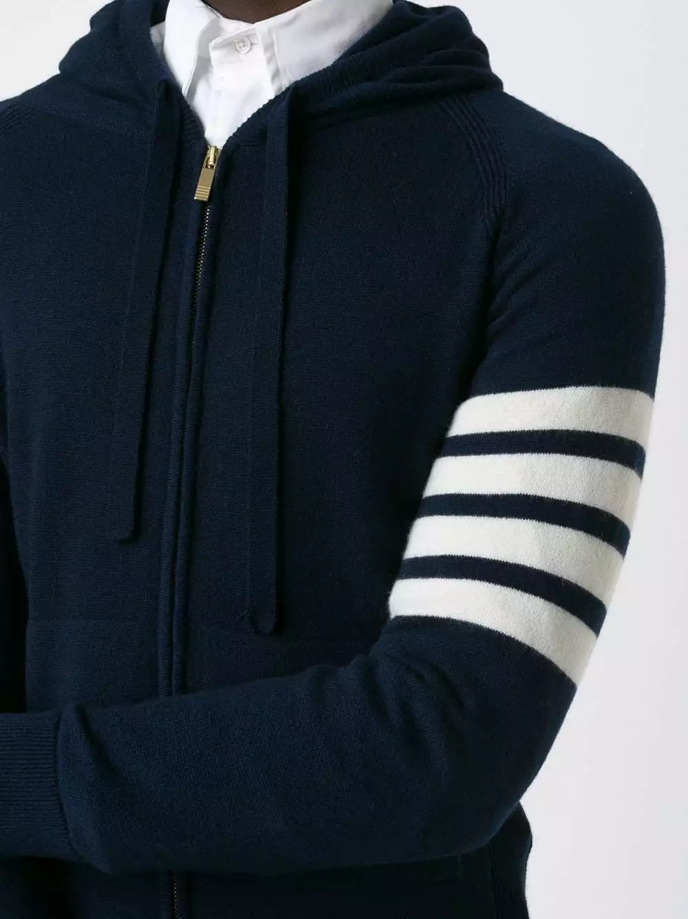 Thom Browne has taken a classic staple zipped hoodie and made it a high-end wonder. With his signature stripe detail, this navy blue cashmere knitted hoodie features a drawstring hood, a front zip fastening, long sleeves and two front pockets. This item is true to fit.