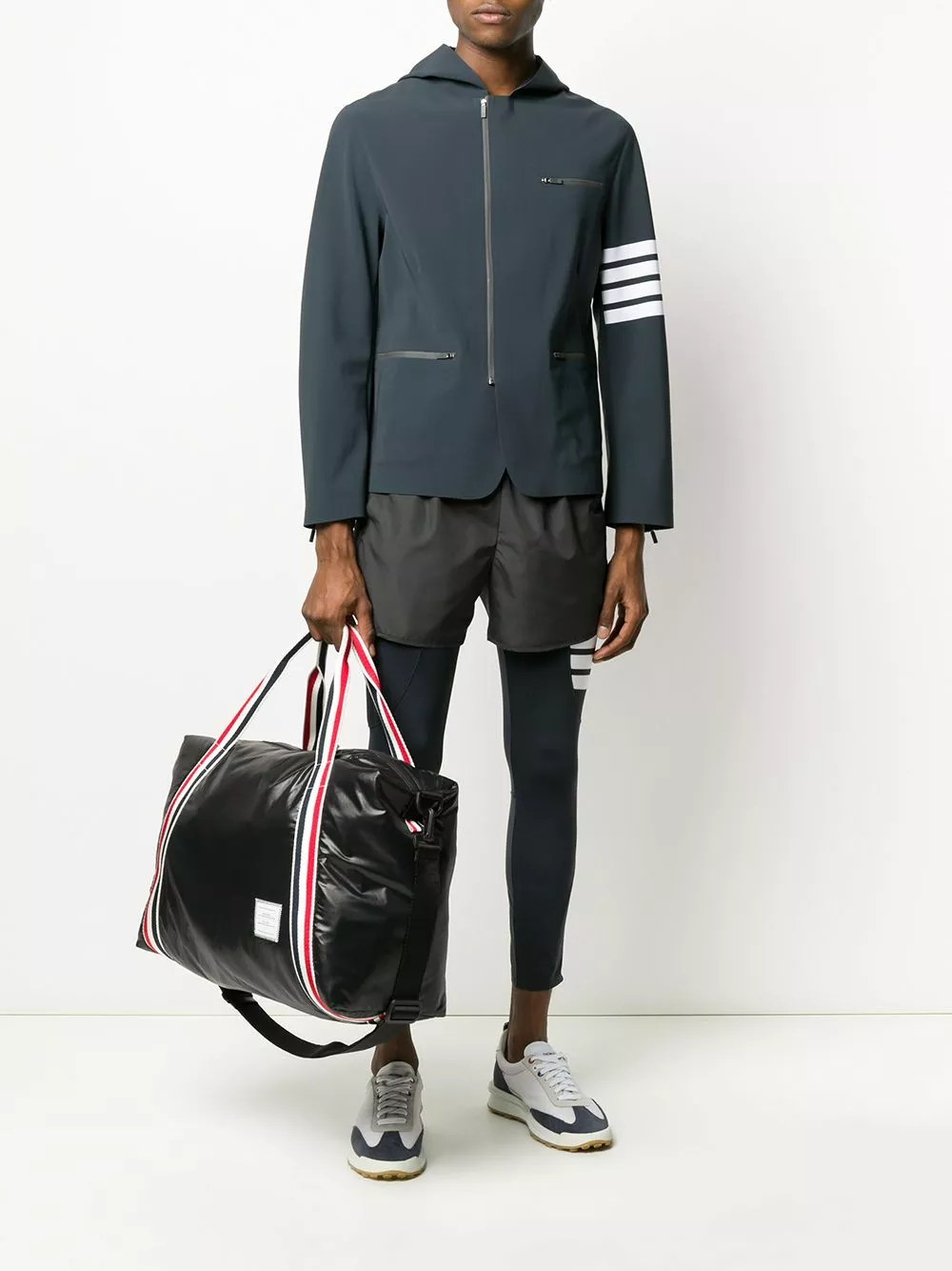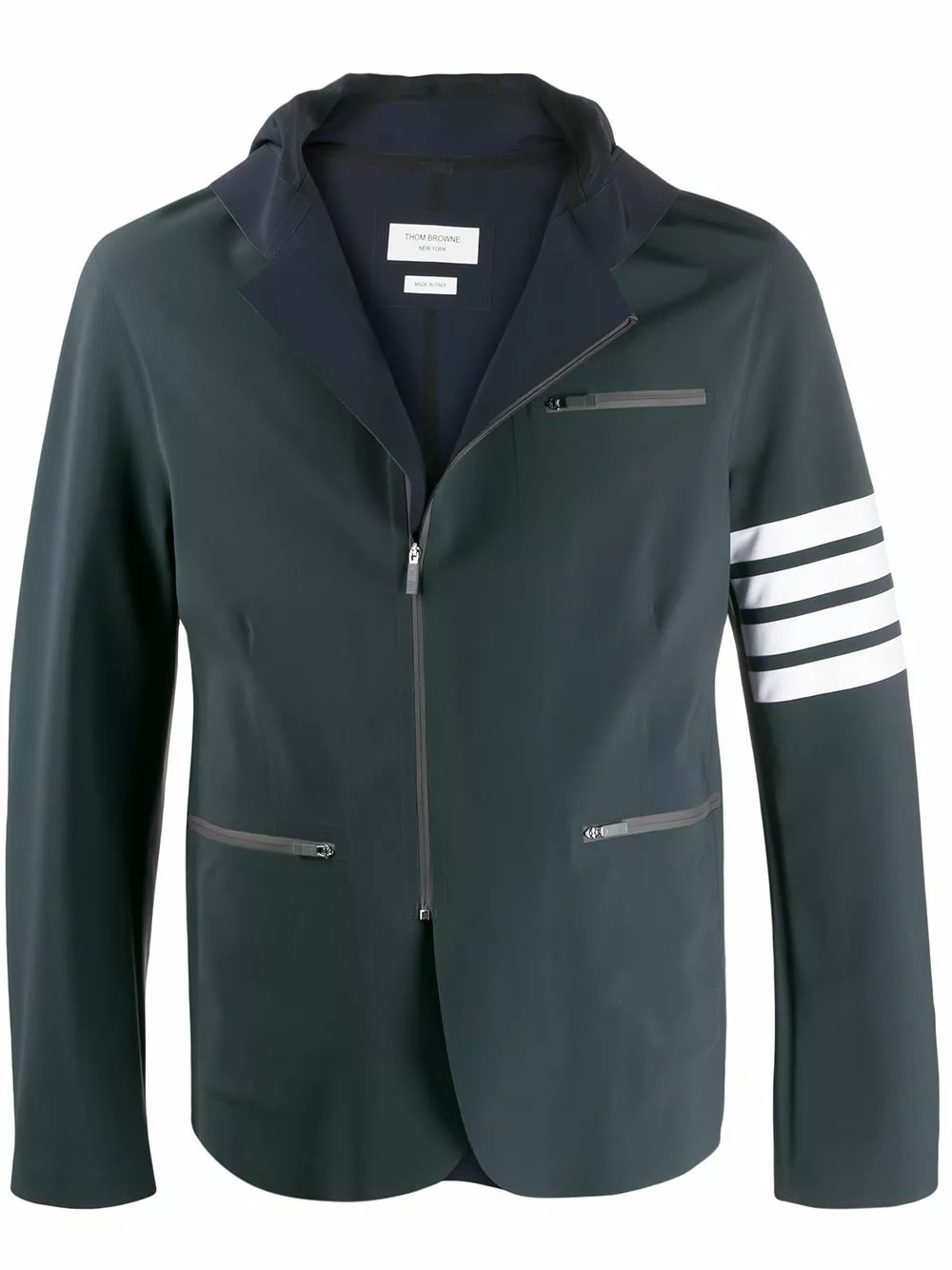 Hitting the gym in style was never so easy with this lightweight tech hooded 4-Bar jacket from Thom Browne. Now you don’t have any excuses to stay home (well you have, but ugly clothes are not one)! Featuring a hood, a front zip fastening, long sleeves, a zipped chest pocket, front zipped pockets, a lightweight construction and a 4-bar stripe detail to the sleeve.