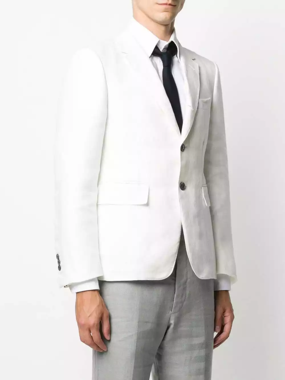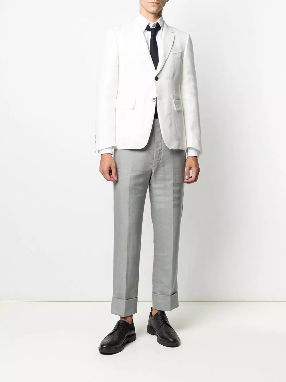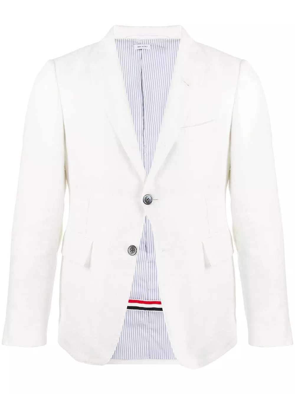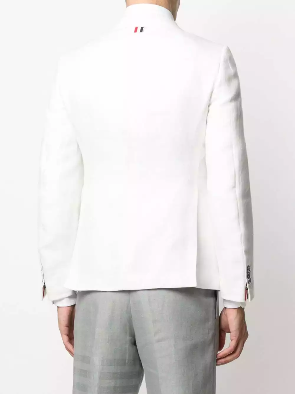 Garden party chic is how we see this wonderful piece from Thom Browne. The linen body gives this jacket a summer air that allows you to keep your cool, all season long. Top up that drink, button up and enjoy.