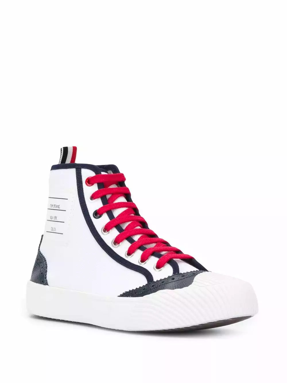 Whenever you expect a tailoring house to zig, Thom Browne choose to zag. A perfect example are these hi-top sneakers, which are crafted in Spain using high-quality canvas — but which also feature brogue-style contrast leather. High meets low, zig meets zag, and you meet your new favourite pair of shoes.