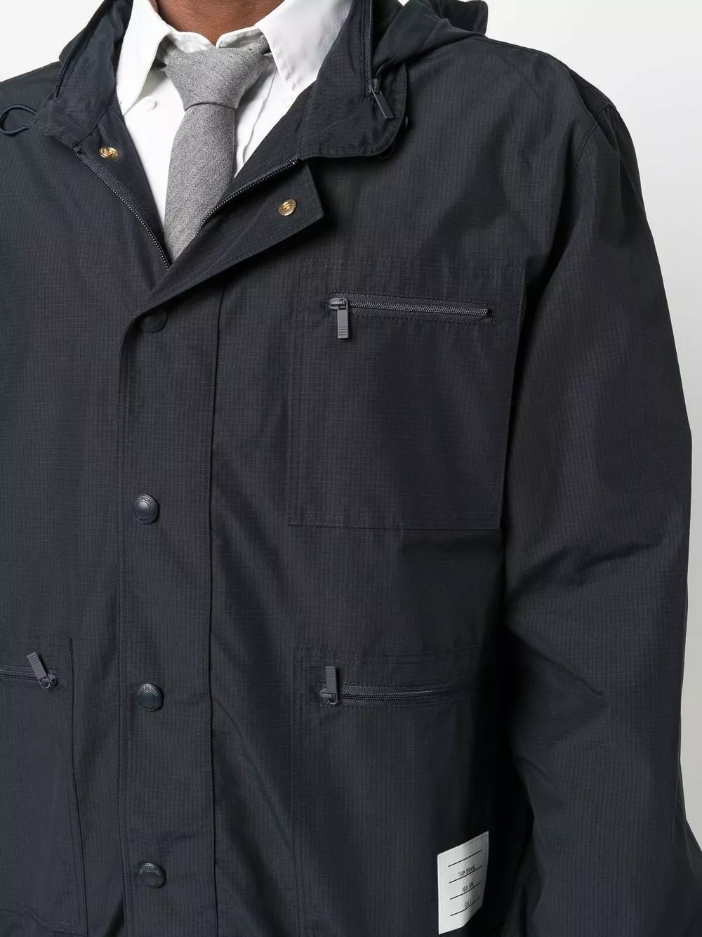 Applying the same exquisite attention to detail to every item, Thom Browne promises perfection in every part of the wardrobe. Woven from a navy-blue cotton blend, this hooded jacket is detailed with a contrasting logo patch to the side.