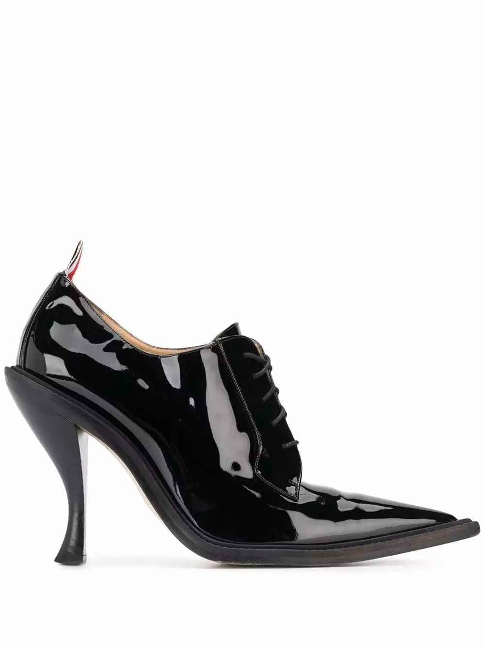 Other pointed pumps have nothing on this Thom Browne pair. They take the point to the extreme. What’s the ‘point’ in even trying to compete with them? Featuring patent leather, a branded insole, a pointed toe, a front lace up detail, a sculpted high heel and a signature grosgrain loop tab.