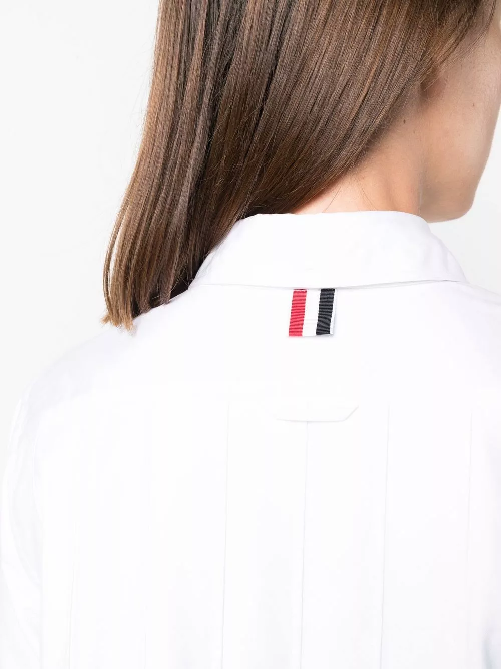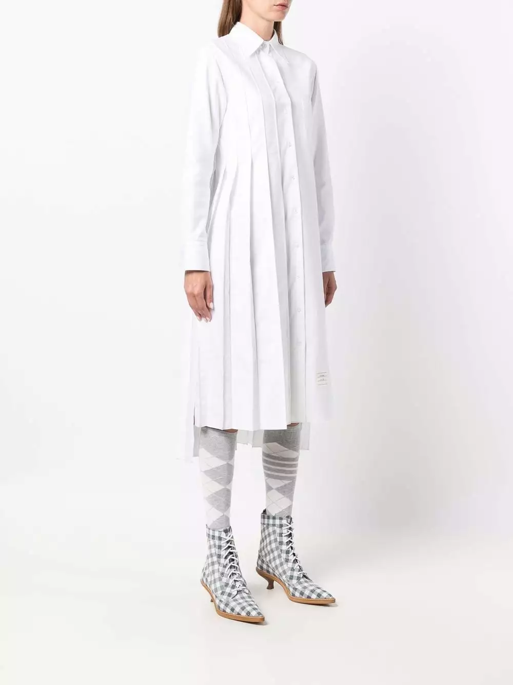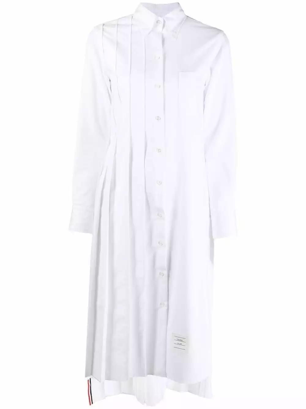 Thom Browne became widely recognized because of his womenswear collections after U.S. first lady Michelle Obama wore one of his designs, in 2013. His designs include elegant and timeless pieces like this white long-sleeve pleated shirtdress, crafted from soft cotton.