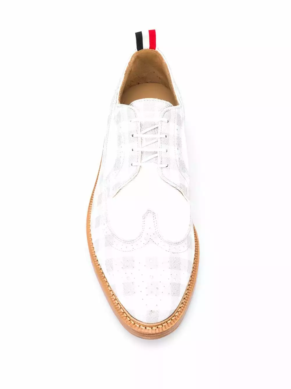 Establish your heritage-inspired style with Thom Browne’s Longwing Spectator brogues. Featuring gingham check print on pebble grain leather and signature tricolour stripe pull-tab at the back. You’ll be putting your best foot forward, or in this case, both of them.