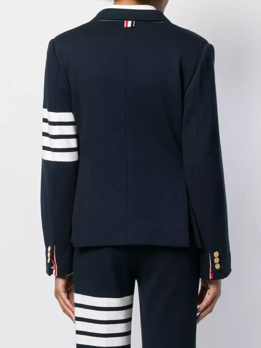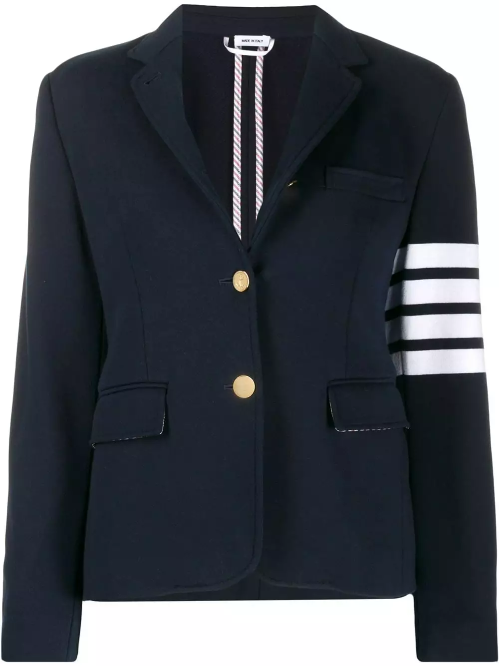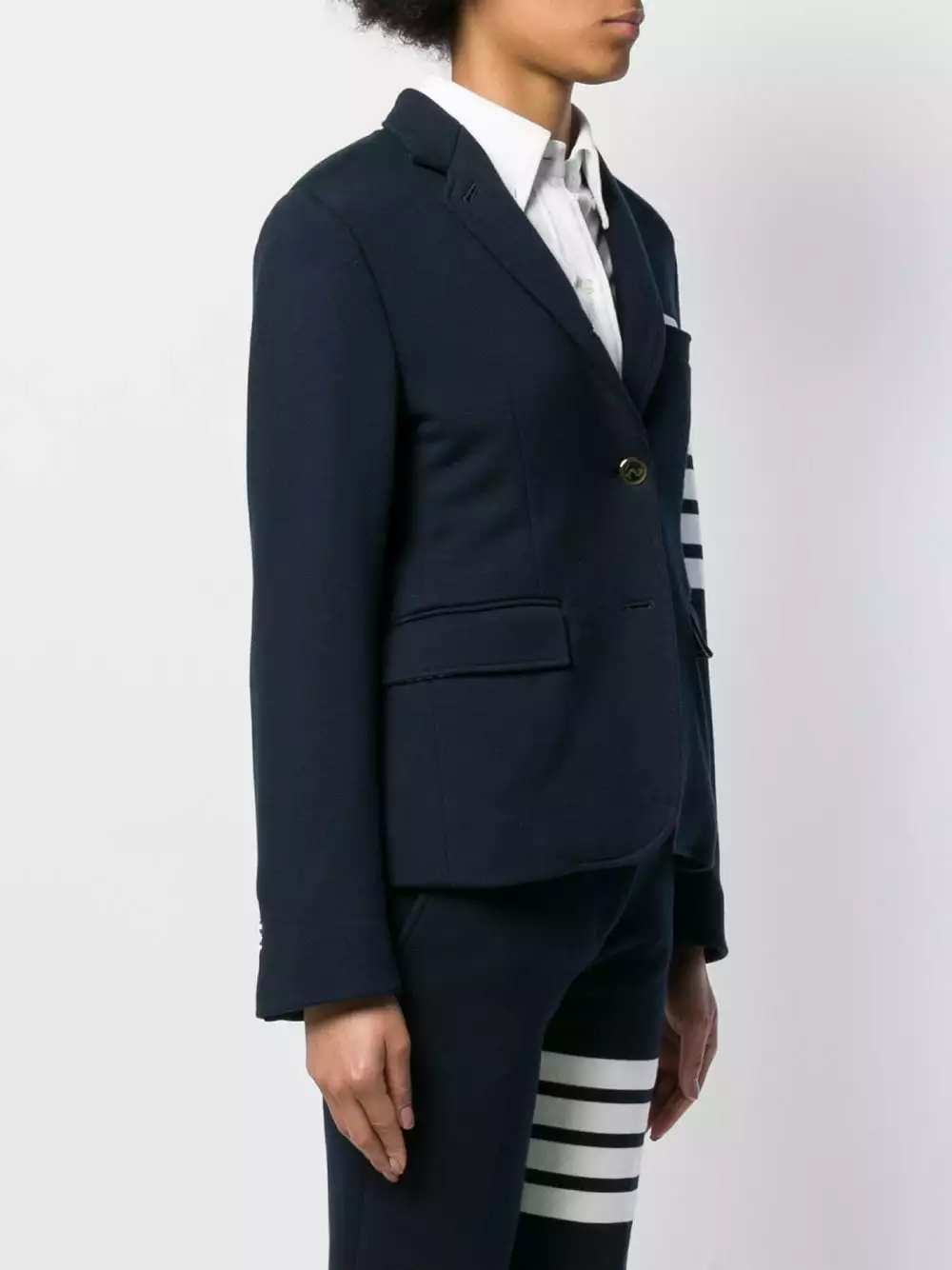 Who said formal couldn’t be fun? Not Thom Browne, that’s for sure. This navy blue cotton loopback narrow shoulder 4-Bar blazer benefits from a tailored design whilst also boasting the iconic 4-Bar print at the sleeve. What are you waiting for? Featuring structured shoulders, notched lapels, a broad welt chest pocket, a front button fastening, front flap pockets, long sleeves, button cuffs, a double vent to the rear and a 4-Bar print to one side.