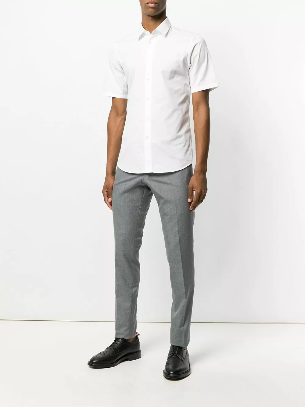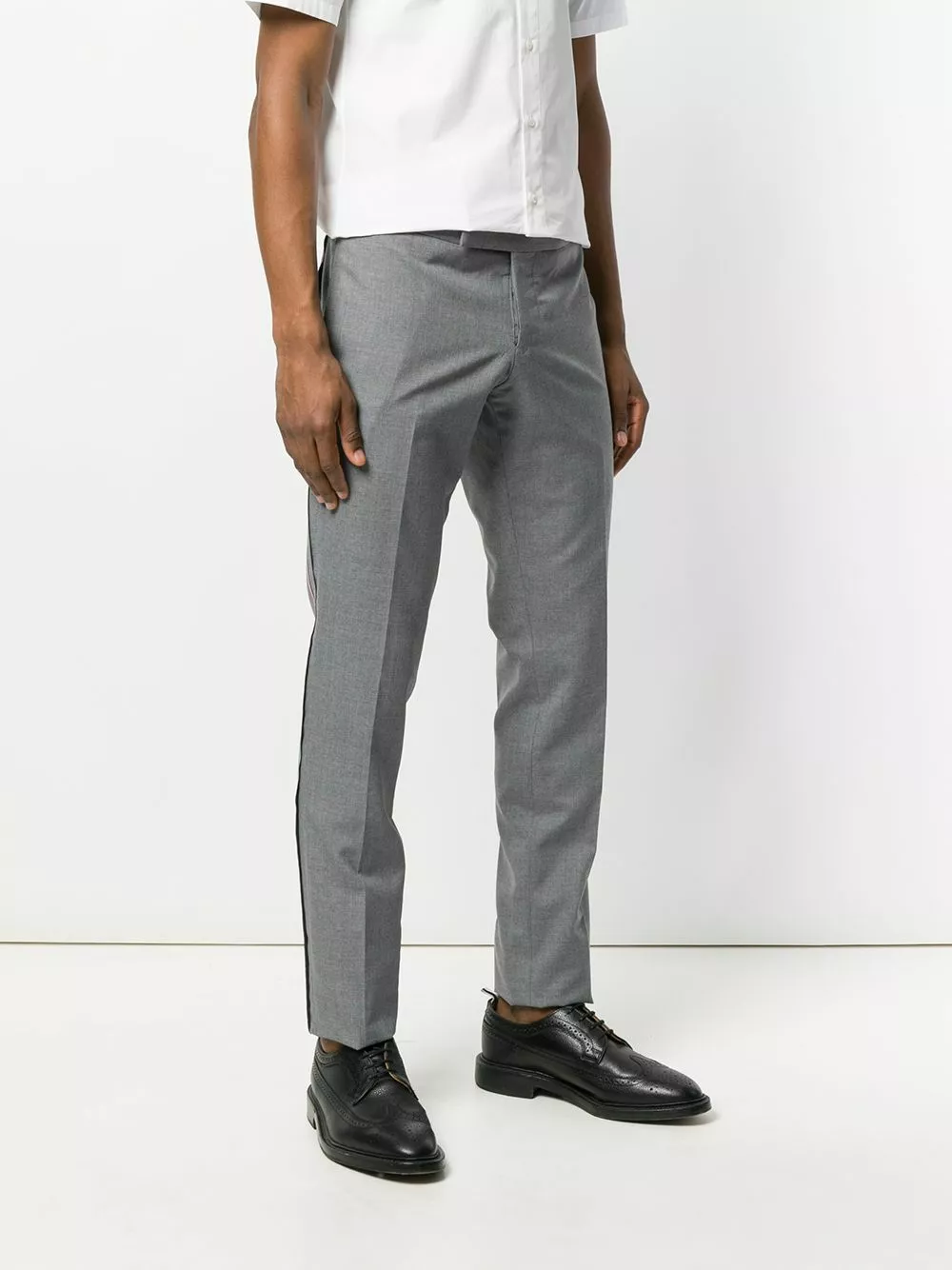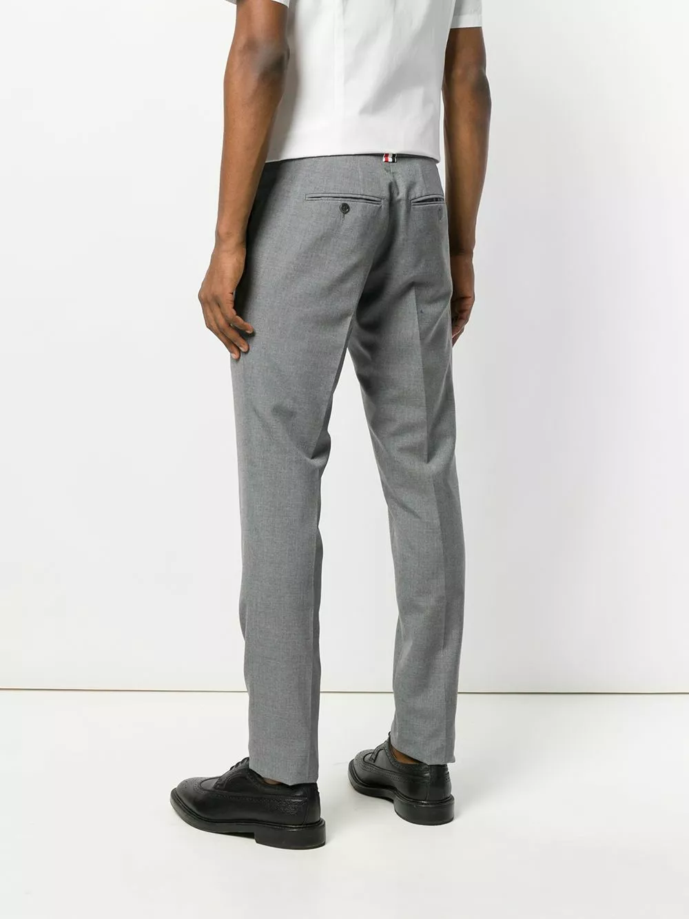 Medium grey wool blend low-rise skinny trousers from Thom Browne.