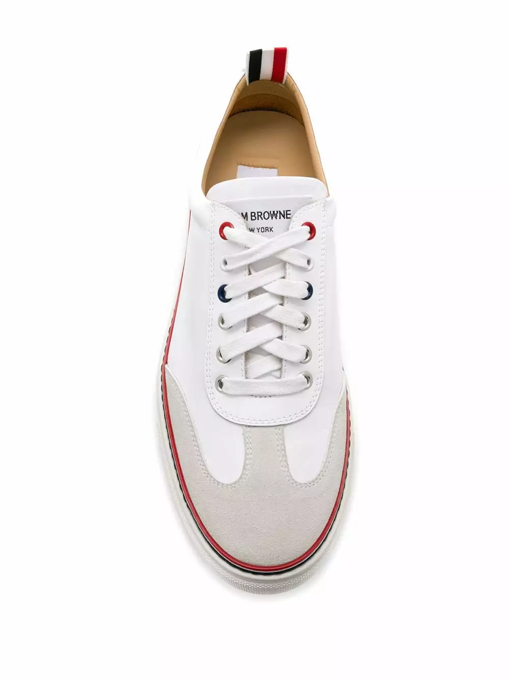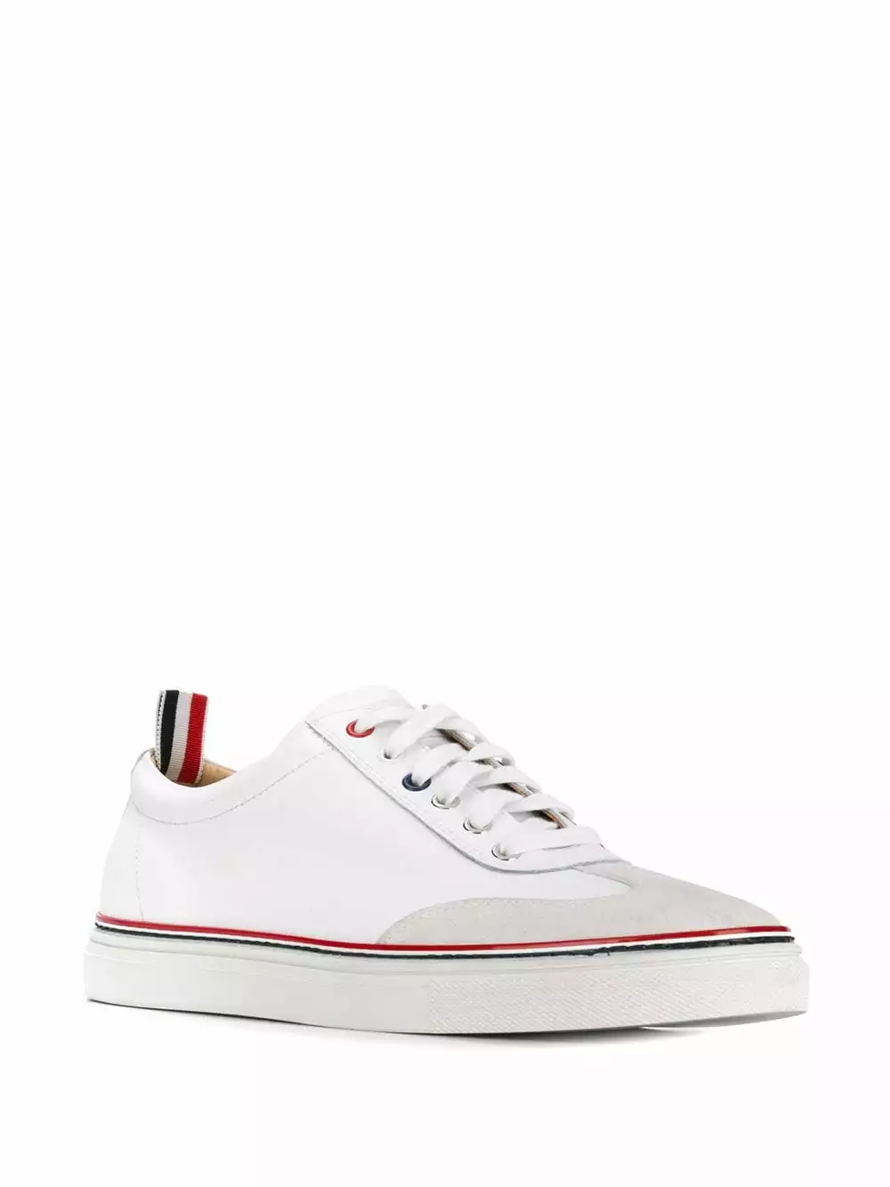 Thom Browne’s newest edit captures the immaculate craftsmanship and minimalist designs that have come to define the American label. Crafted from white leather, these rubberised sneakers feature a round toe with a contrasting suede toe cap, a lace-up front fastening, a flat rubber sole and a signature tri-colour striped trim.