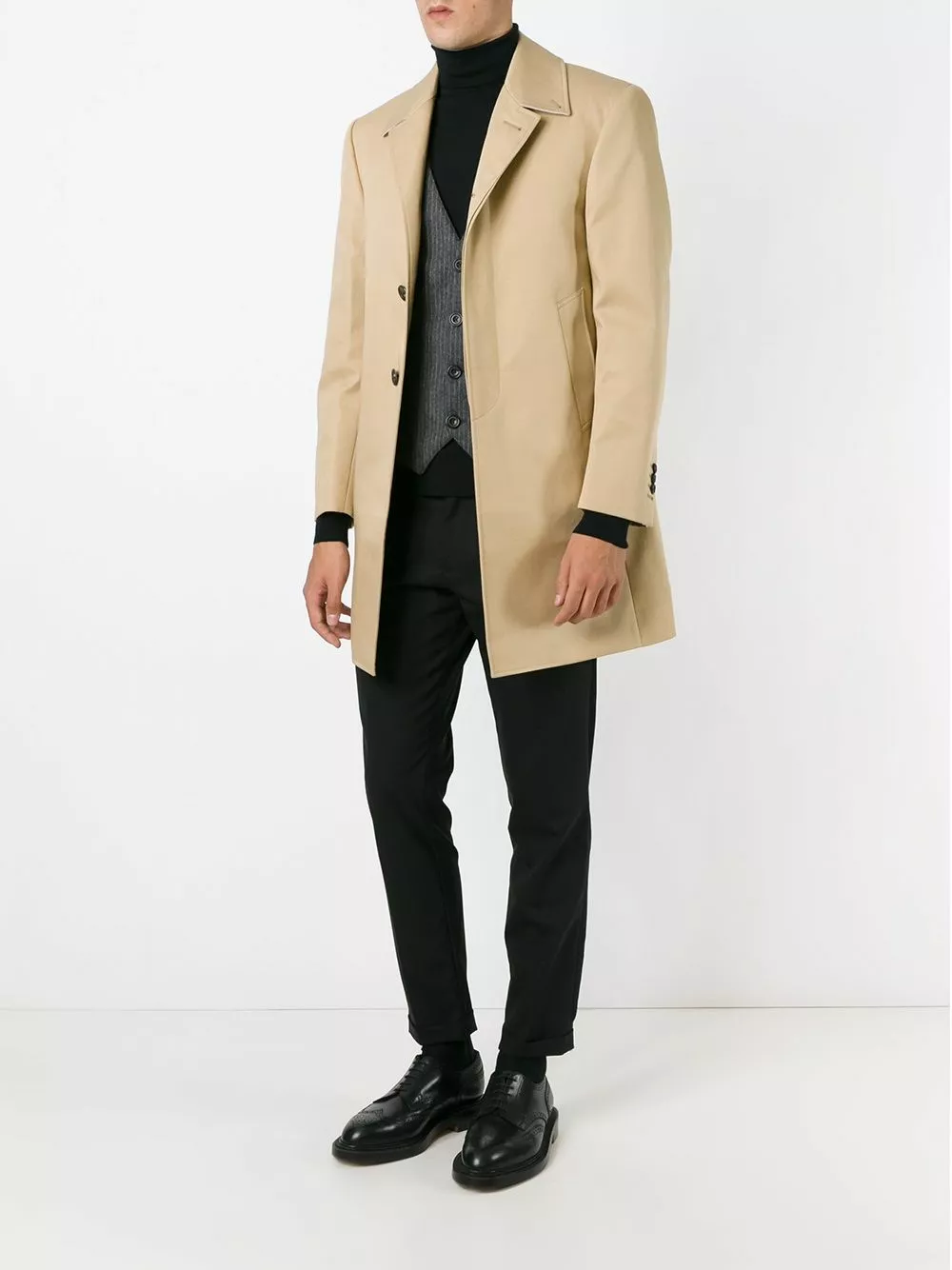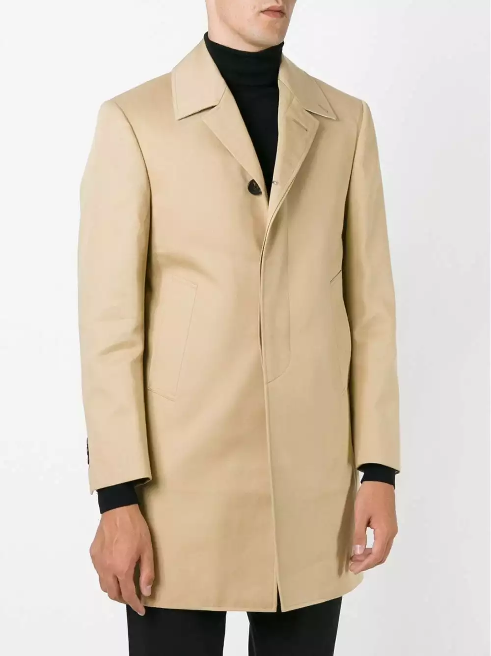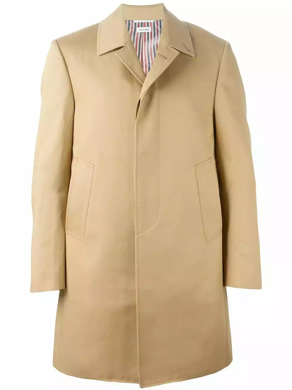 Beige cotton mac bal collar overcoat from THOM BROWNE featuring a classic collar, a button fastening, long sleeves, side pockets and button cuffs.