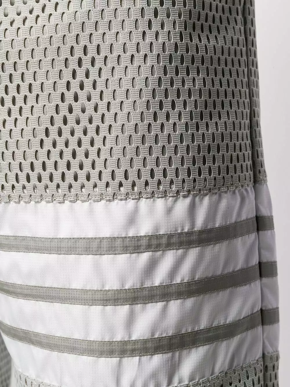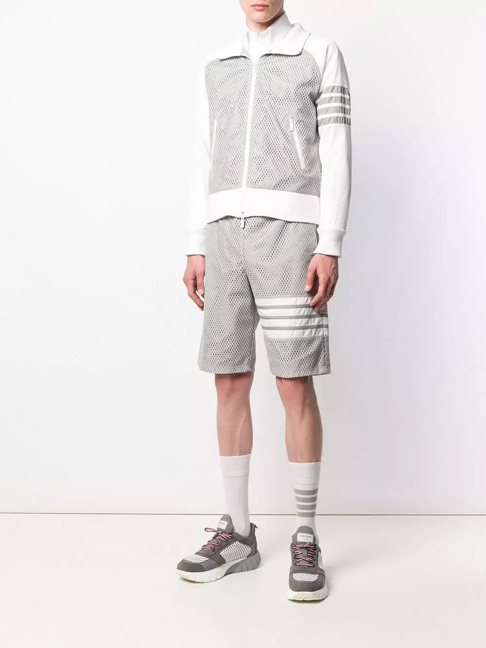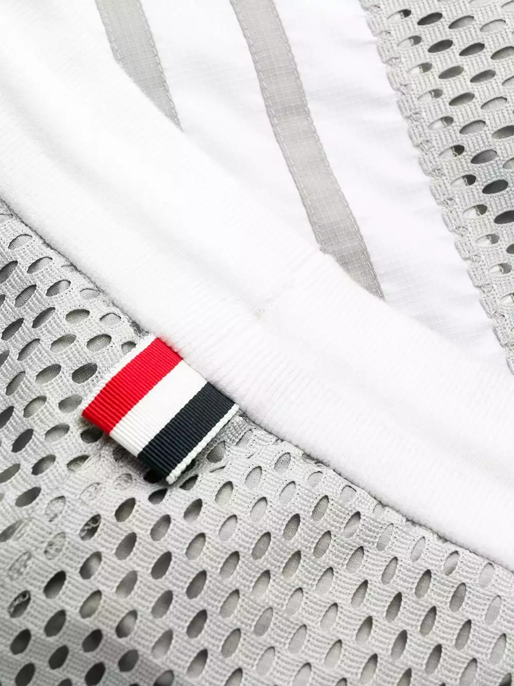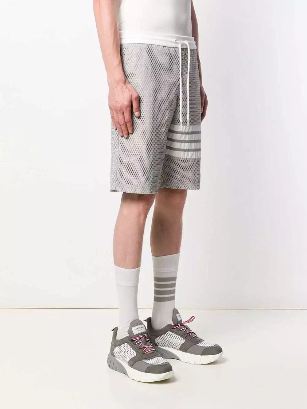 Thom Browne produces new takes on men’s fashion with creative prints and cuts. These light grey mesh track shorts from Thom Browne feature a drawstring waist, a back pocket, a stripe detail to the side, a relaxed fit and a knee length.
