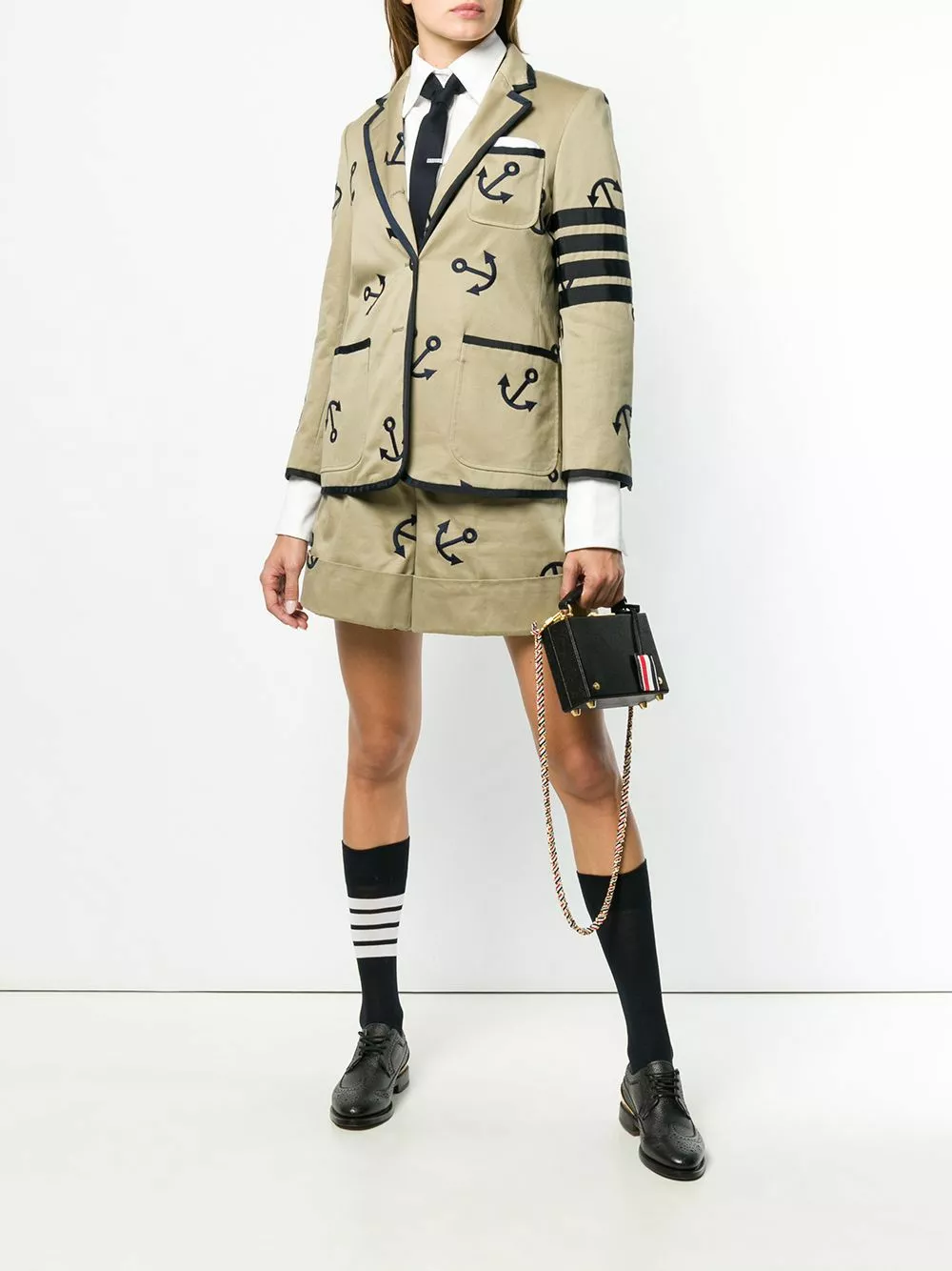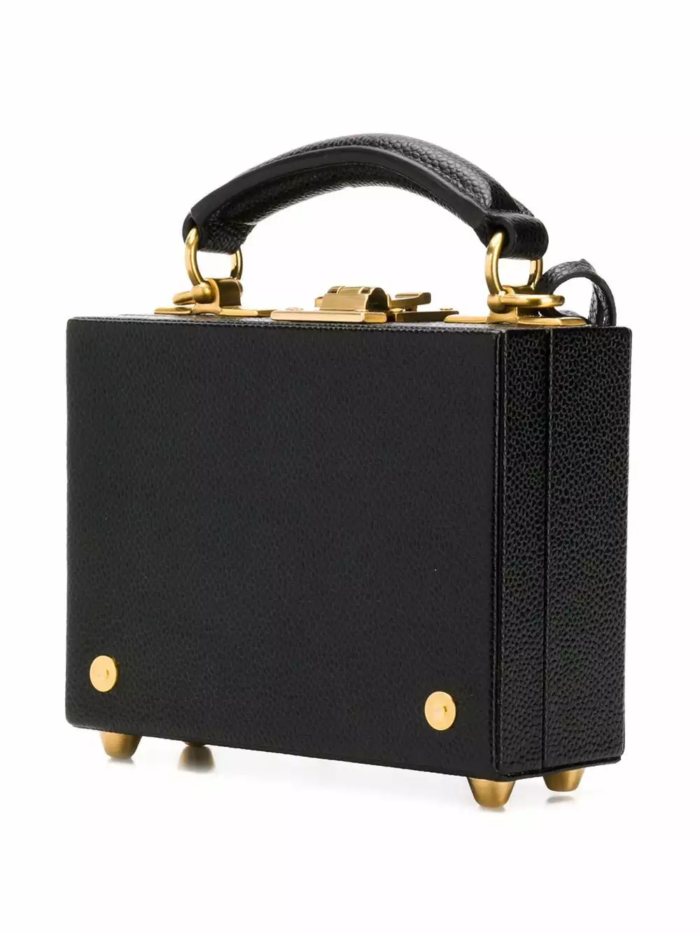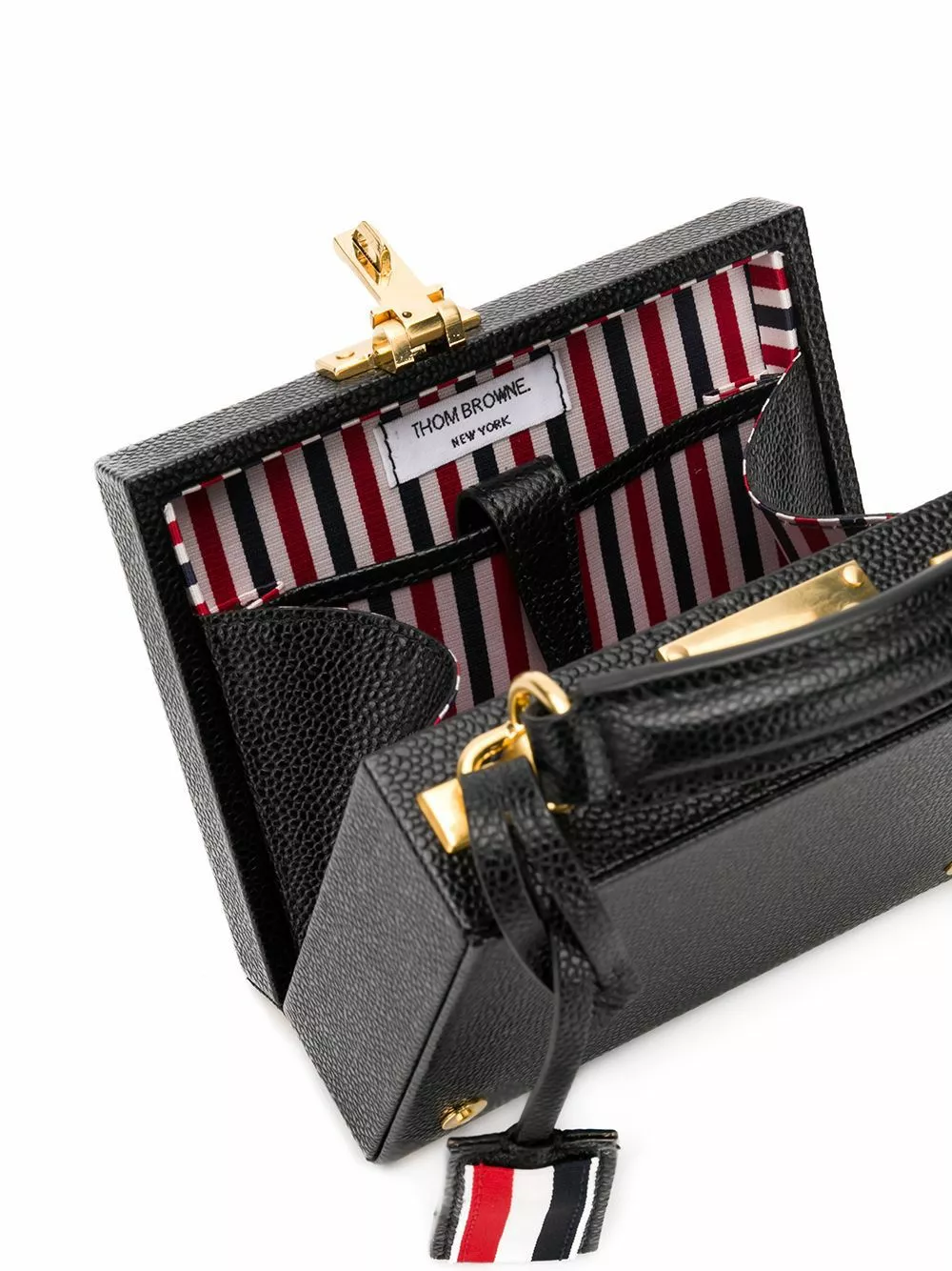 Carry your smallest essentials in style. This pebbled micro Attaché case from Thom Browne will be the piece you reach for every time you leave the house. And who could blame you? Featuring a pebbled leather texture, gold-tone hardware, a hinge closure, a flip-lock closure, a round top handle, an internal slip pocket, a RWB stripe, a detachable logo tag, a branded padlock detail and a RWB-detail chain strap.