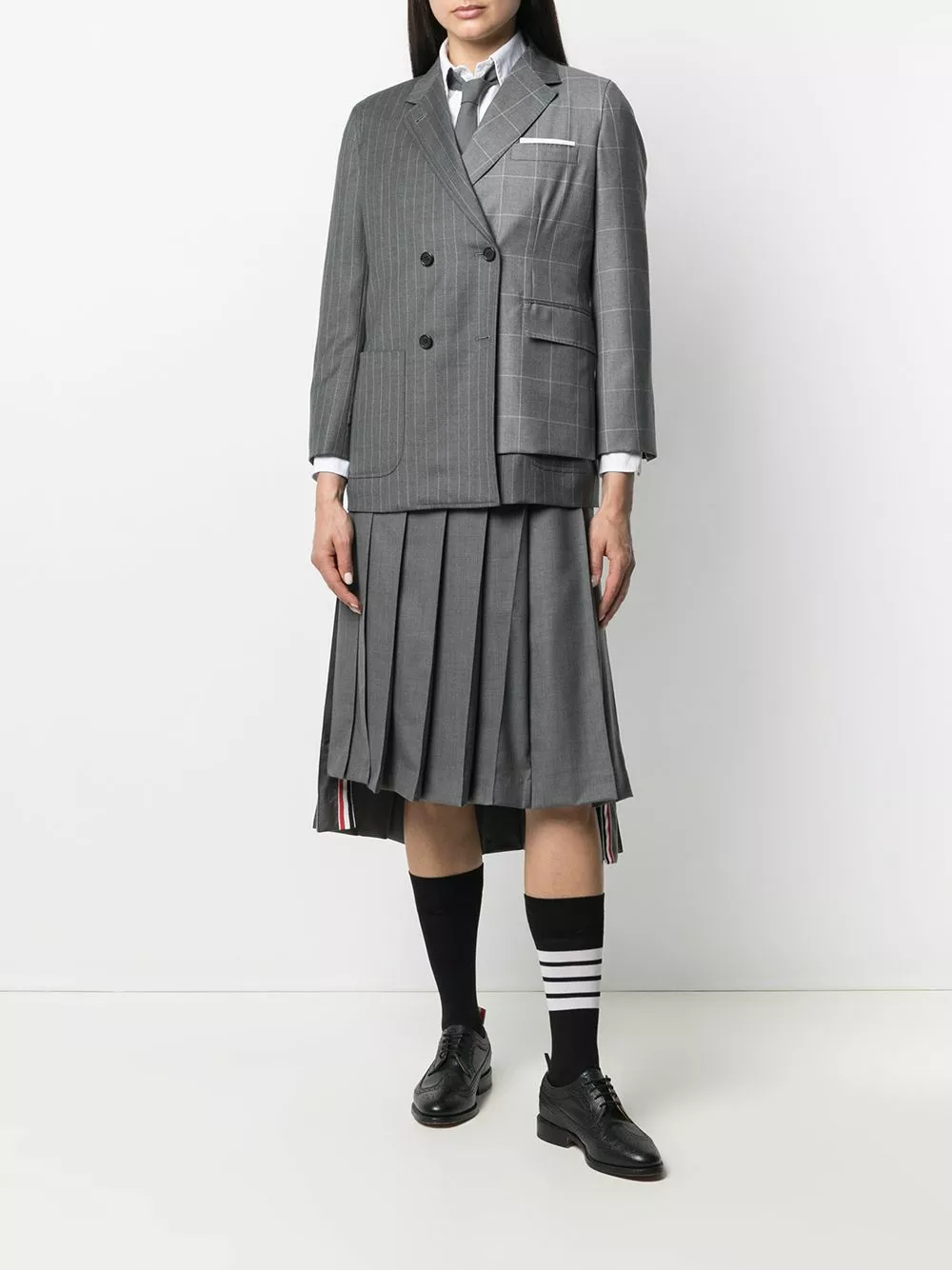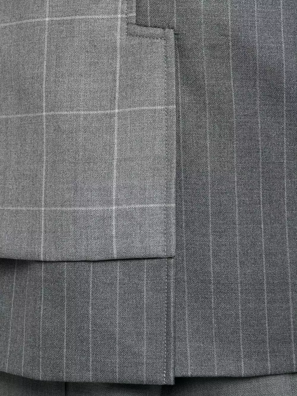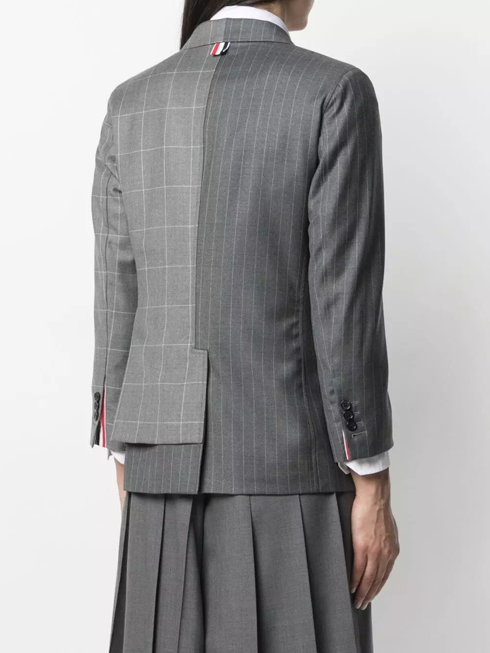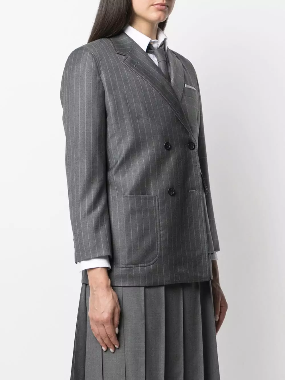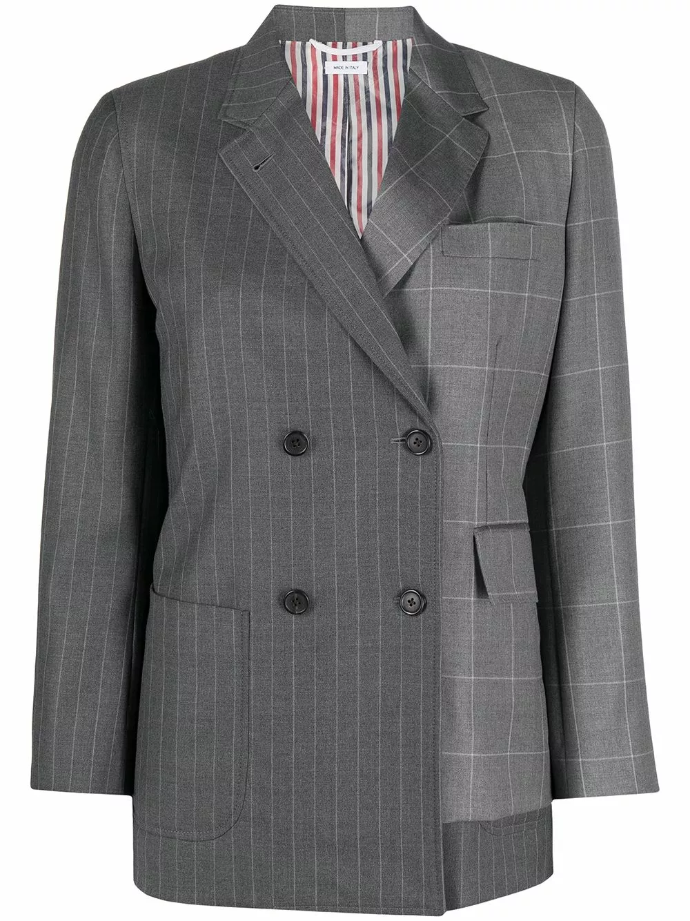 Some things are meant to elevate your attire. The same applies to this tonal-medium-grey wool mix-print double-breasted blazer from Thom Browne. It’s rather impossible to not happen.