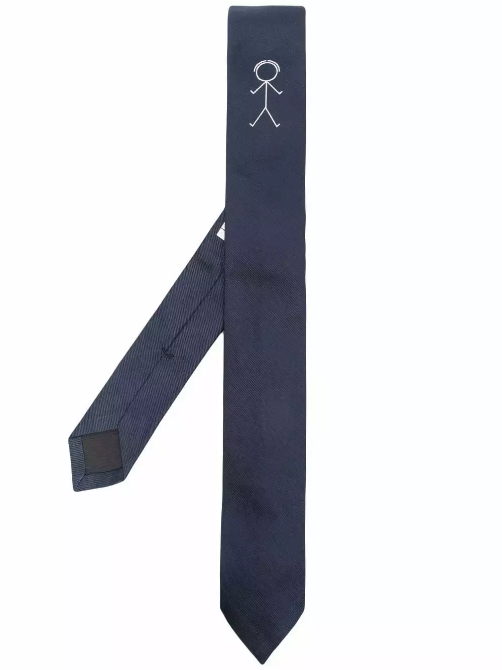Crafted from smooth pure silk, this necktie from Thom Browne’s AW21 collection has a subtle diagonal pattern of construction. Contrasting with a sober navy blue background is the brand’s signature stick motif – Mr. Thom.