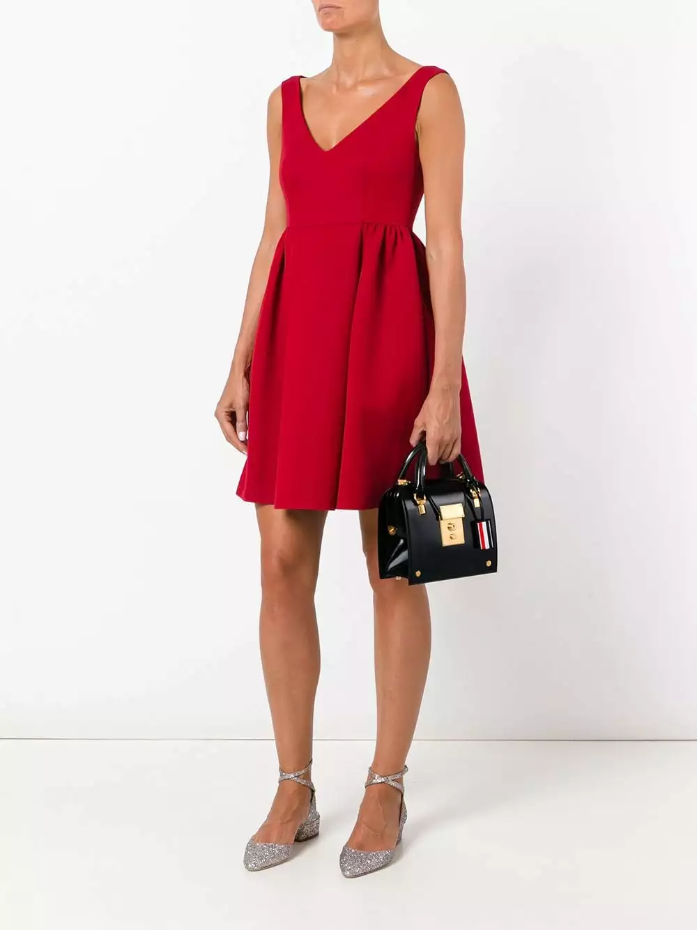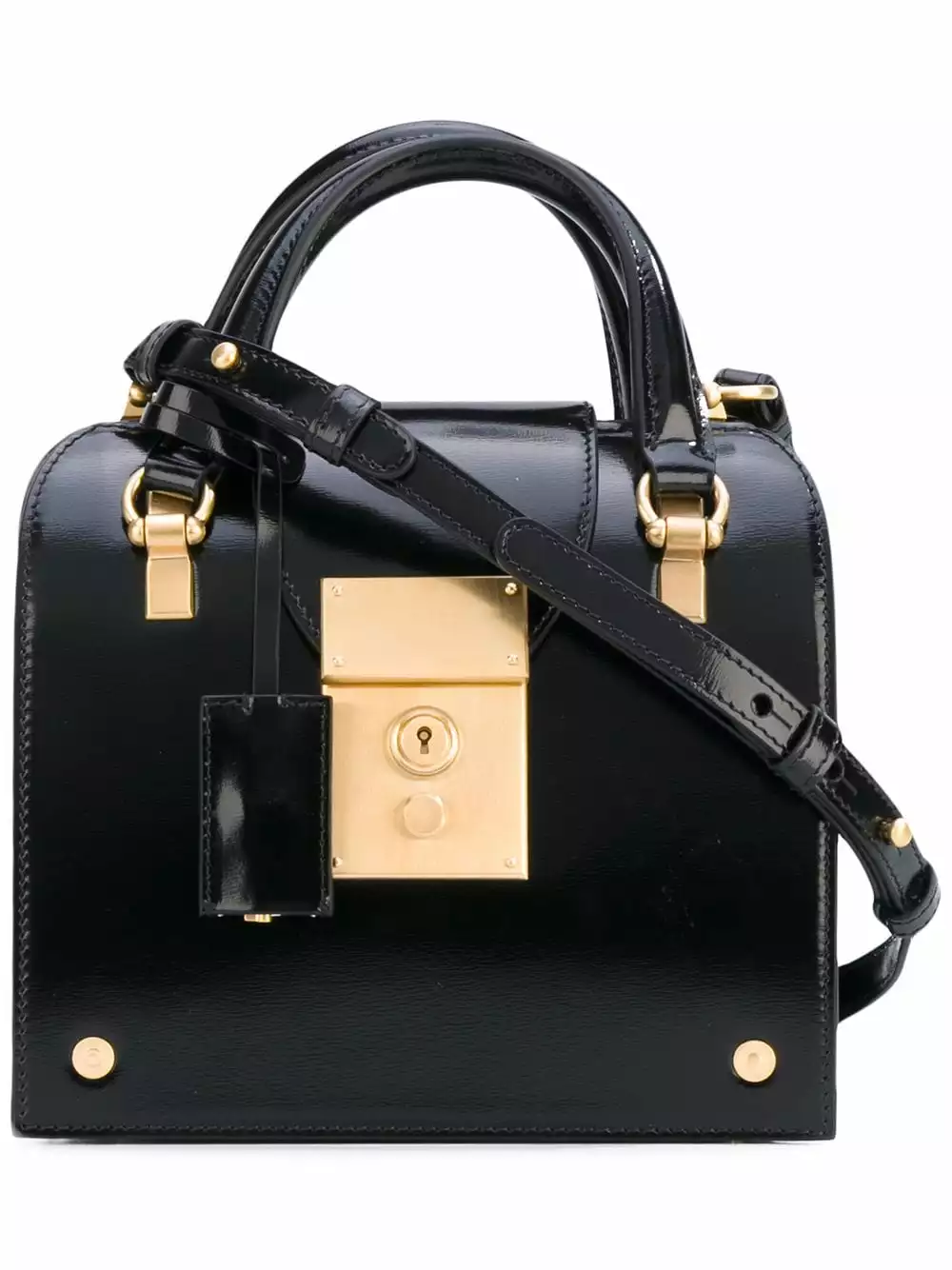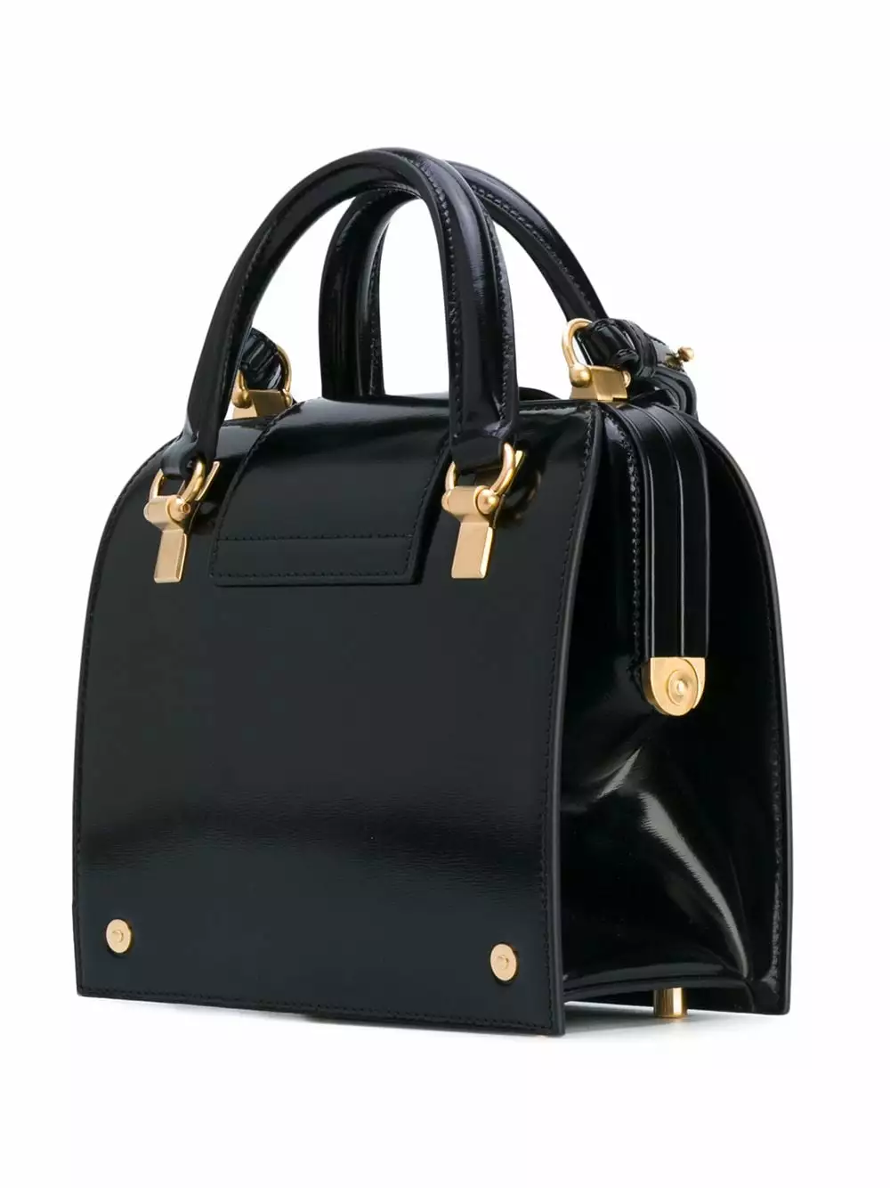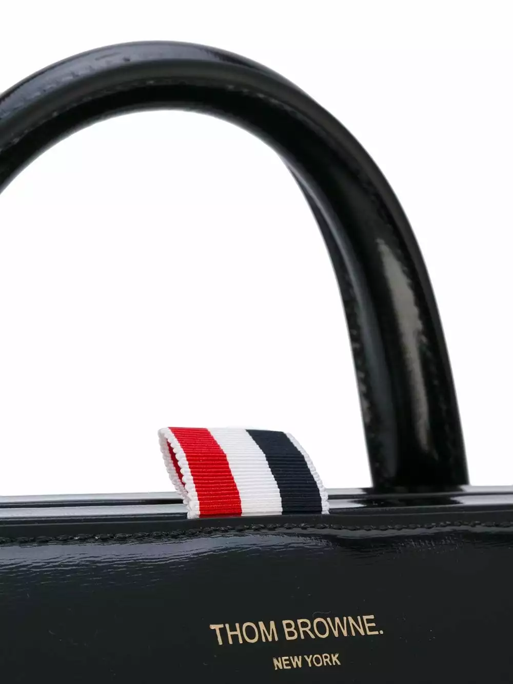 Black calfskin Mrs. Thom mini bag from Thom Browne featuring a top handle, a snap fastening, gold-tone hardware, an internal slip pocket and a detachable and adjustable shoulder strap.