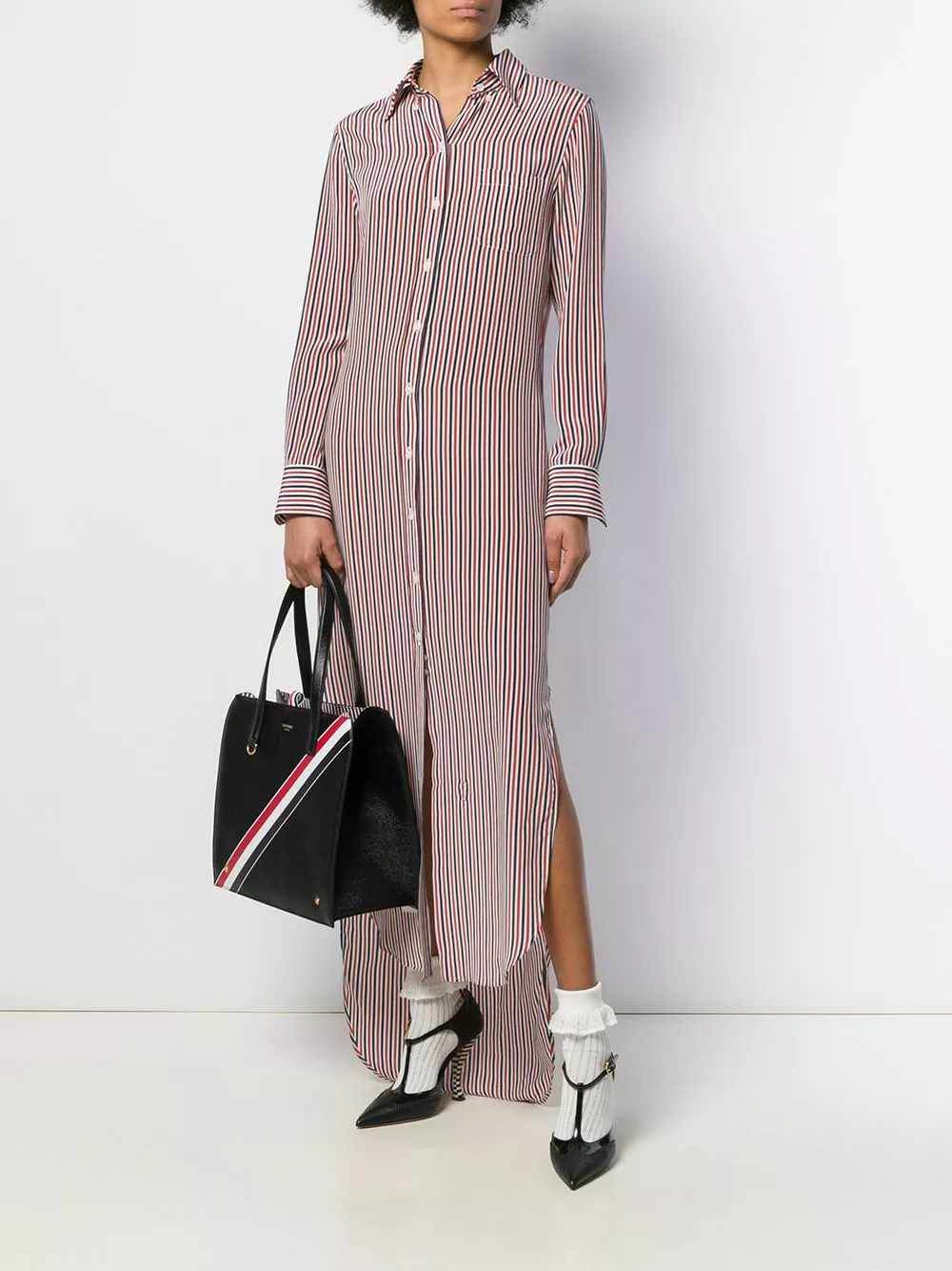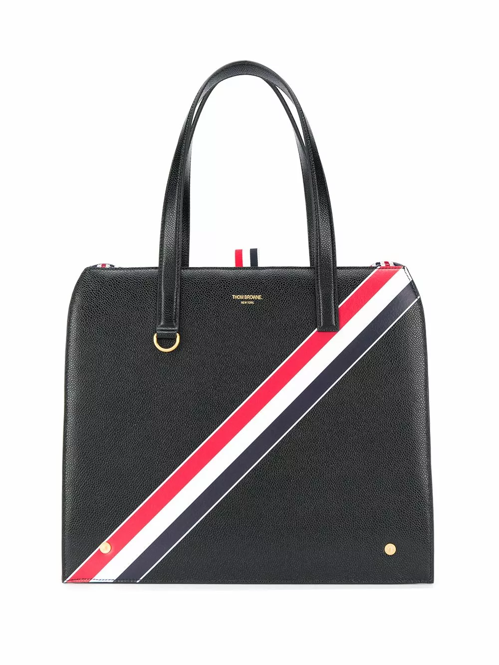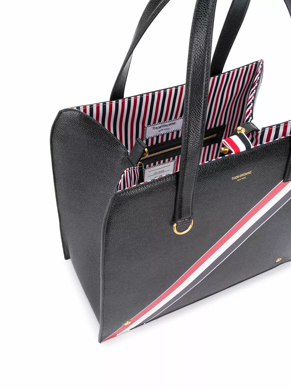 Swap a classic black tote in favour of this fun striped style from Thom Browne. Sporting a pebble grain finish, this black calf leather Mrs Thom tote from is finished with a navy, red and white diagonal striped trim. Embrace stripes. Featuring round top handles, a signature tri-colour striped trim, a front embossed logo stamp, an internal zipped pocket and a pebbled leather texture.