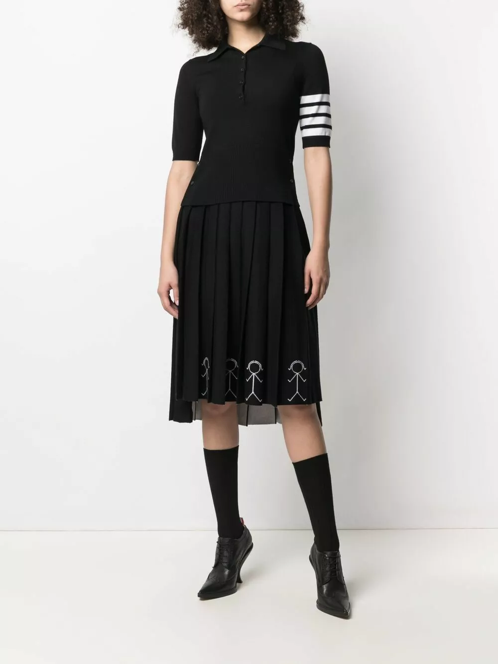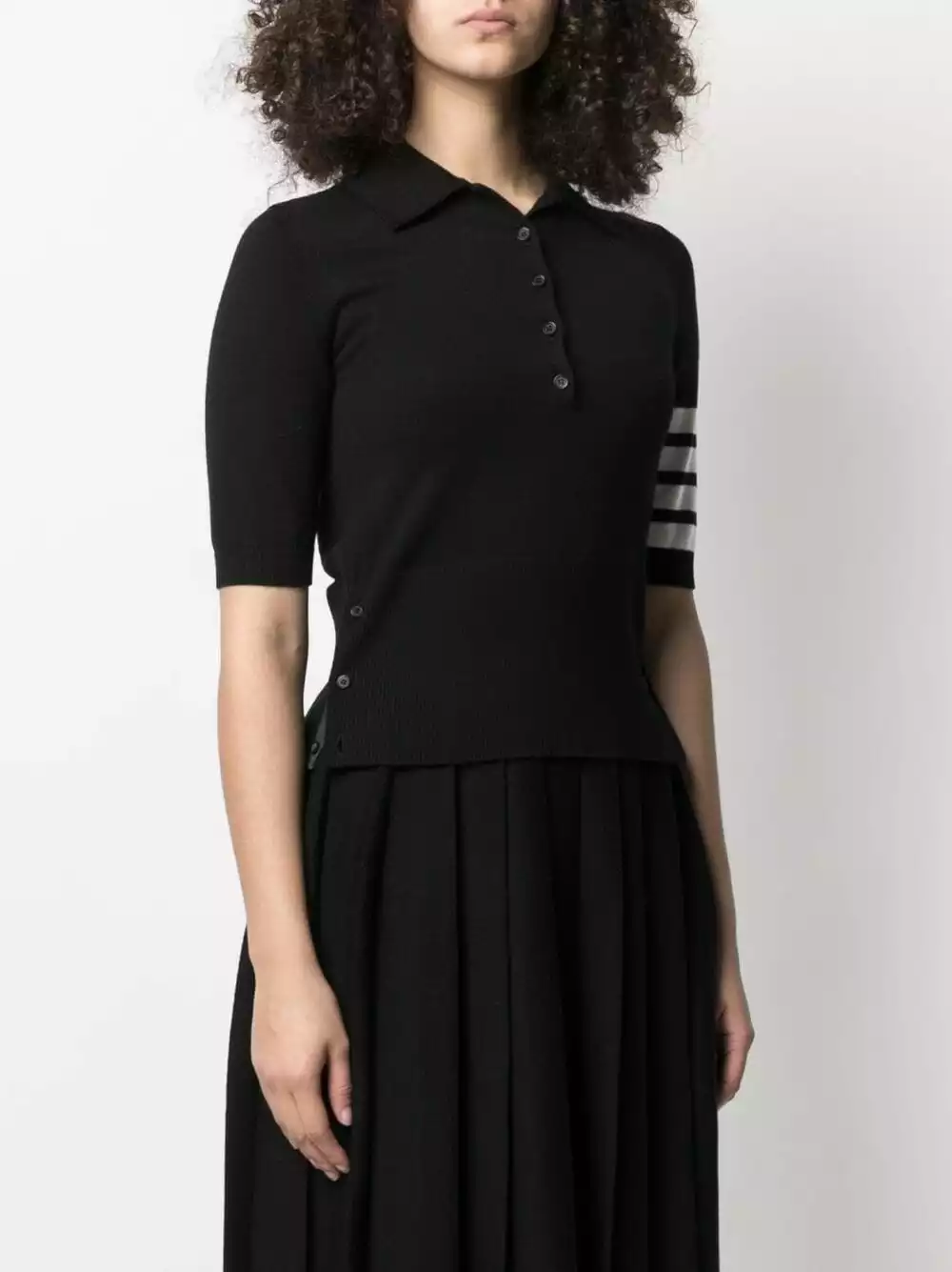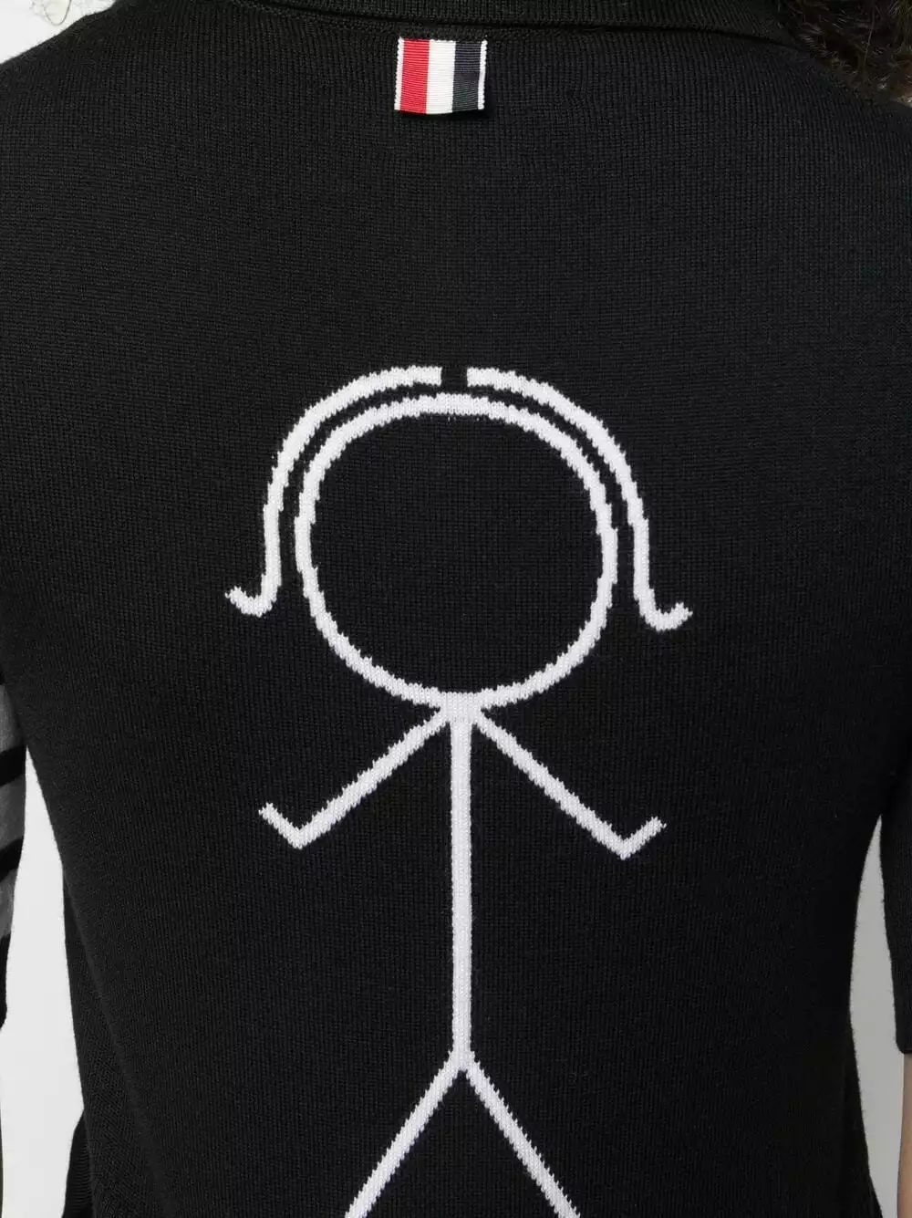 Mrs. Thom has entered the scene. Not only is this polo shirt made from merino wool, but it features two brand signatures in the form of the four stripes and grosgrain loop tab. As well as a charming ‘portrait’ of the star of the show to the rear.