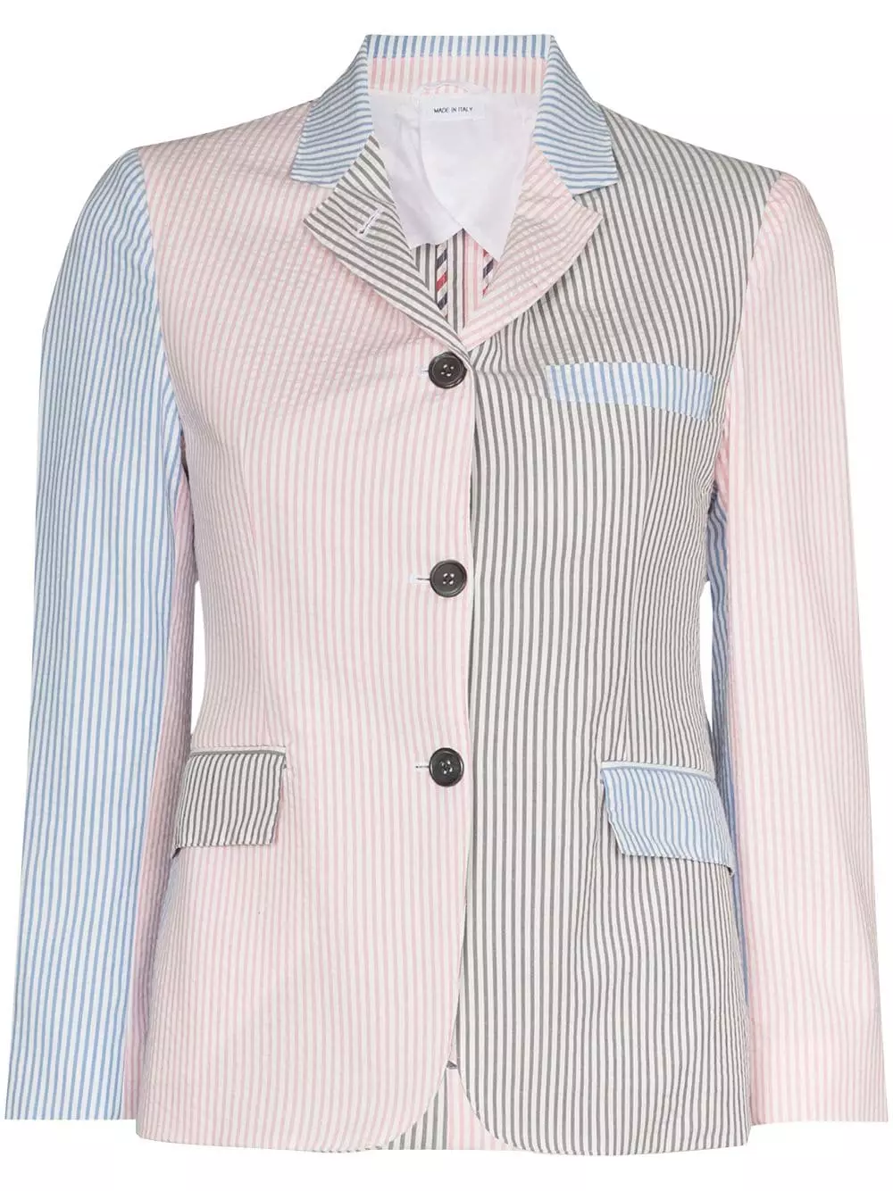 Tailoring with a twist. This blazer from Thom Browne is all you need to ensure your wardrobe is filled with timeless and iconic pieces, thanks to the patchwork pinstripe design. Sophistication is key.
