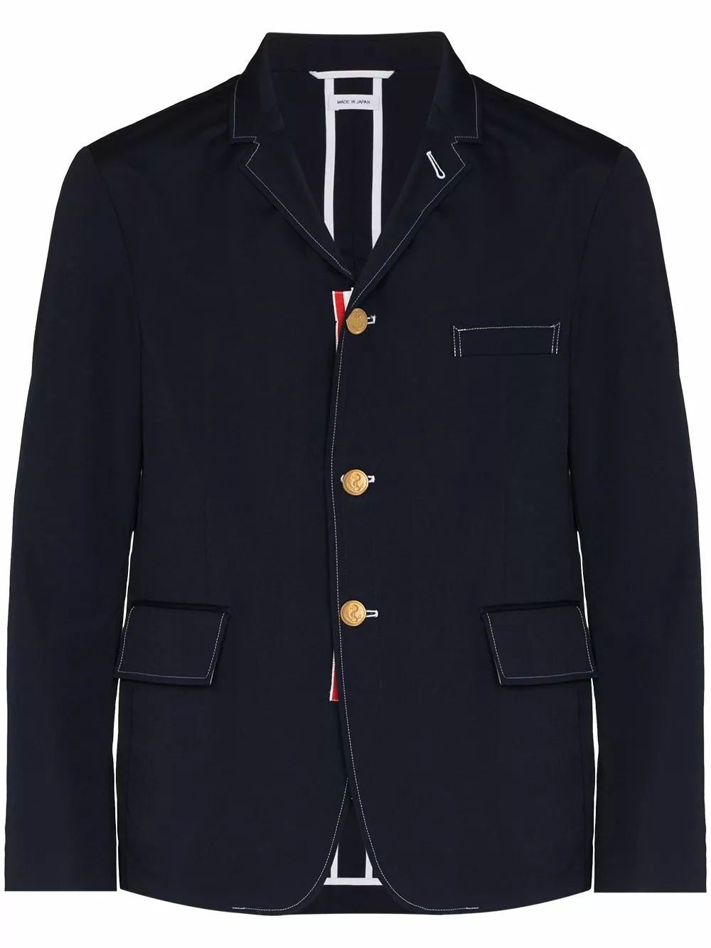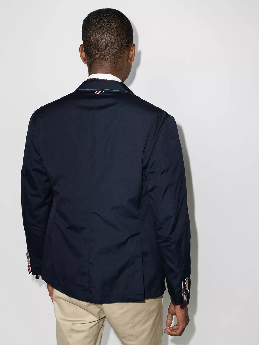 Featuring Thom Browne’s signature detailing of the grosgrain loop tab at the rear of this single-breasted blazer and RWB stripe on the inner lapel, it creates an instantly recognisable design. Such elements as these create a balance between technical tailoring and design flair which fulfill the brand’s aim of creating ‘a new expression of the suit’.