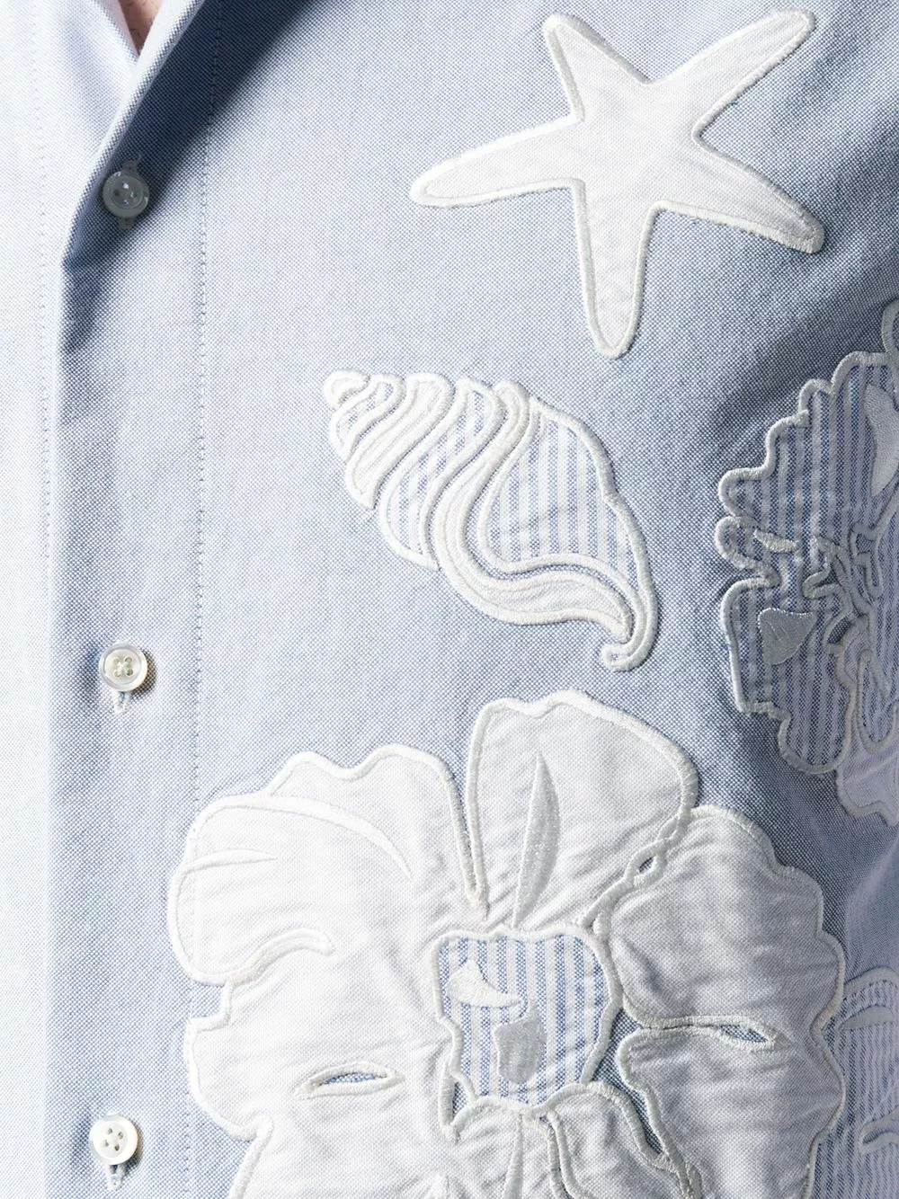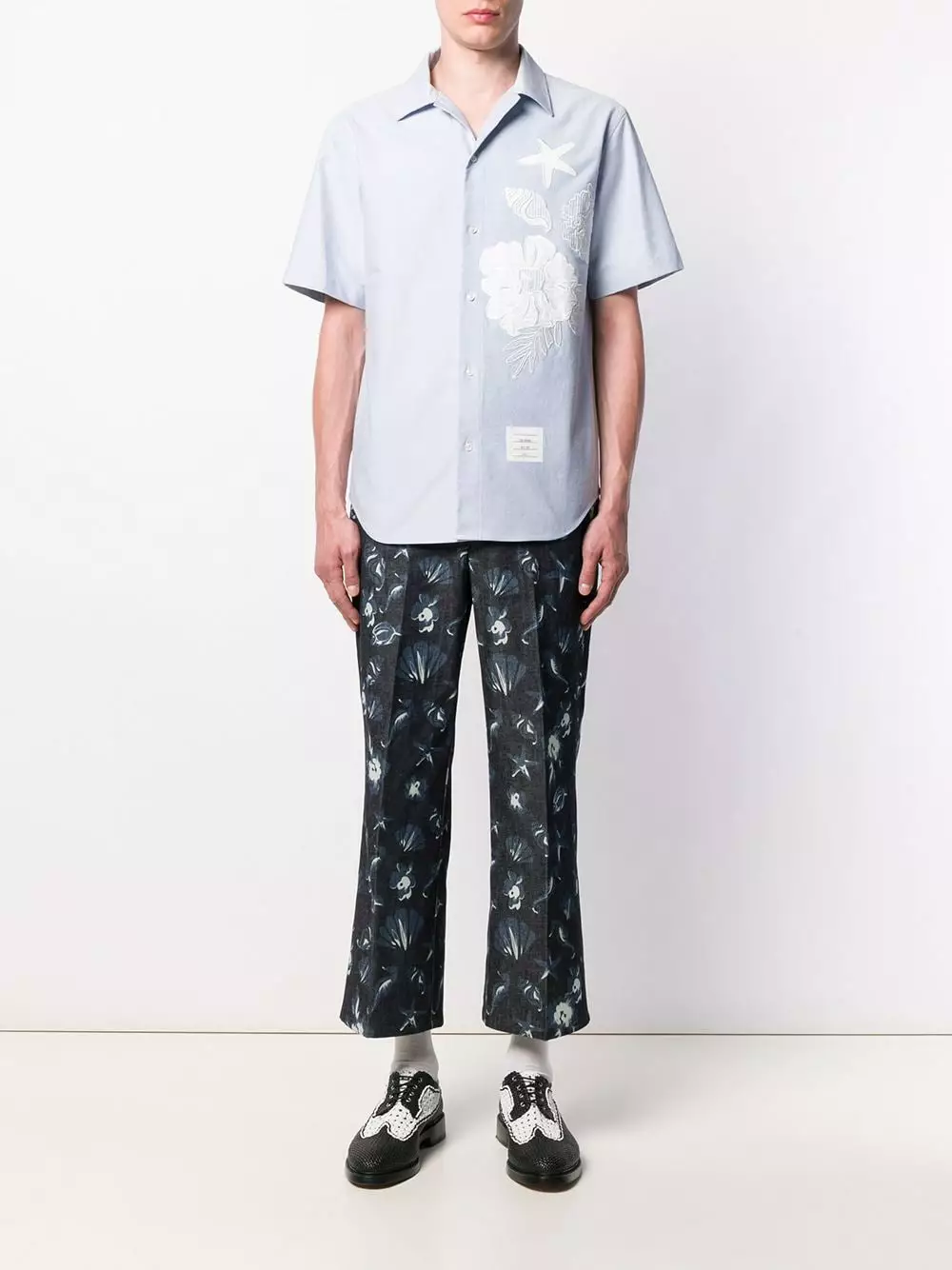 Thom Browne produces new takes on men’s fashion with creative prints and cuts. This light blue ocean floor appliqué shirt from Thom Browne features a classic collar, a front button fastening, short sleeves and a relaxed fit.