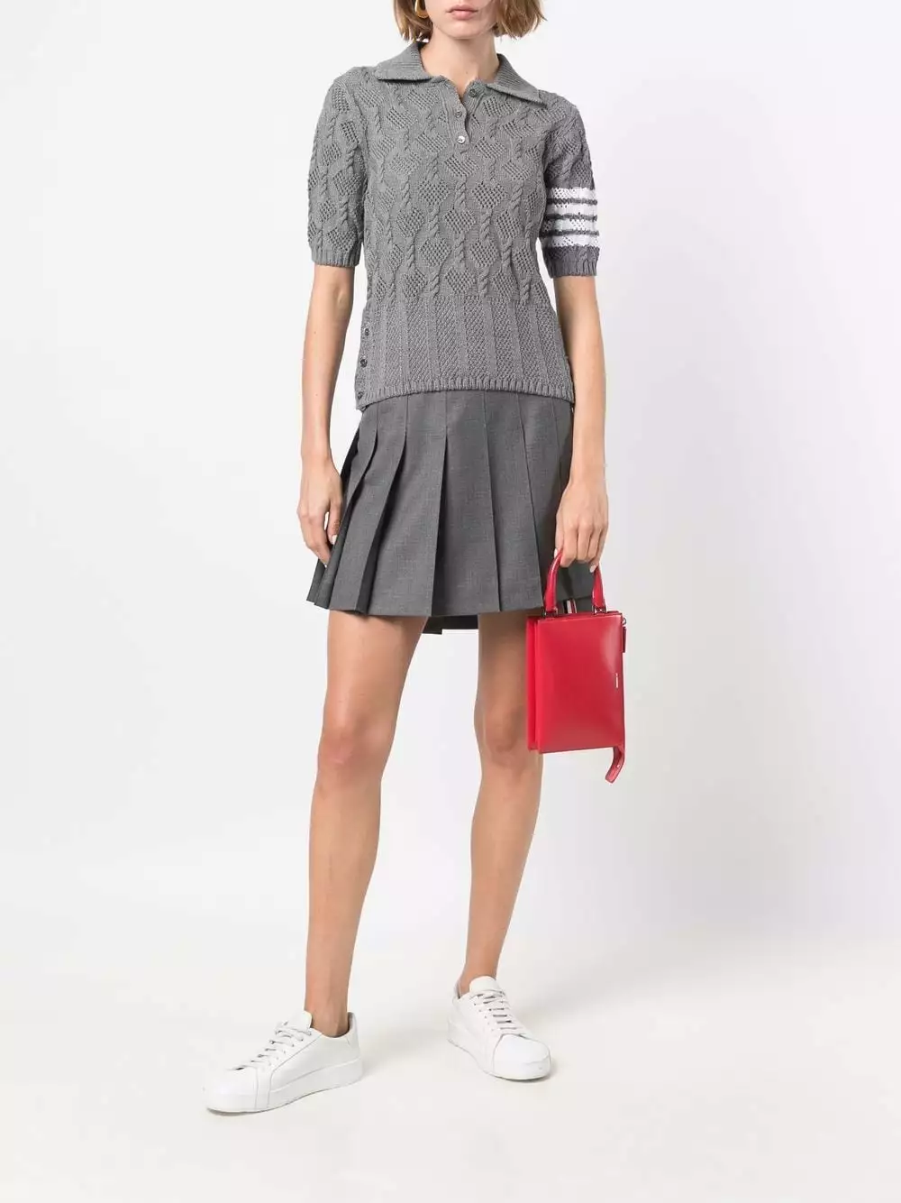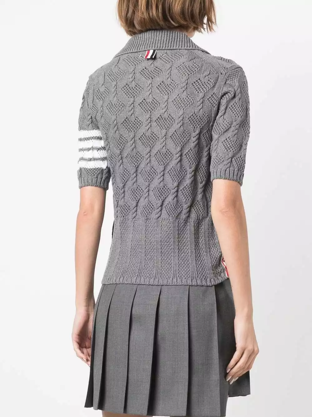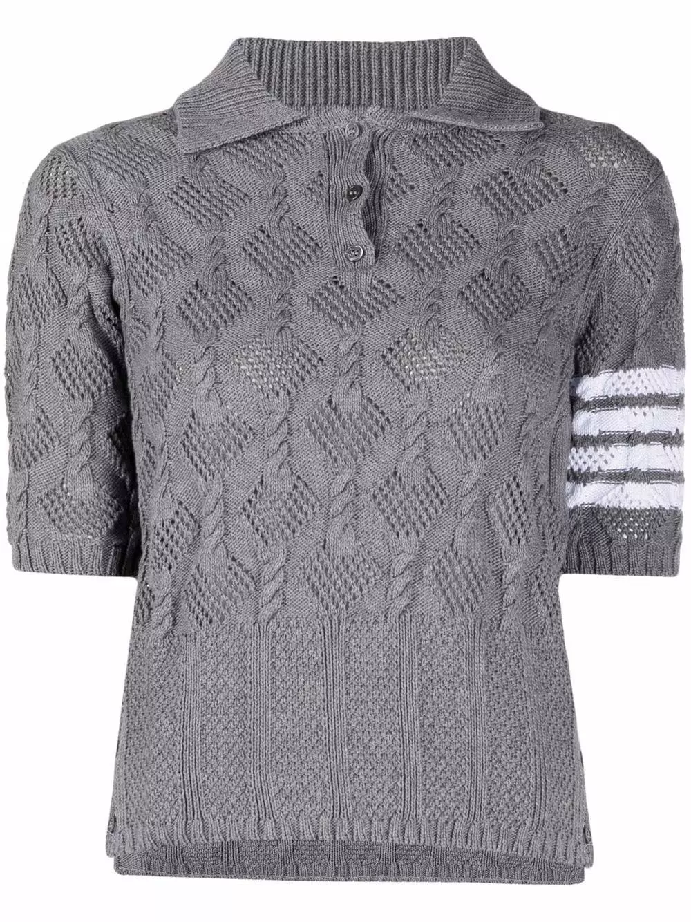 Earn your stripes, with this white, cotton knit polo shirt from Thom Browne. The contemporary piece features an open knit, polo collar, front button fastening, short sleeves and signature 4-Bar stripe. Are you up to the bar?
