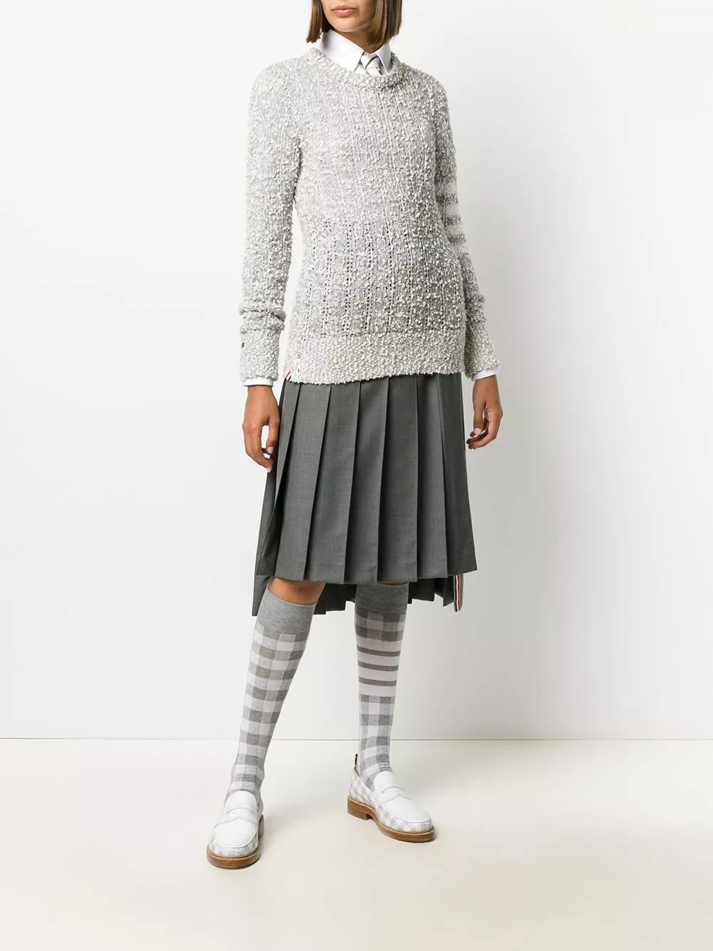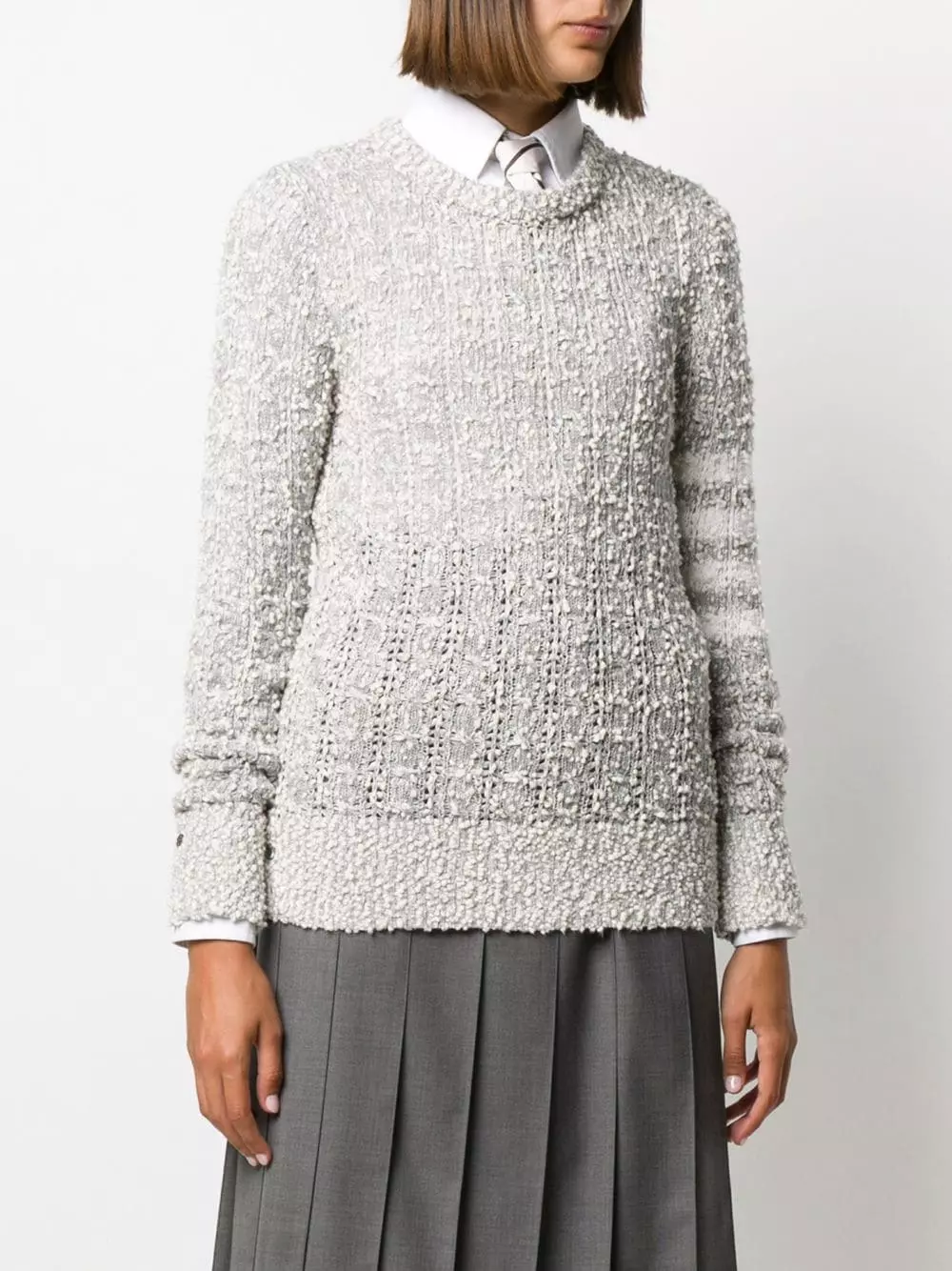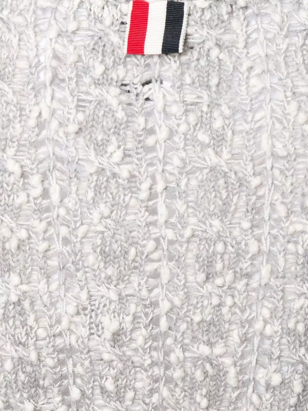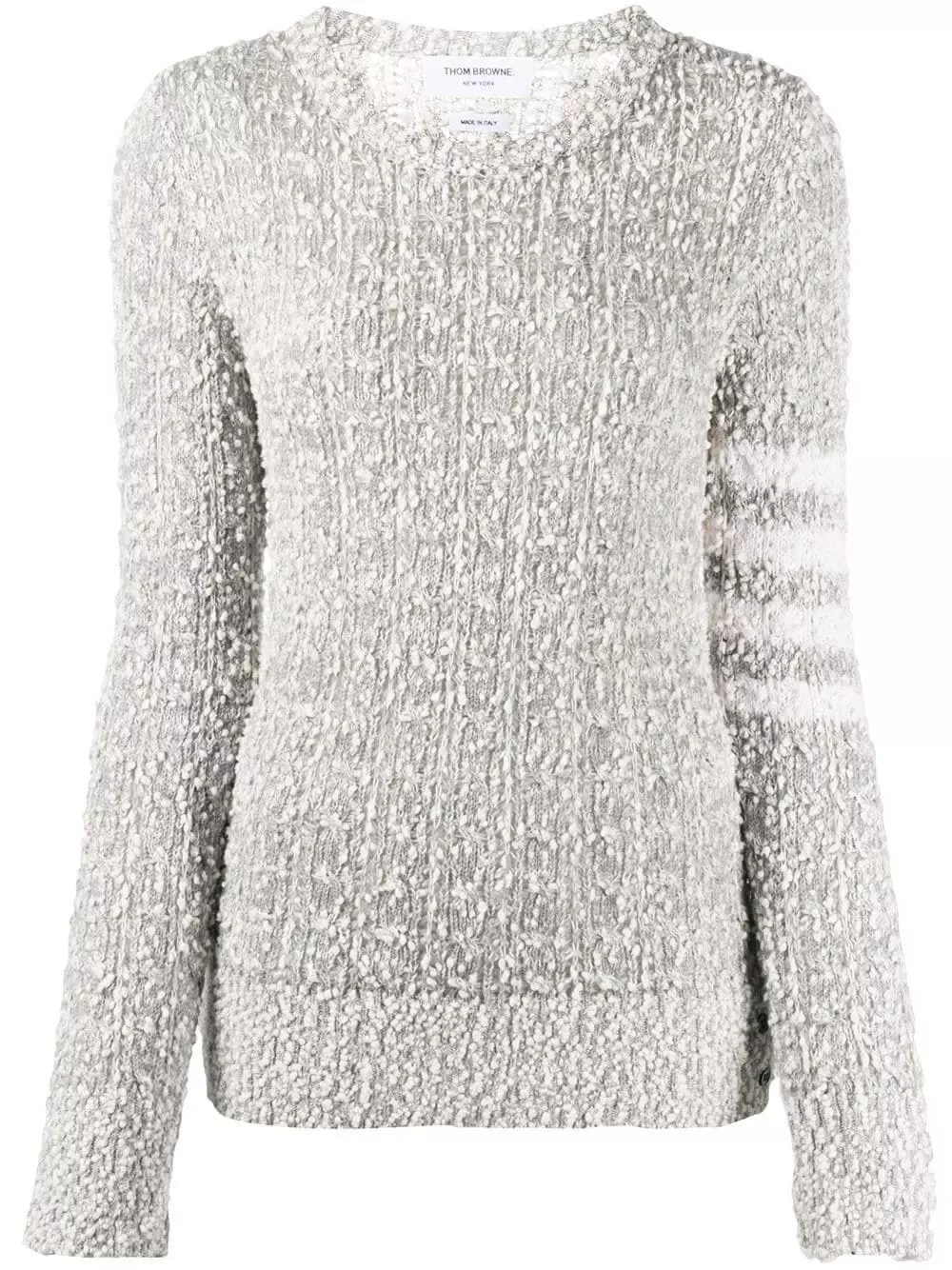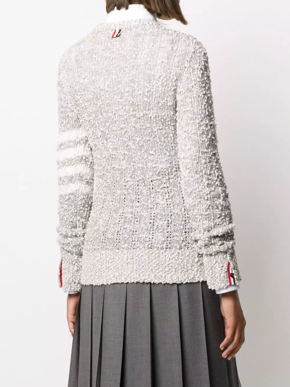 You can’t beat a classic, but Thom Browne knows how to make it contemporary. Featuring an open tuck stitch with cables, long sleeves and signature 4-Bar stripe. It’ll be a warm welcome to your wardrobe.Â