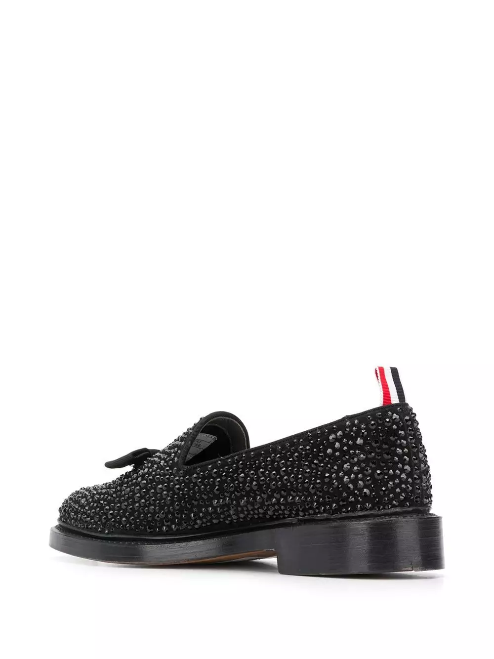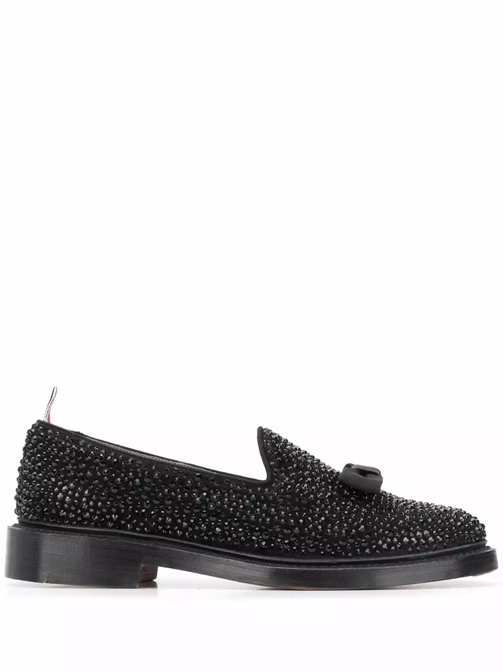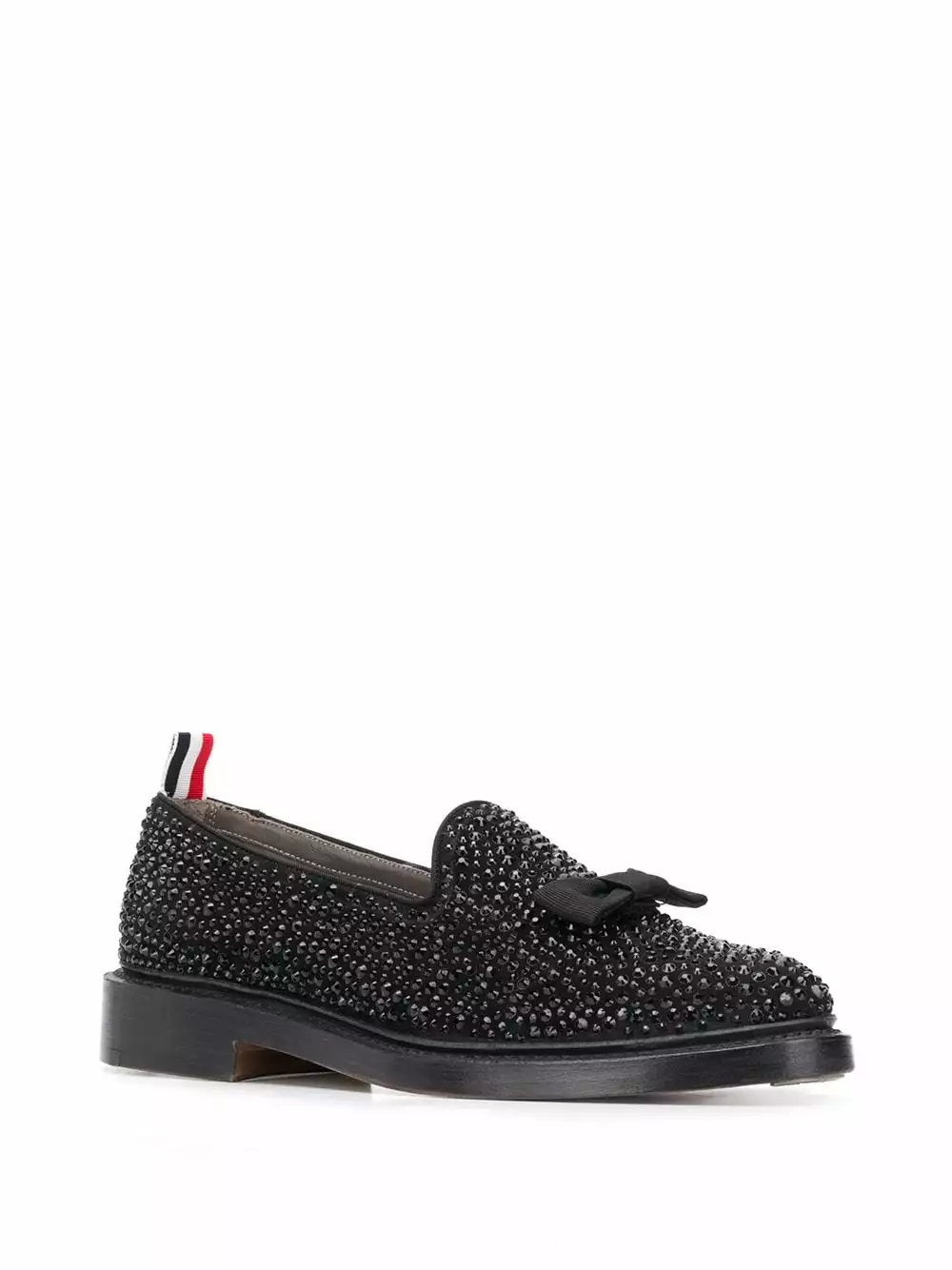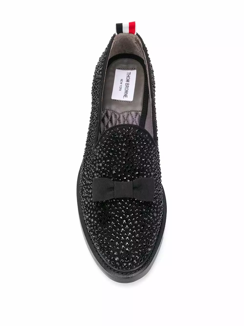 Going somewhere nice? You’d better be in these goatskin Opera bow appliqué embellished loafers from Thom Browne. They deserve to be worn at only at the finest of occasions. Featuring crystal embellishments, a bow ribbon and an RWB tab.