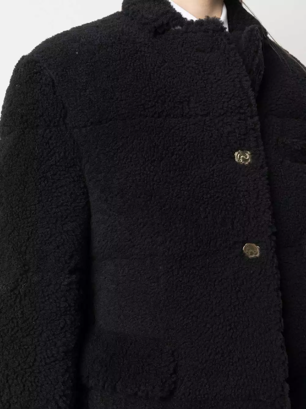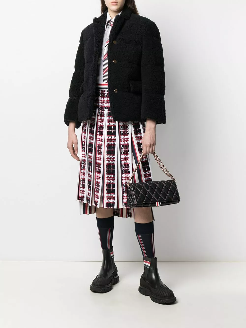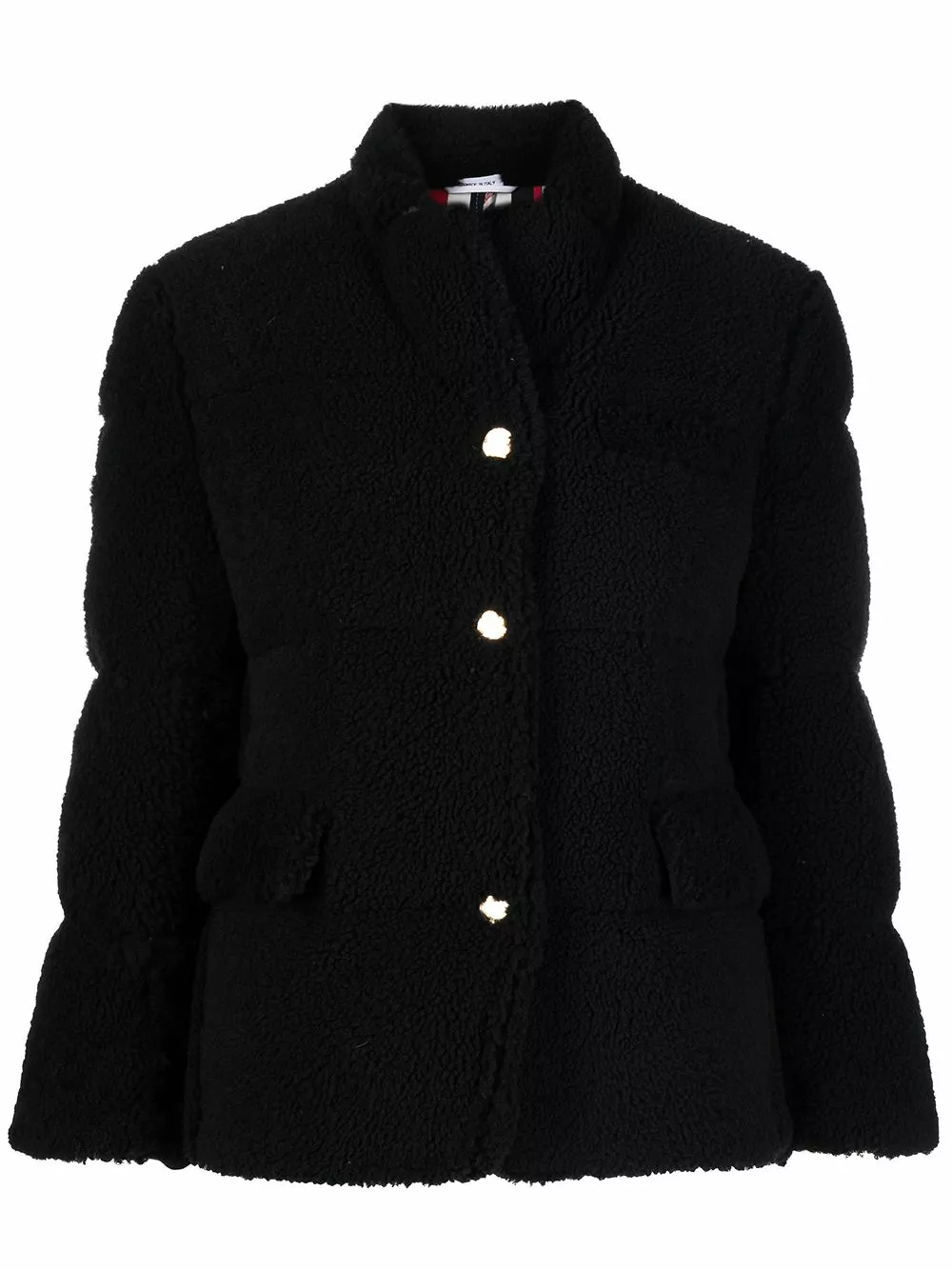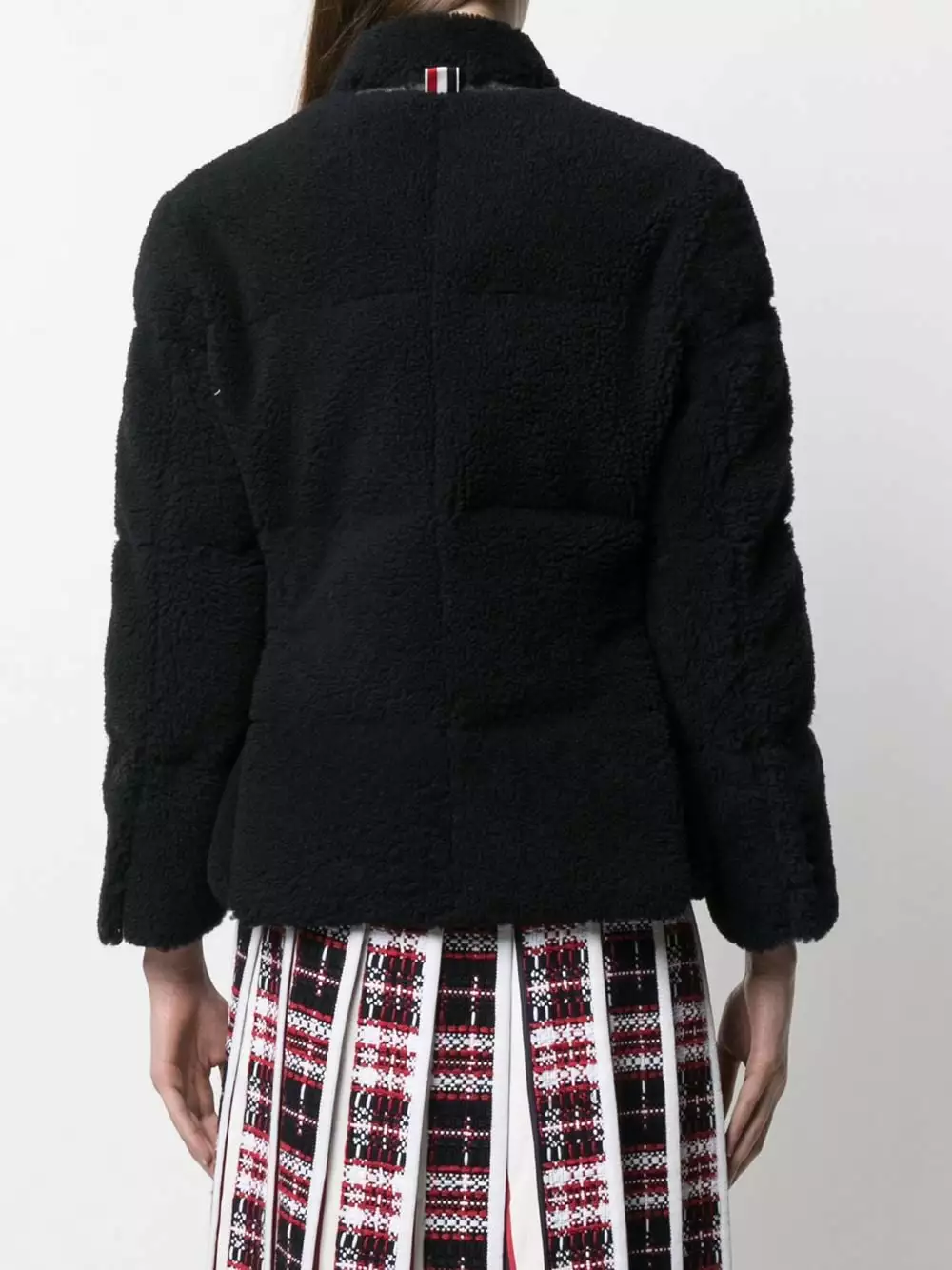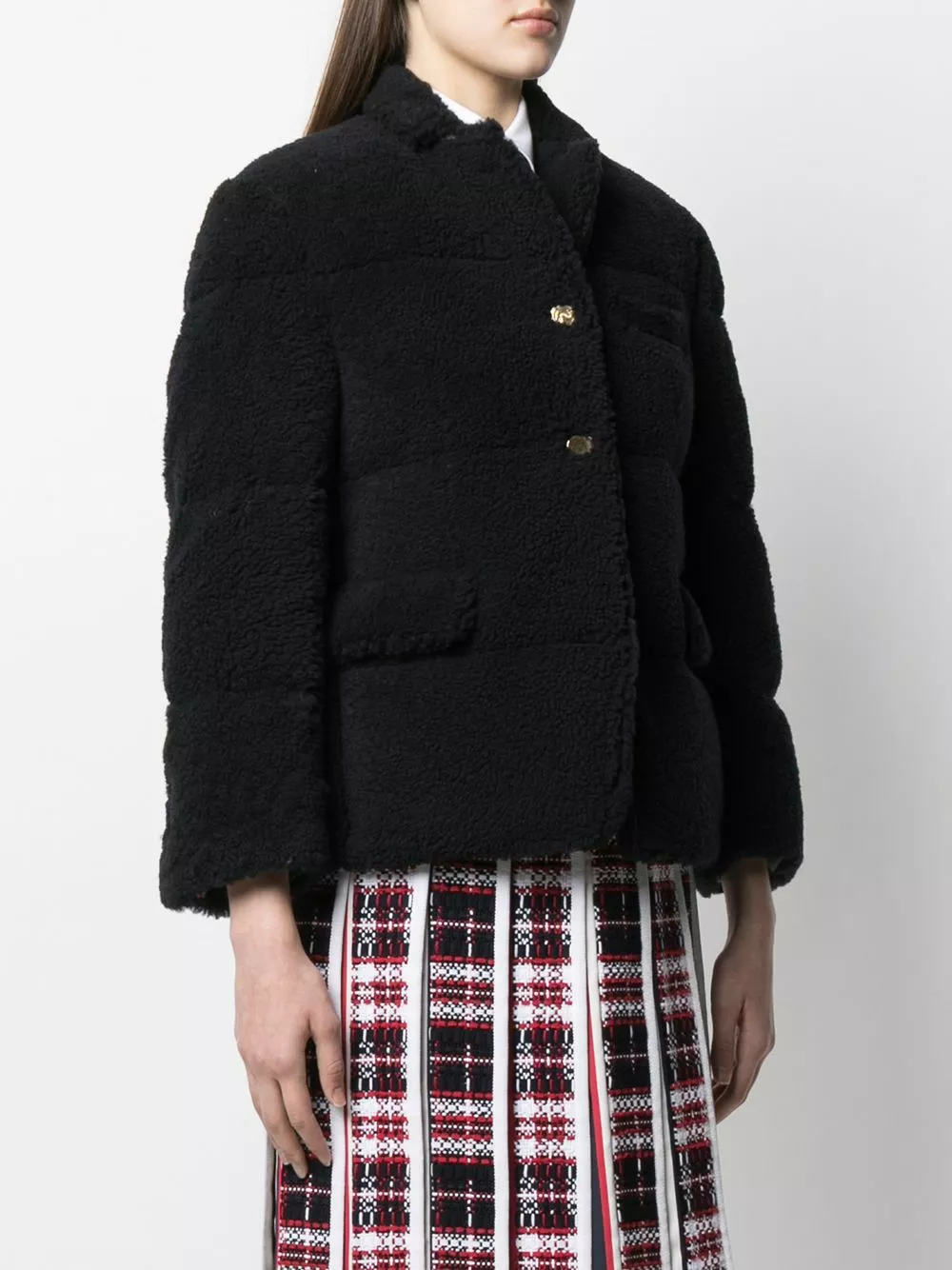 Impeccable tailoring for every situation. Crafted from shearling, this padded sport coat from Thom Browne was designed to keep you warm without sacrificing sartorial elegance. Anytime, anywhere.