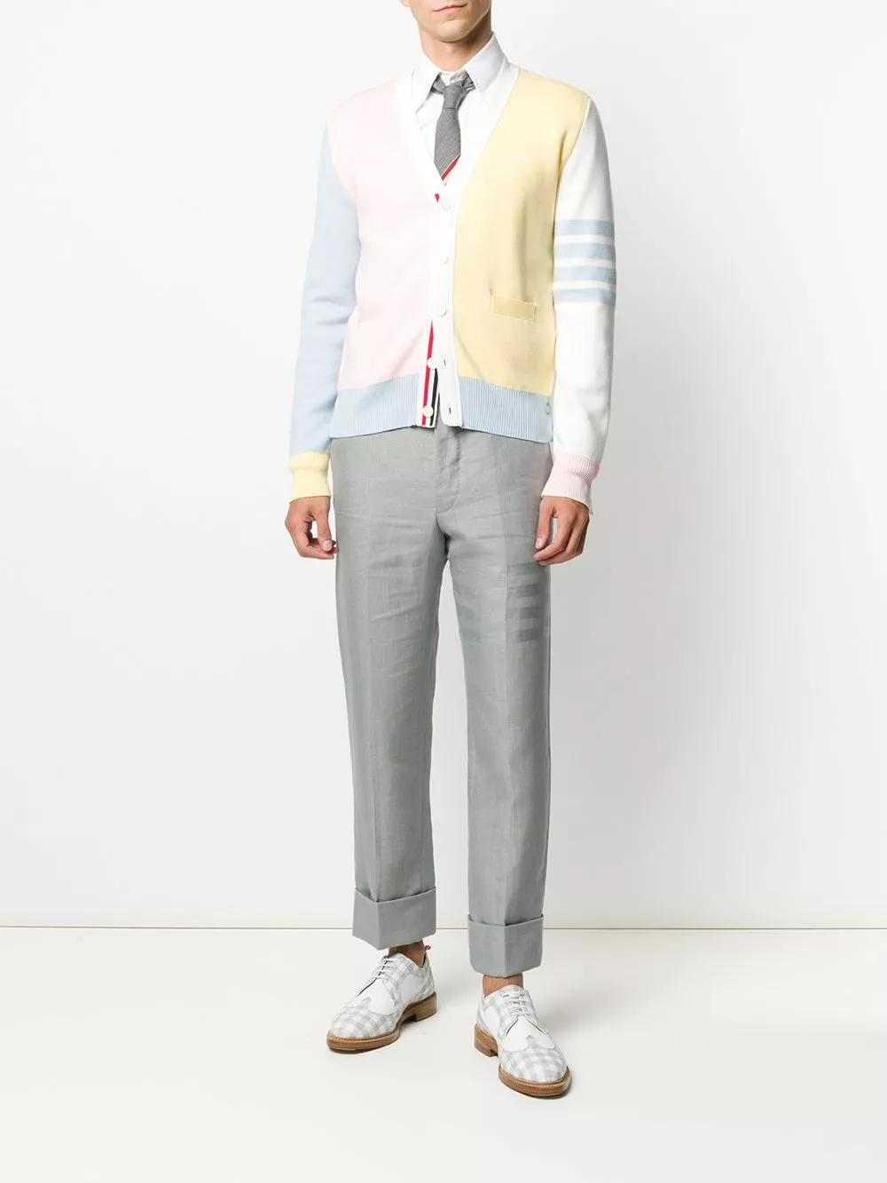 Pure pastel perfection. This cotton knit cardigan from Thom Browne features side stripe detail, v-neck, front button fastening and pastel colour palette. For those in touch with their feminine side.