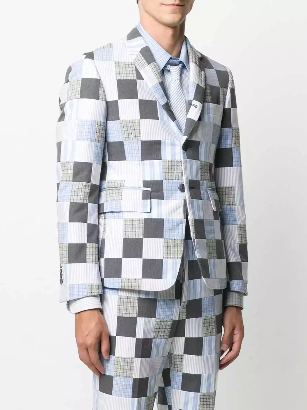 You’re known for your style. And this patchwork-pattern blazer from Thom Browne easily lives up to that. Keep all eyes on you. Featuring notched lapels, a patchwork design, a broad welt chest pocket, a front button fastening, front flap pockets, long sleeves, button cuffs, a signature grosgrain loop tab and RWB stripes.