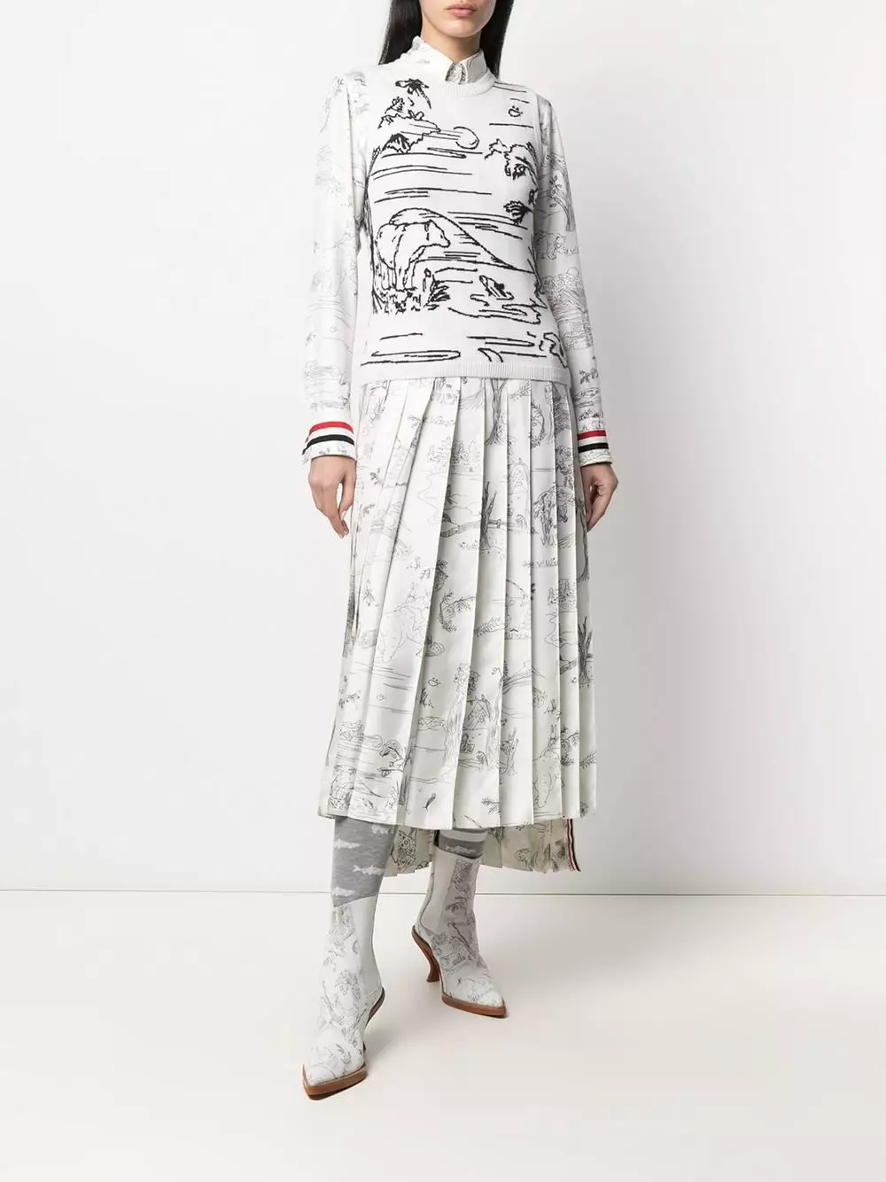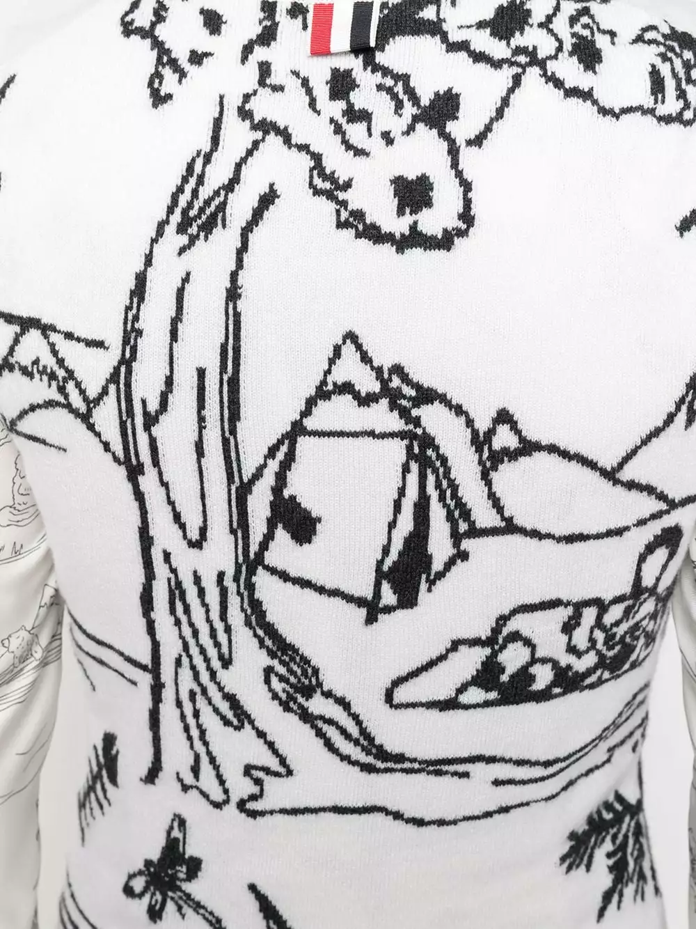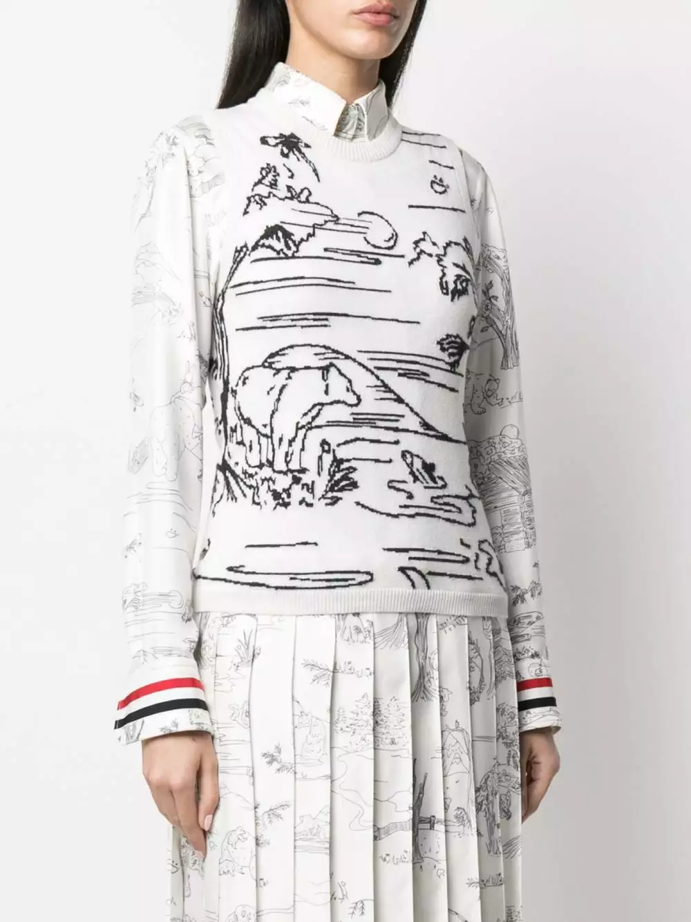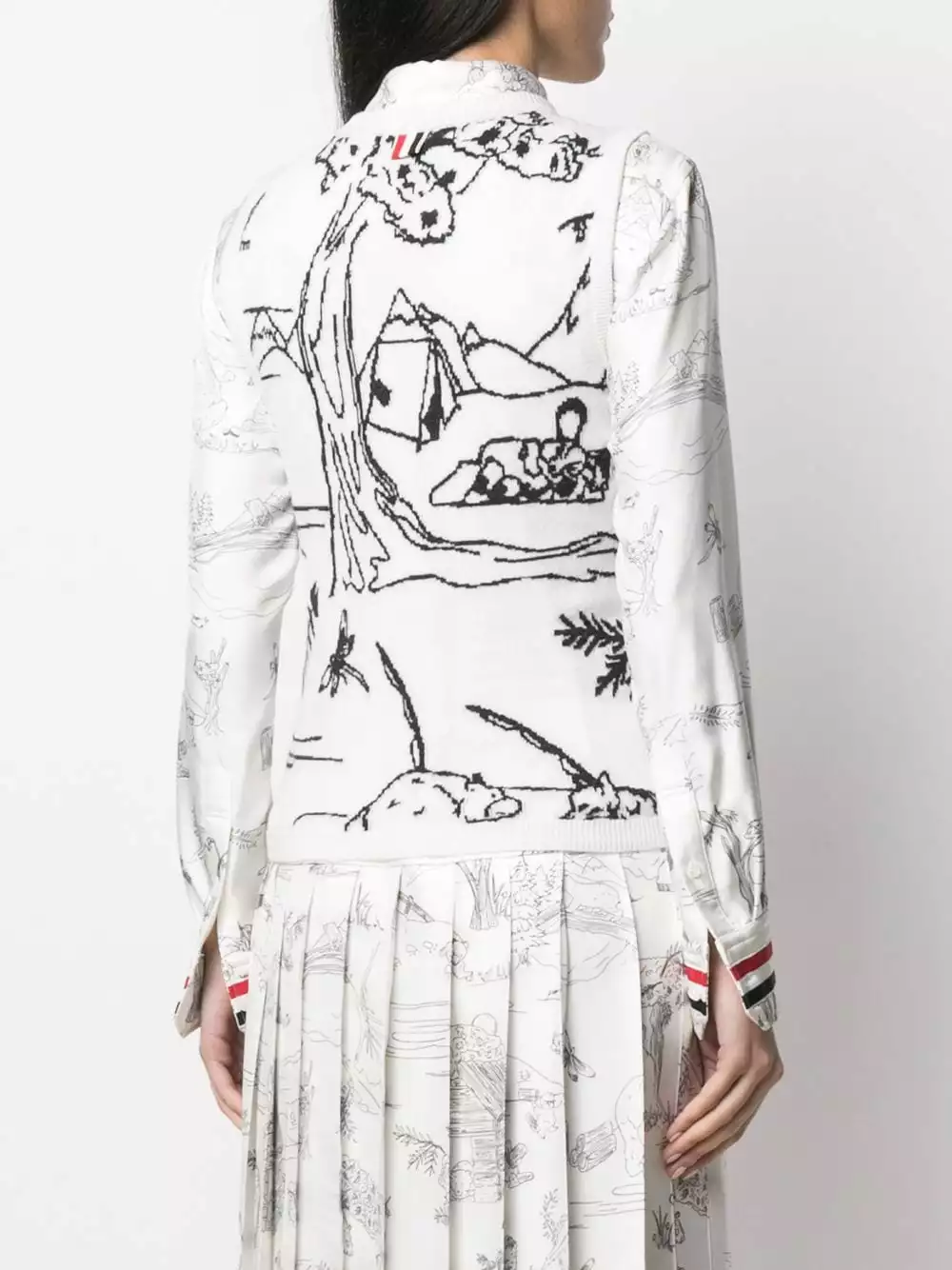 Set your sights on an intarsia knit oasis. Thom Browne sets the scene with this knitted sleeveless sweater vest. It’s a wearable wonderland.