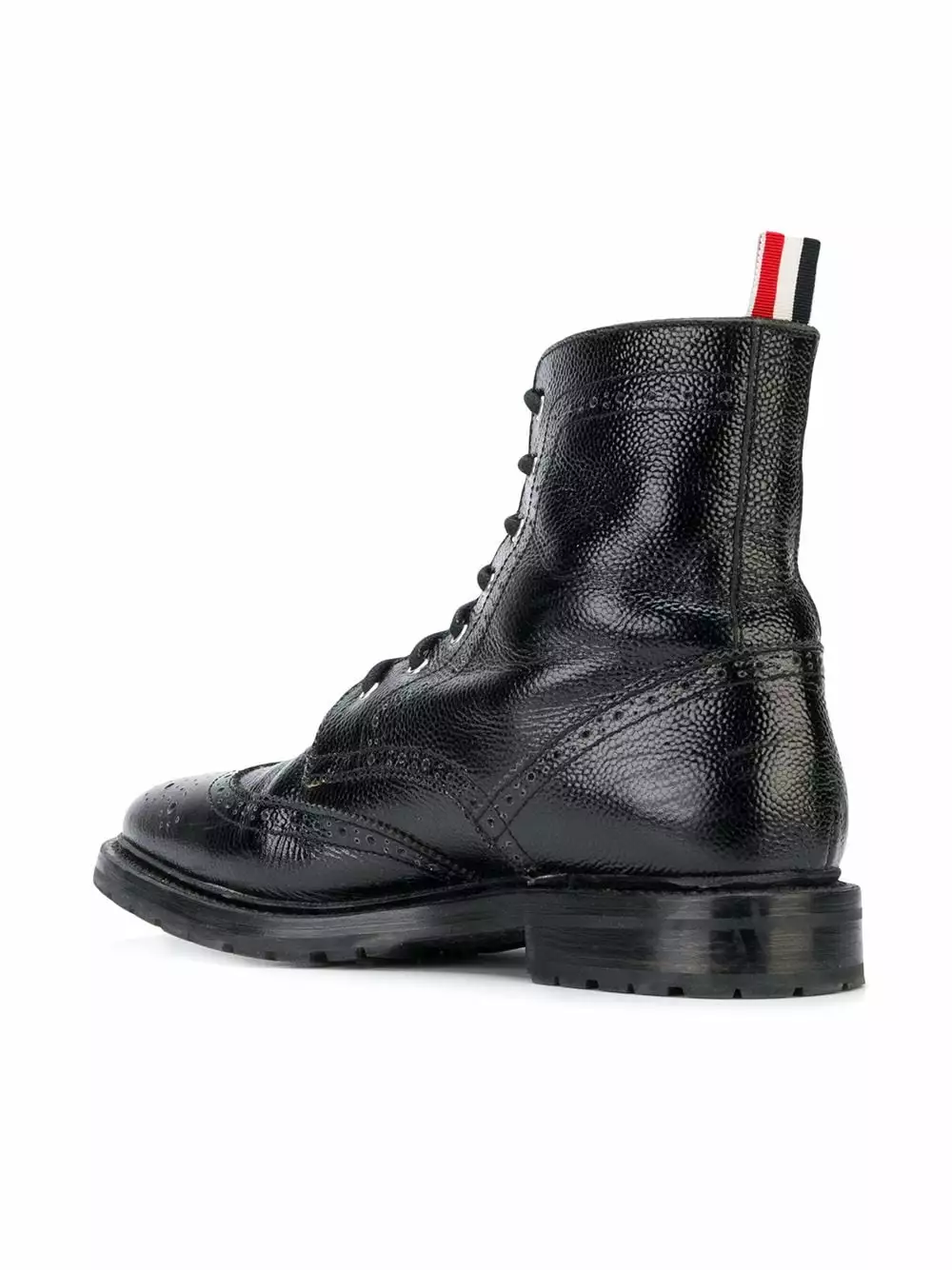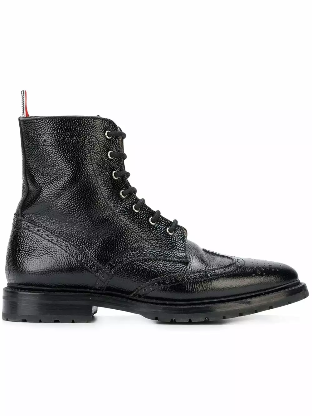 Black Pebble Grain Wingtip Boot from Thom Browne featuring a mid-calf length, an almond toe, a lace-up front fastening, a pull tab at the rear, a flat rubber sole, punch hole detailing and a chunky sole.